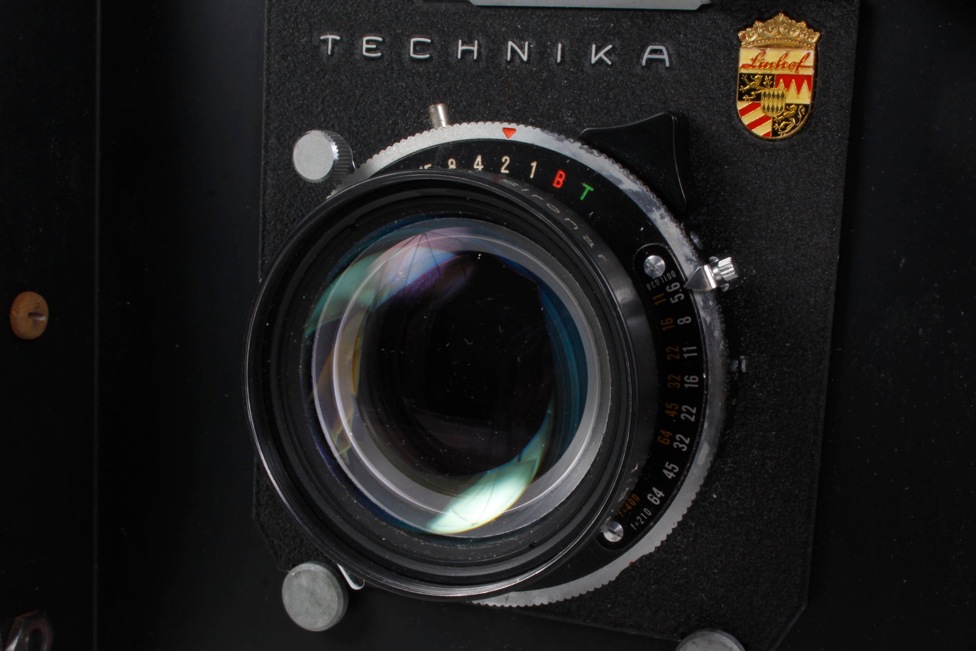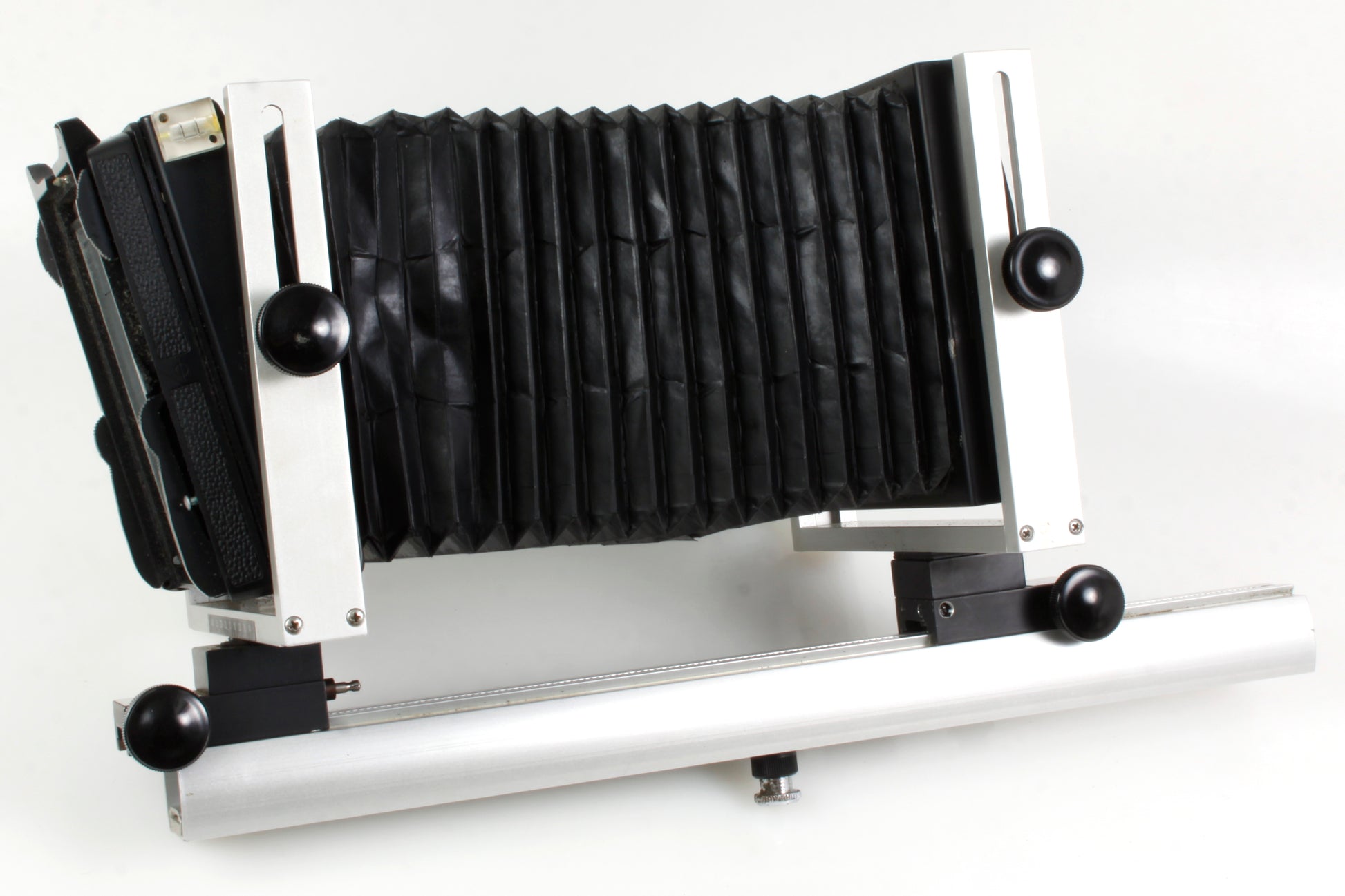 Linhof Kardan Standard 4x5 large format camera on monorail with Rodenstock Sironar 1:5.6 210mm lens. In working order, the shutter seems to be firing fine on all settings, although it has not been tested with film or for accuracy. There looks to be some dust and haze present to the lens but no fungus or scratches. Cosmetically the camera and rail are in good vintage condition with some general signs of use but no obvious major damage. No visible holes or tears to the bellows. Movement along the rail is smooth.