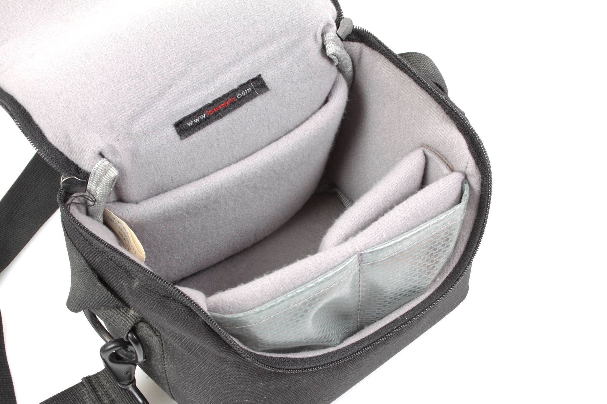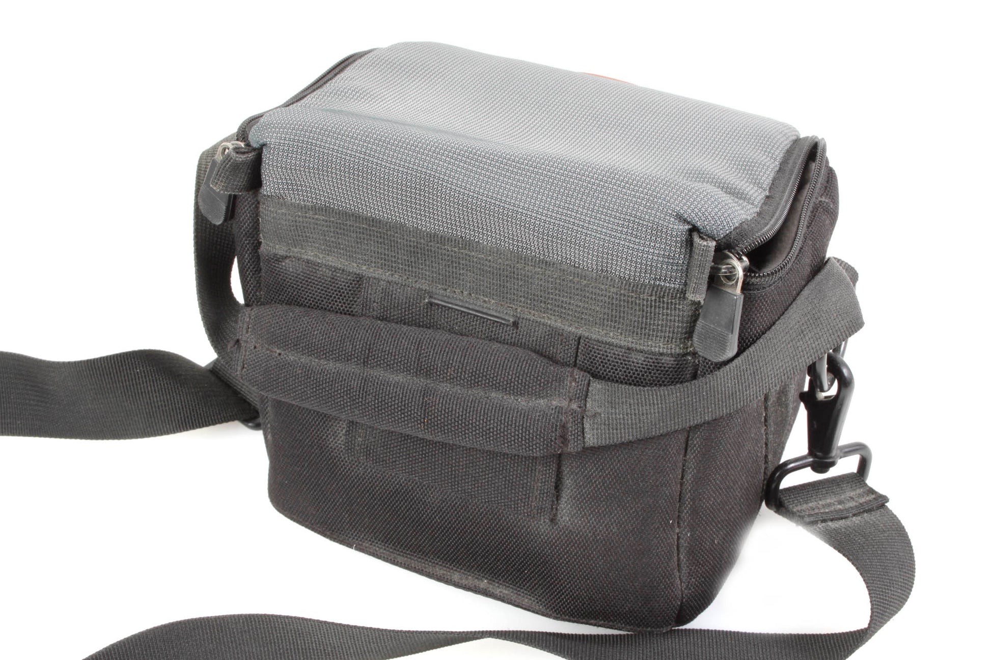 7 X 5 X 6 inch camera bag with one main pocket. Main pocket is cushioned and clean with one Velcro divider and sleeves. Bag has a long shoulder strap.