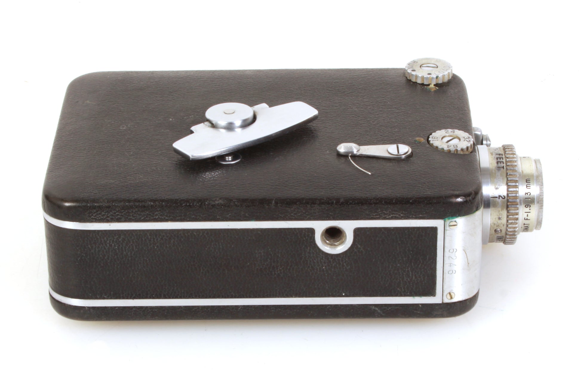 Magazine Cine-Kodak Eight Model 90 camera with f-1.9 13mm lens. Looks to be in working order - the motor is working on all settings, although it has not been tested with film or for accuracy. Cosmetically the camera is in good vintage condition with some general signs of age and use, some corrosion to some metal parts. There looks to be some dust and haze present to the lens but no scratches. There is some dust and haze present to the viewfinder but no cracks. Sold as is.