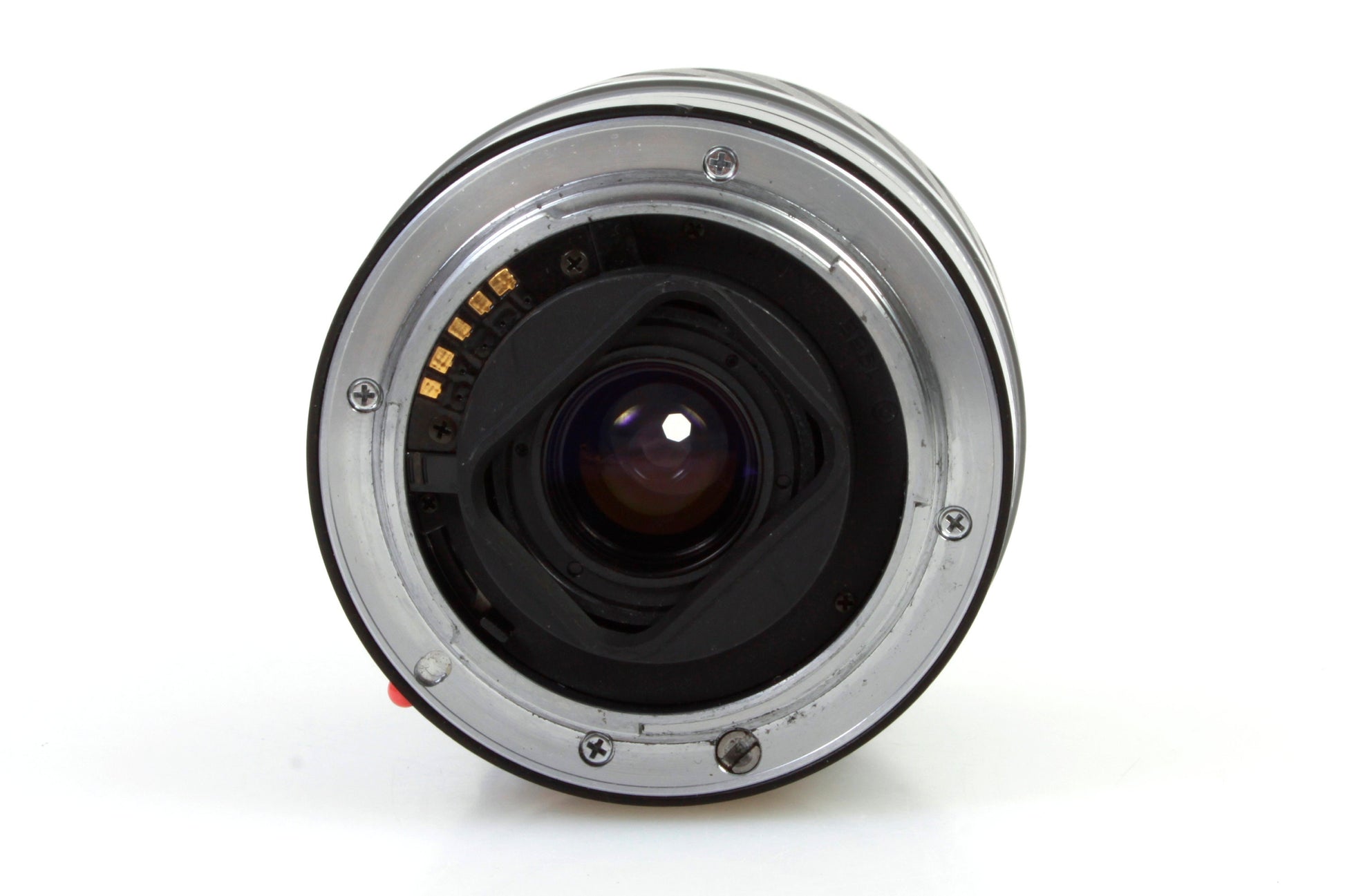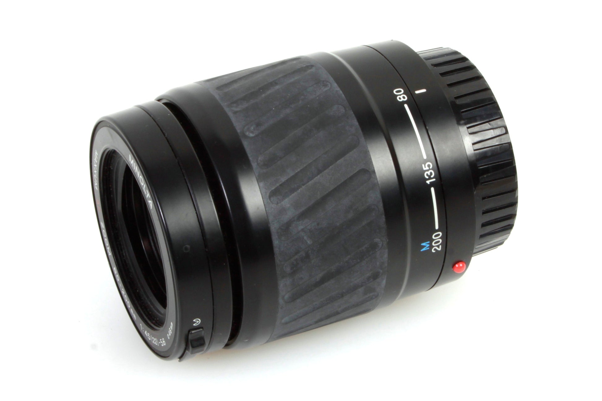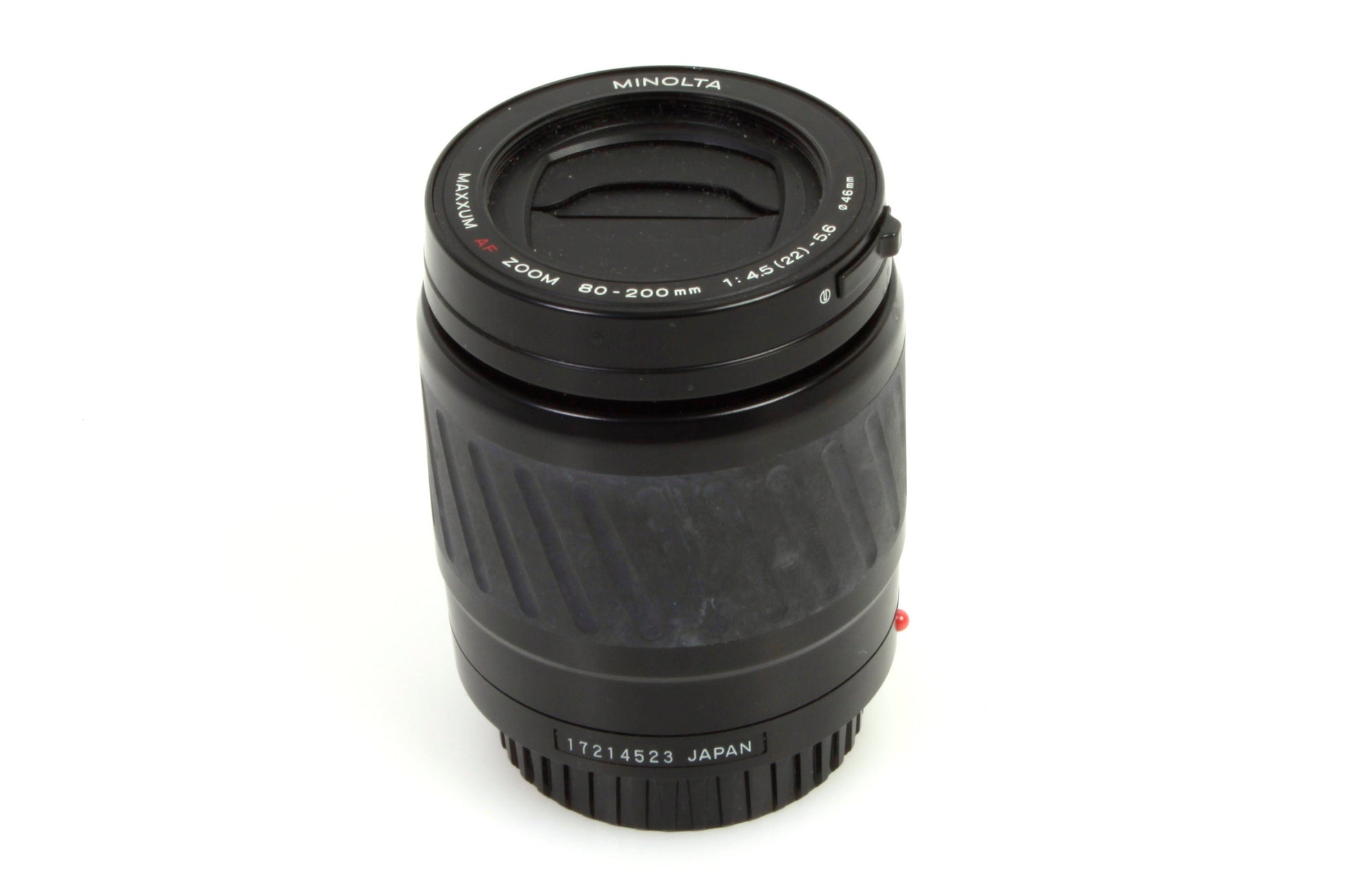 Minolta Maxxum AF Zoom 80-200mm 1:4.5(22)-5.6 lens. There is some light dust and haze present to the lens but no scratches. The barrel is in good condition with some light marks/scratches and there is some whitening to the rubber panel. The retractable front lens cover is working fine. Comes with rear lens cap.