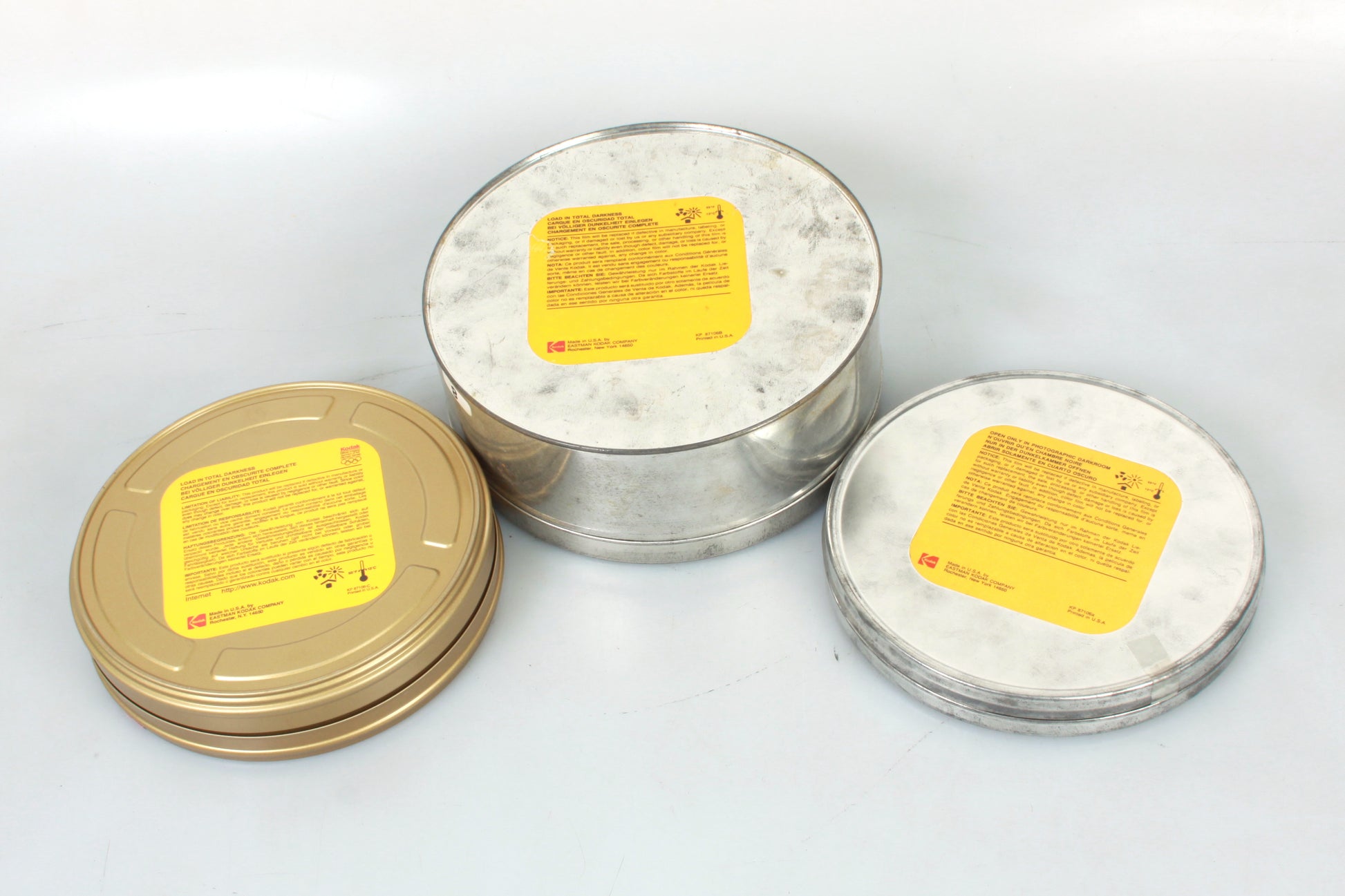 LOT OF THREE EMPTY METAL FILM CANS. THE 7248 16MM CAN MEASURES APPROXIMATELY 7 1/4 INCHES DIAMETER AND 1 INCH DEEP. THE 5279 35MM CAN MEASURES APPROXIMATELY 7 1/8 INCHES DIAMETER AND 1 3/4 INCHES DEEP. THE LARGE CAN MEASURES APPROXIMATELY 8 INCHES DIAMETER AND 3 1/8 INCHES DEEP. THEY ARE VINTAGE ITEMS AND SHOW SIGNIFICANT WEAR AND TEAR, AND SOME AREAS OF RUST. SOLD AS IS.
