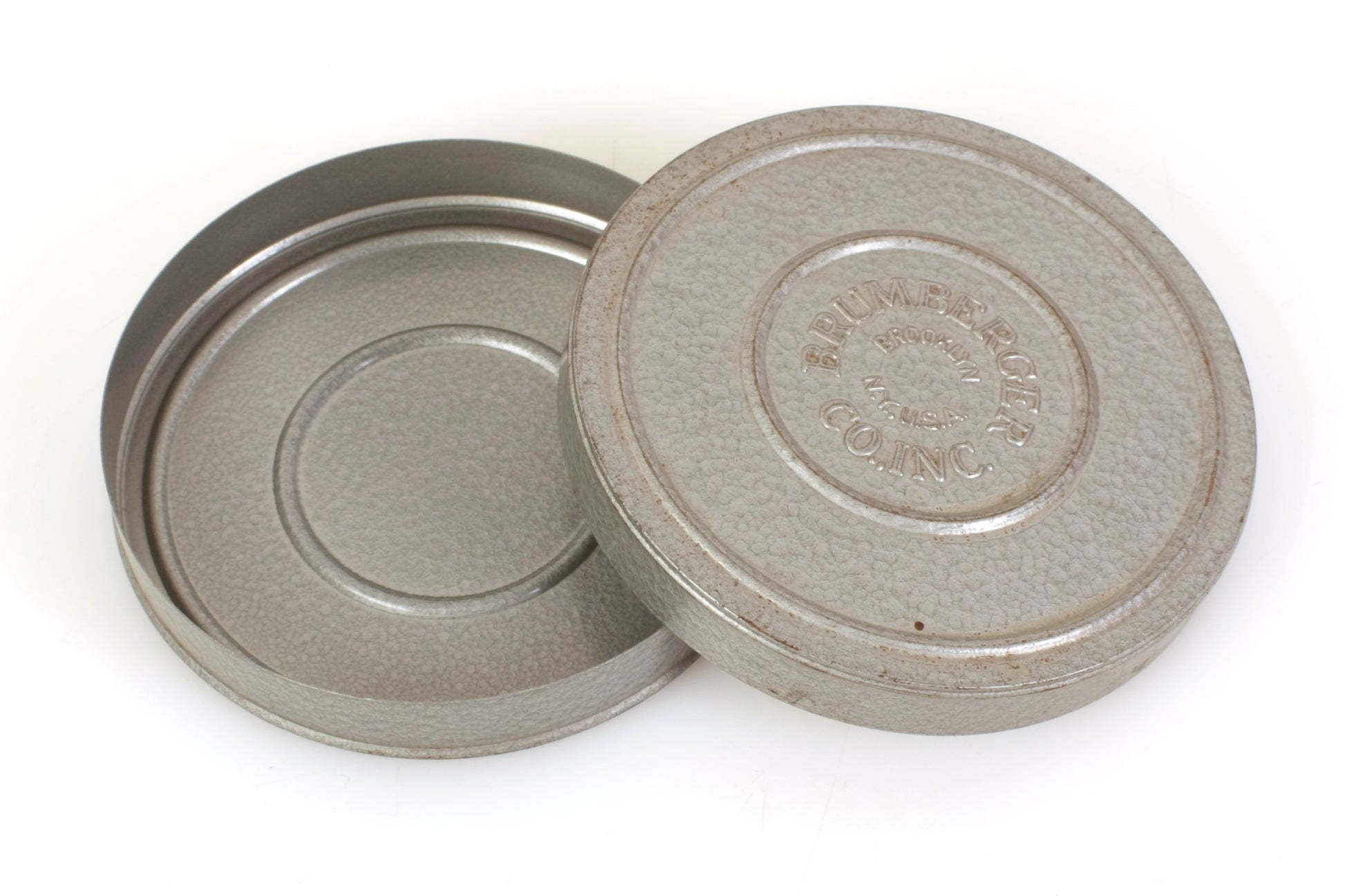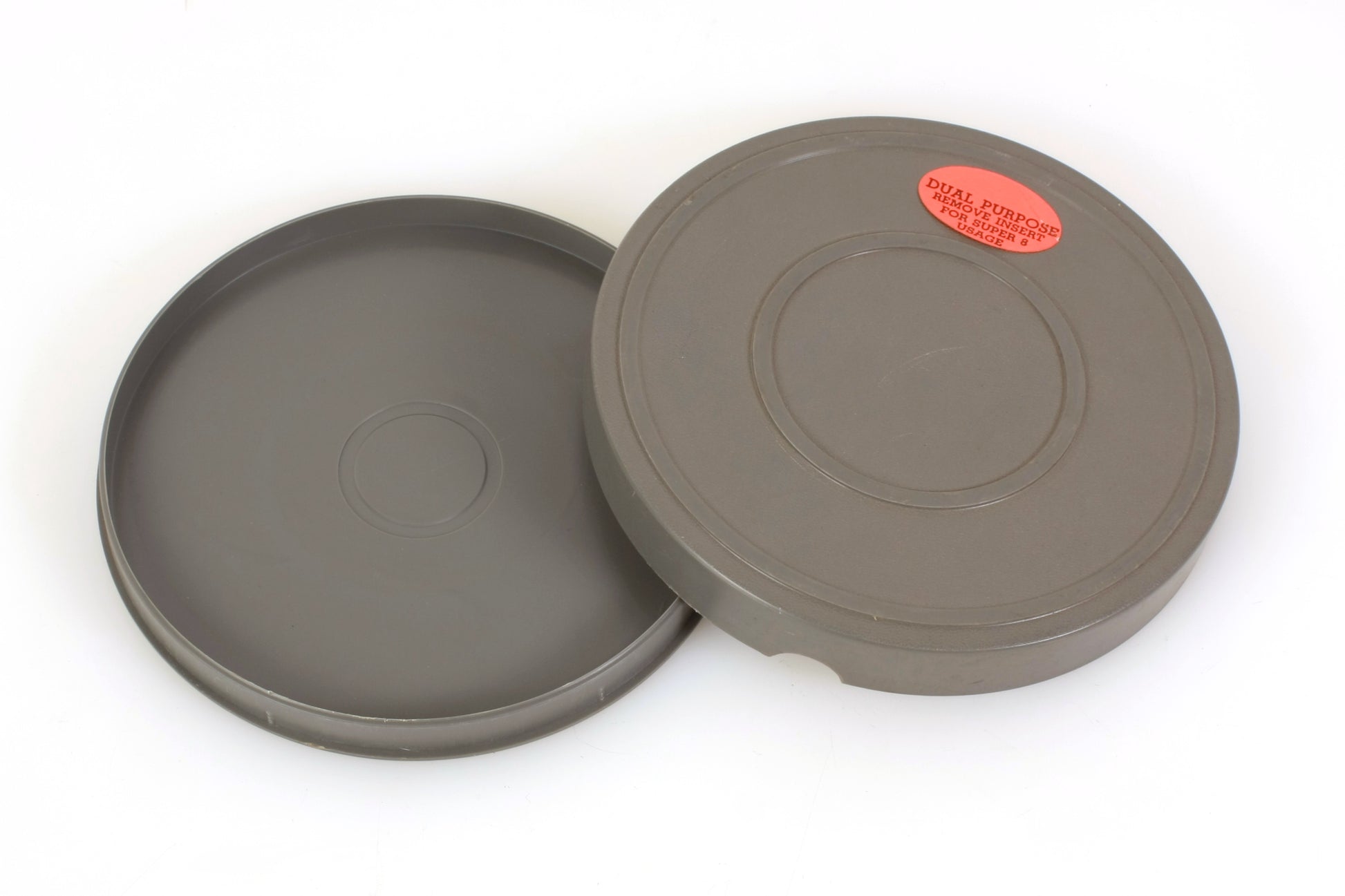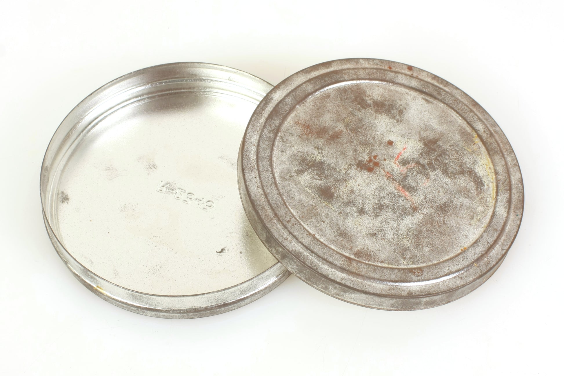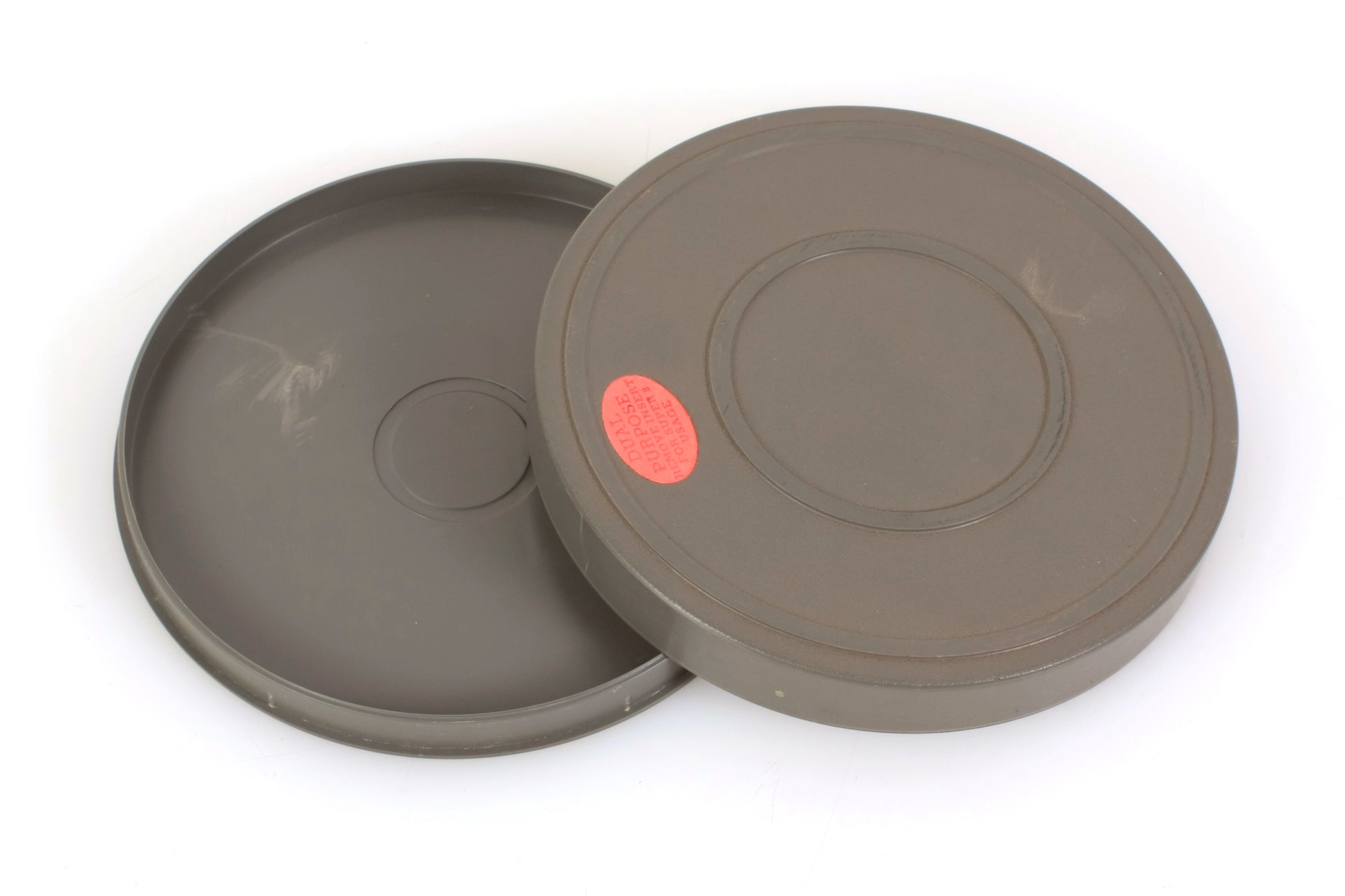 LOT OF SIX VINTAGE MOVIE FILM CANS. THERE ARE FOUR METAL AND TWO PLASTIC. THREE OF THE METAL CANS MEASURE APPROXIMATELY 5 1/8 INCHES DIAMETER X 7/8 INCH DEEP. ONE METAL CAN MEASURES APPROXIMATELY 5 1/8 INCHES DIAMETER X 9/16 INCH DEEP. THE PLASTIC CANS MEASURE APPROXIMATELY 5 1/4 INCHES DIAMETER X 3/4 INCH DEEP. IN GOOD VINTAGE CONDITION WITH SOME GENERAL SIGNS OF USE. ONE OF THE METAL CANS IS IN A BIT WORSE SHAPE THAN THE OTHERS AND HAS SOME AREAS OF RUST.