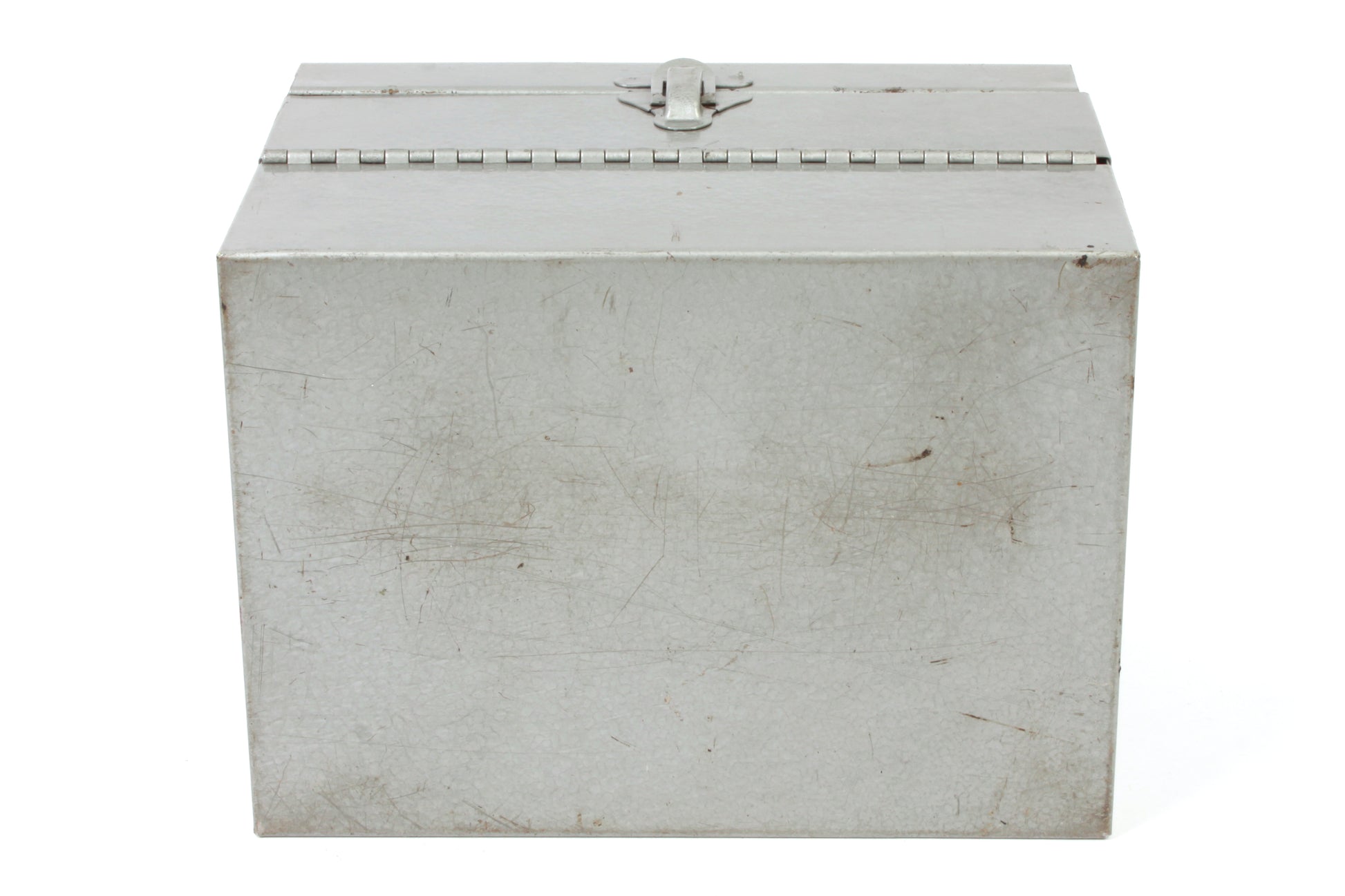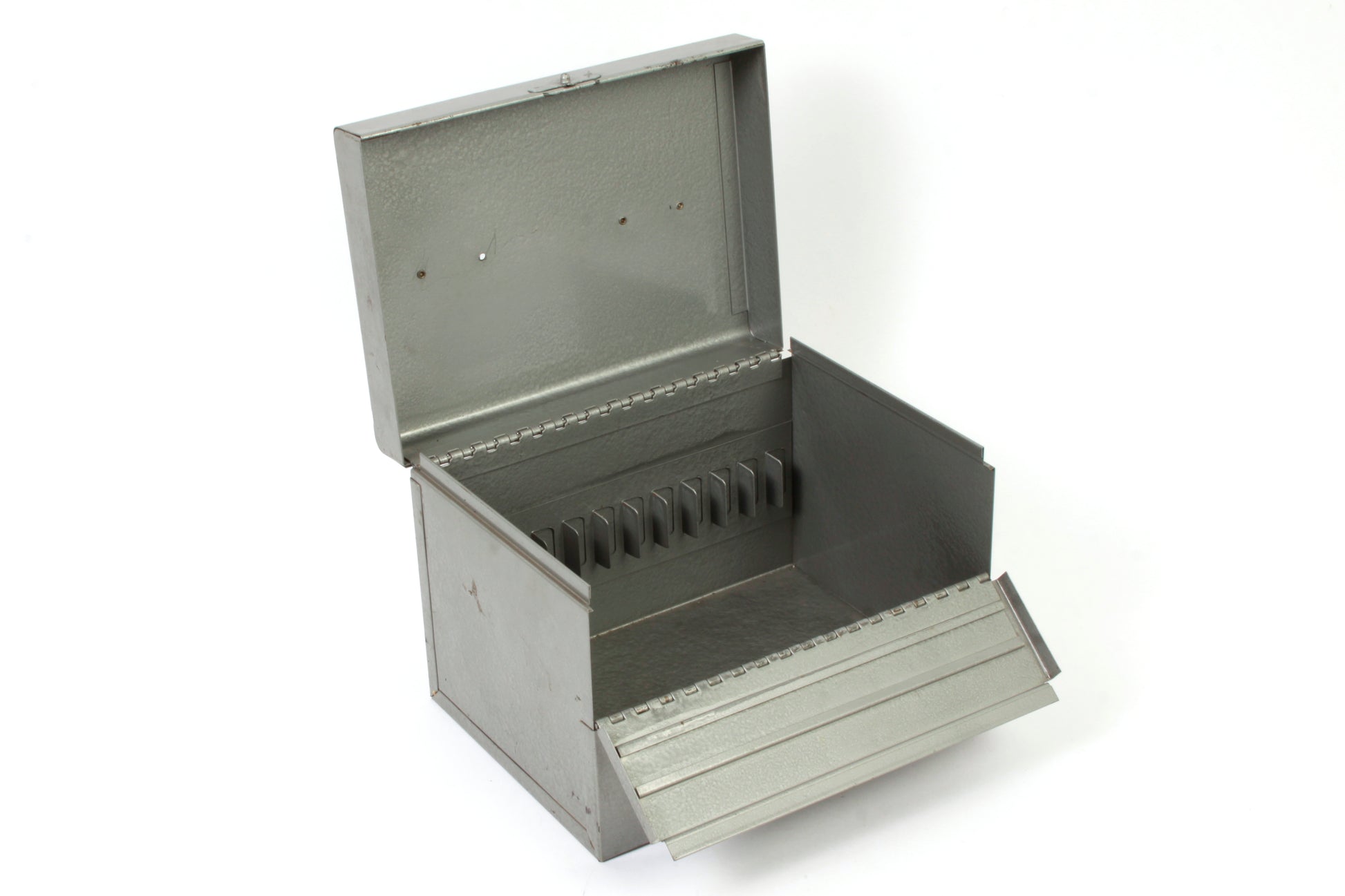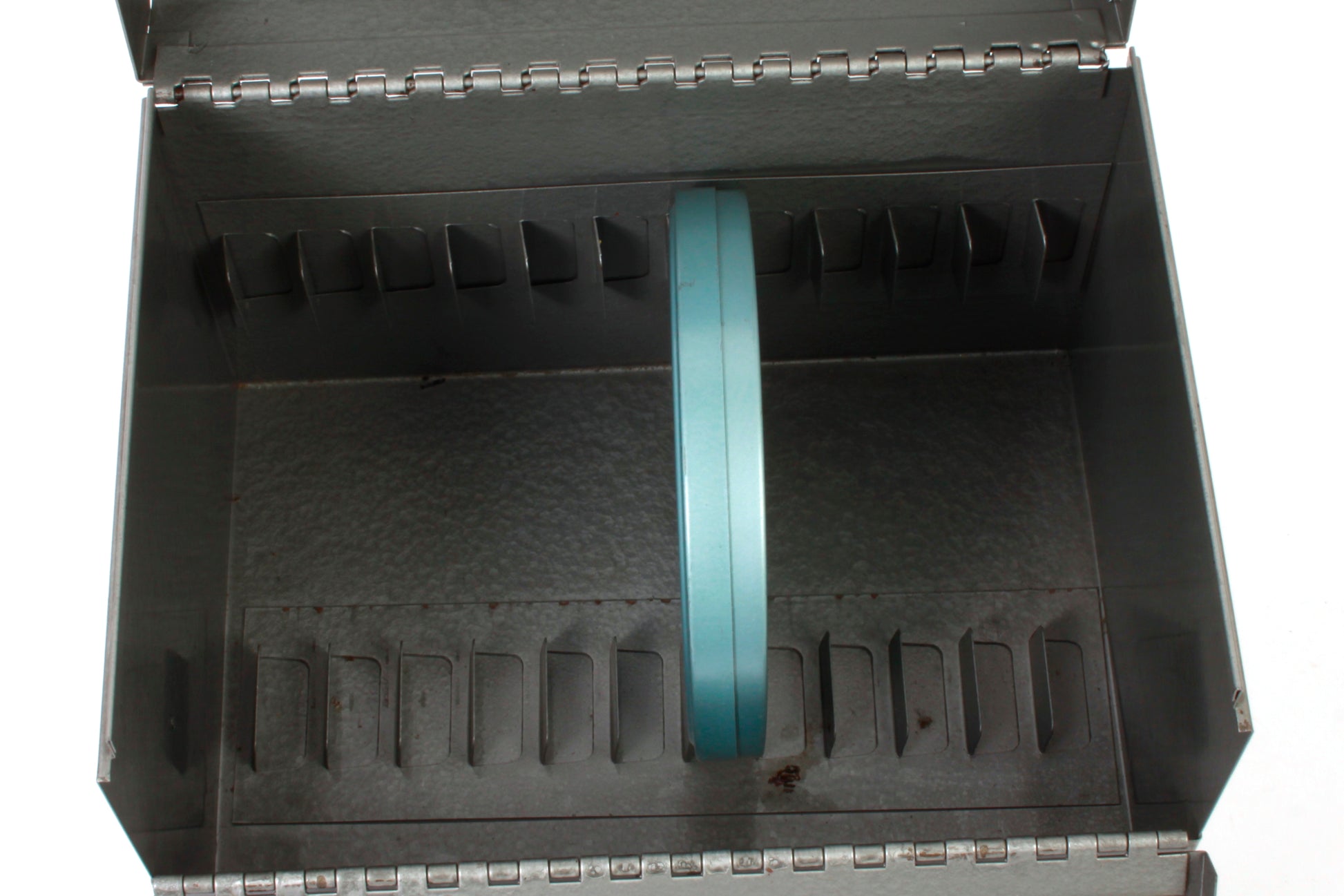 Vintage metal film reel holder. Overall measurements approximately 6 3/8 x 6 3/8 x 8 3/4 inches. The interior measures approximately 5 x 6 1/8 x 8 1/2 inches. There are 12 holders and they each measure approximately 10/16 inch wide. In good vintage condition with some scratches and patches of rust. Comes with one 200ft reel and can.