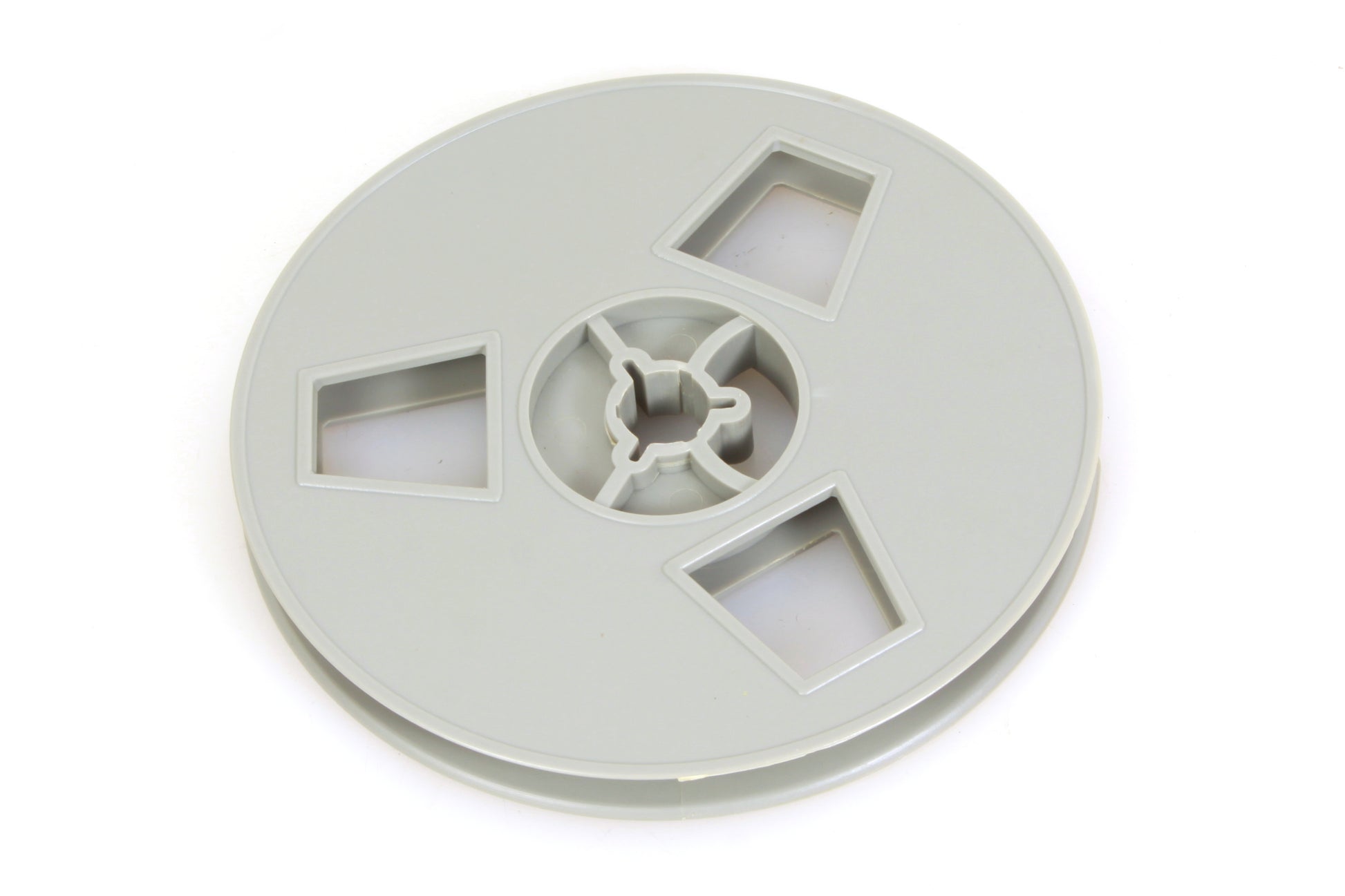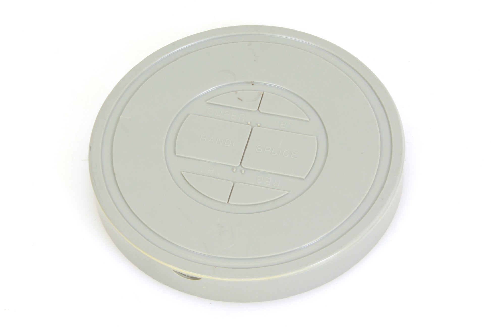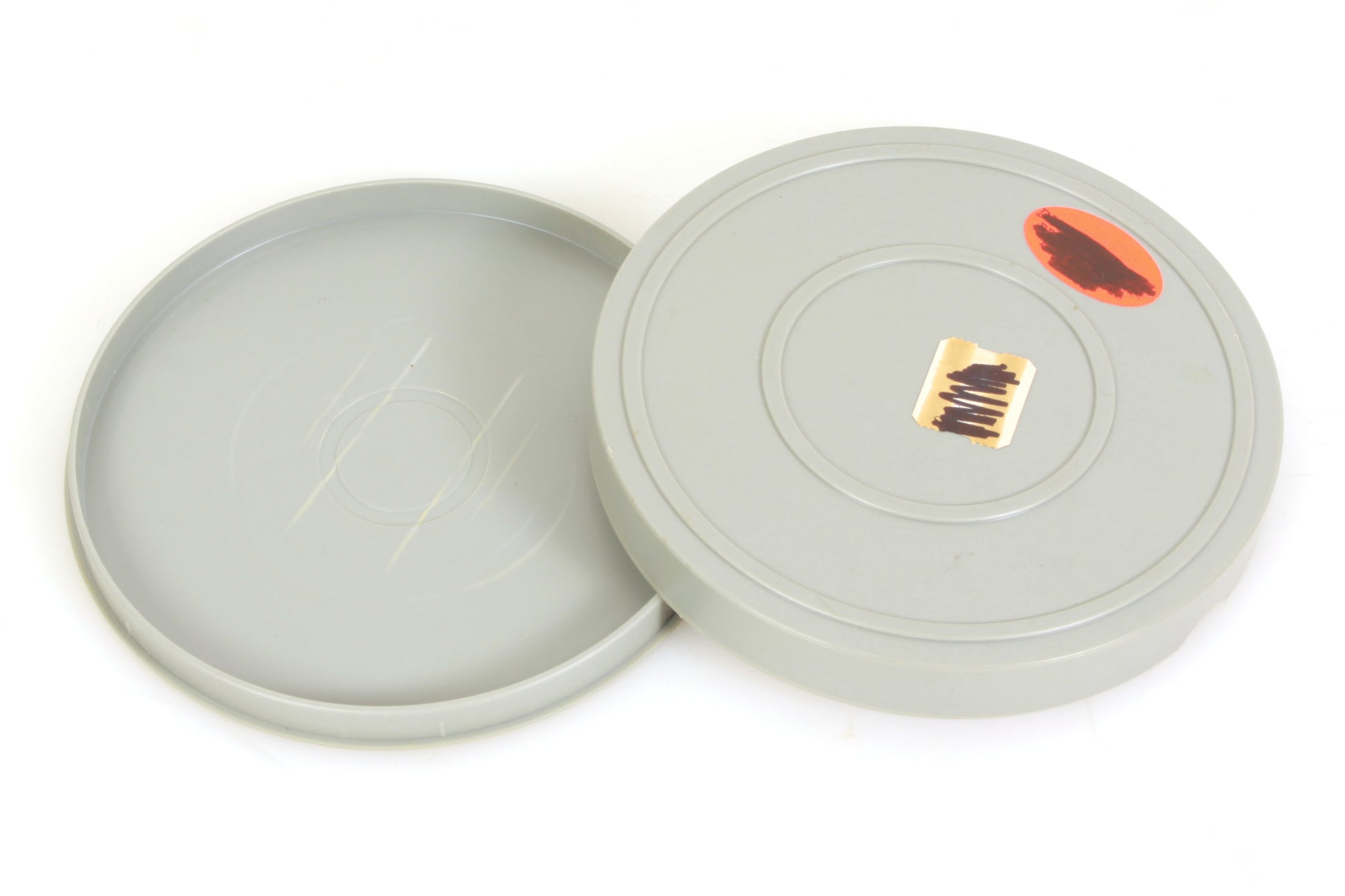 Gray plastic Super 8 film reel and can. The reel measures approximately 5 inches diameter and 1/2 inch deep. The can measures approximately 5 1/4 inches diameter and 3/4 inch deep. In good vintage condition with some scratches and there are a couple of stickers to the can.