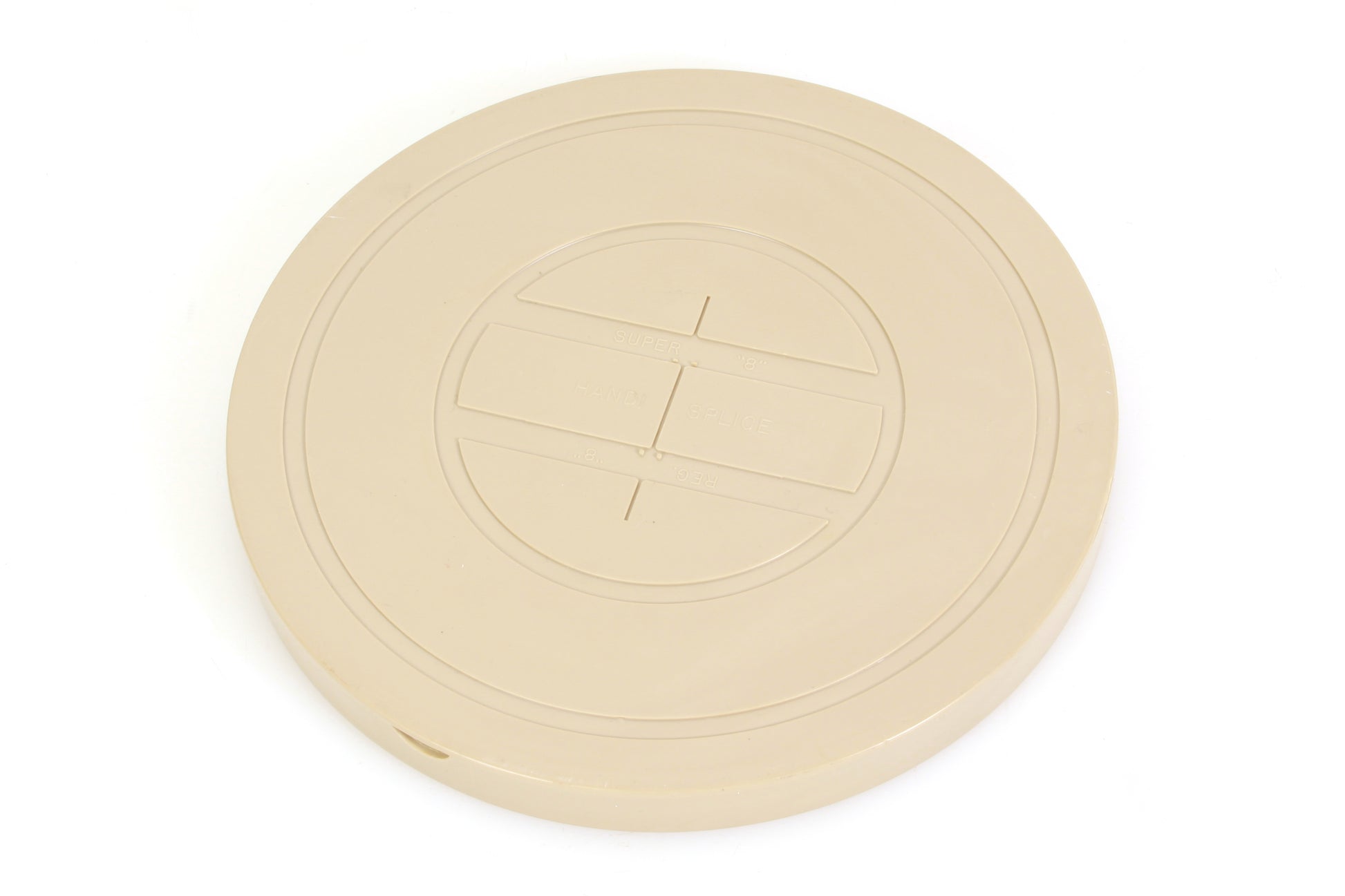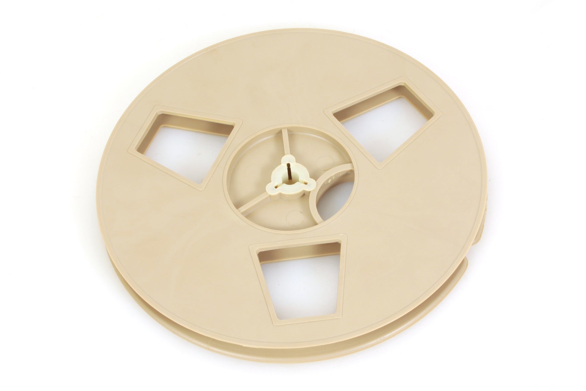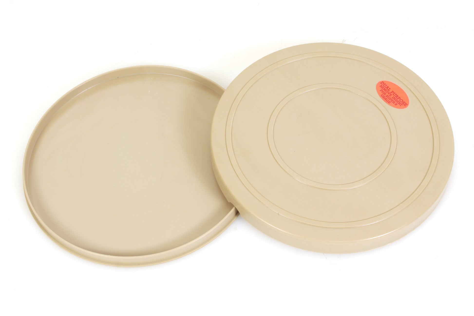 Brown plastic Regular 8 or Super 8 film reel and can. The reel measures approximately 7 inches diameter and 1/2 inch deep. The can measures approximately 7 5/16 inches diameter and 3/4 inch deep. In good vintage condition with some scratches and there is a sticker to the can.