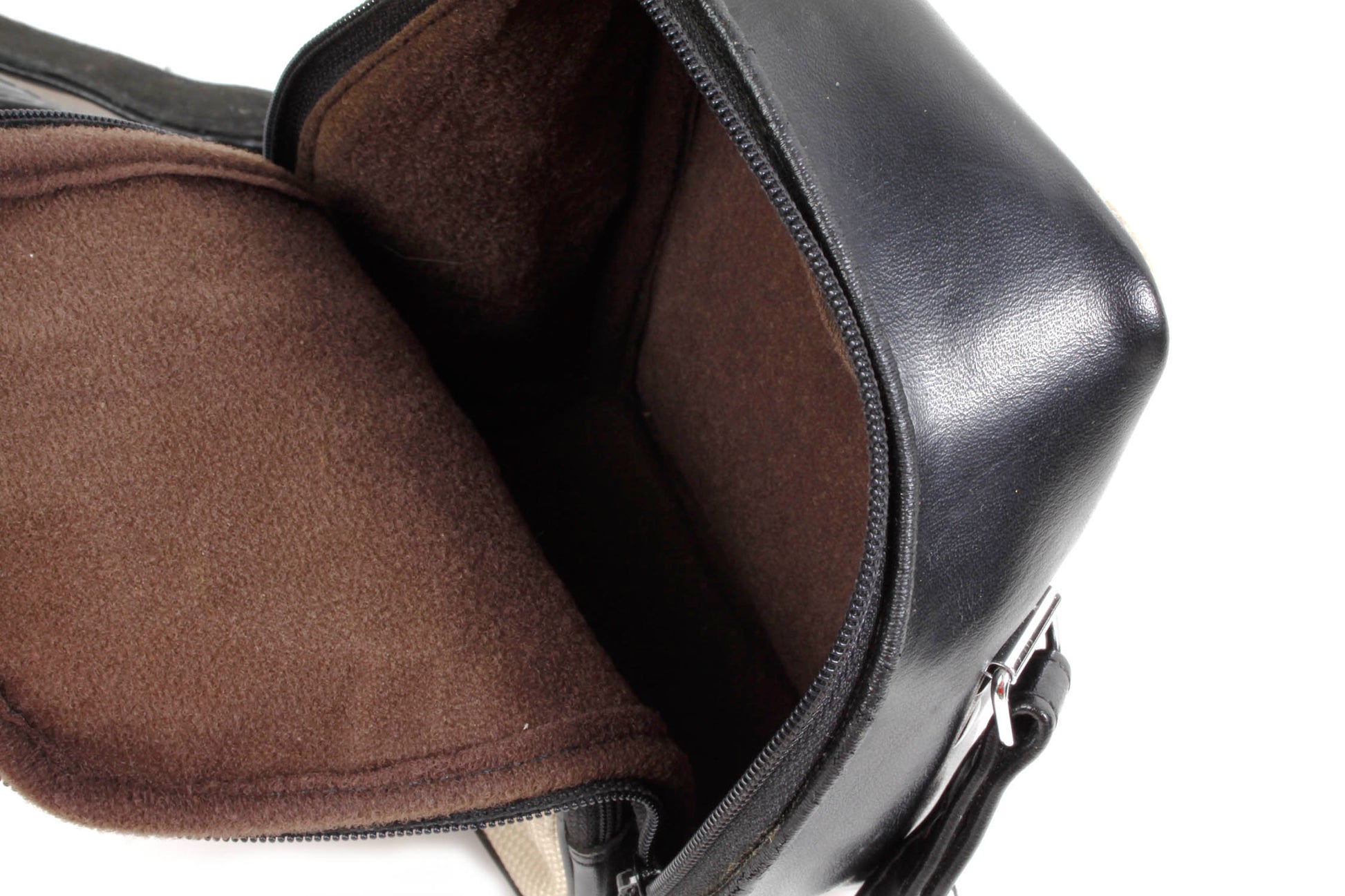 4 X 2.5 X 7 inch bag with shoulder strap. One main pocket and small front pocket. Inside is clean and soft. Exterior is in good condition but might need a small clean.