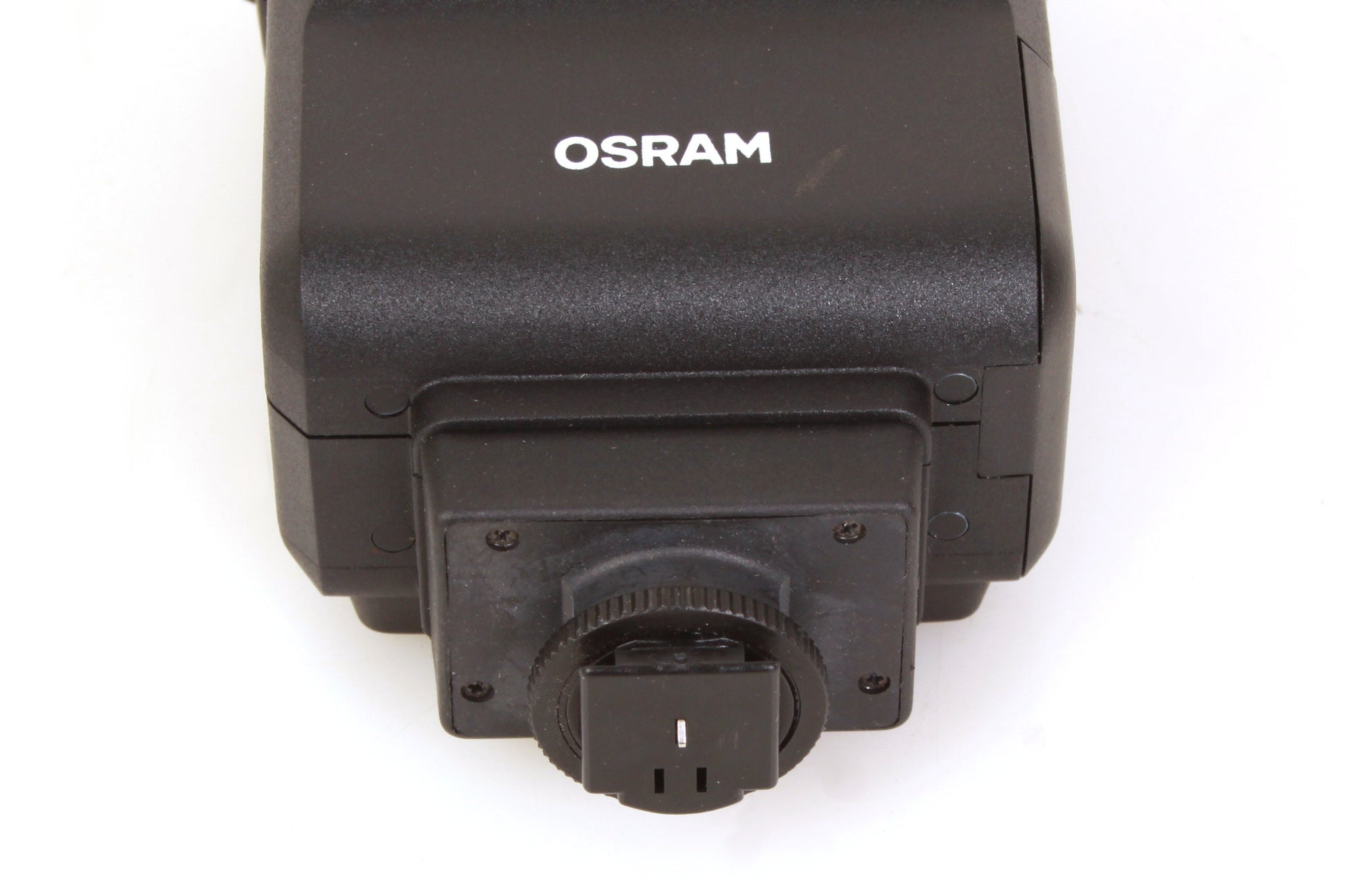 Osram C250 Studio Flash. In working order, although it has not been tested for accuracy. Cosmetically it is in very good used condition with hardly any signs of use. The battery compartment is clean and free of corrosion. Takes 4 AA batteries (not included). Comes with original box, instruction manual and PC cord. Also includes Osram R25/30 reflector screen in original packaging. Overall size approximately 5 7/8 inches long, 4 inches wide on the short end and 6 1/4 inches wide on the long end. Some minor marks to the screen but it is still in good condition.