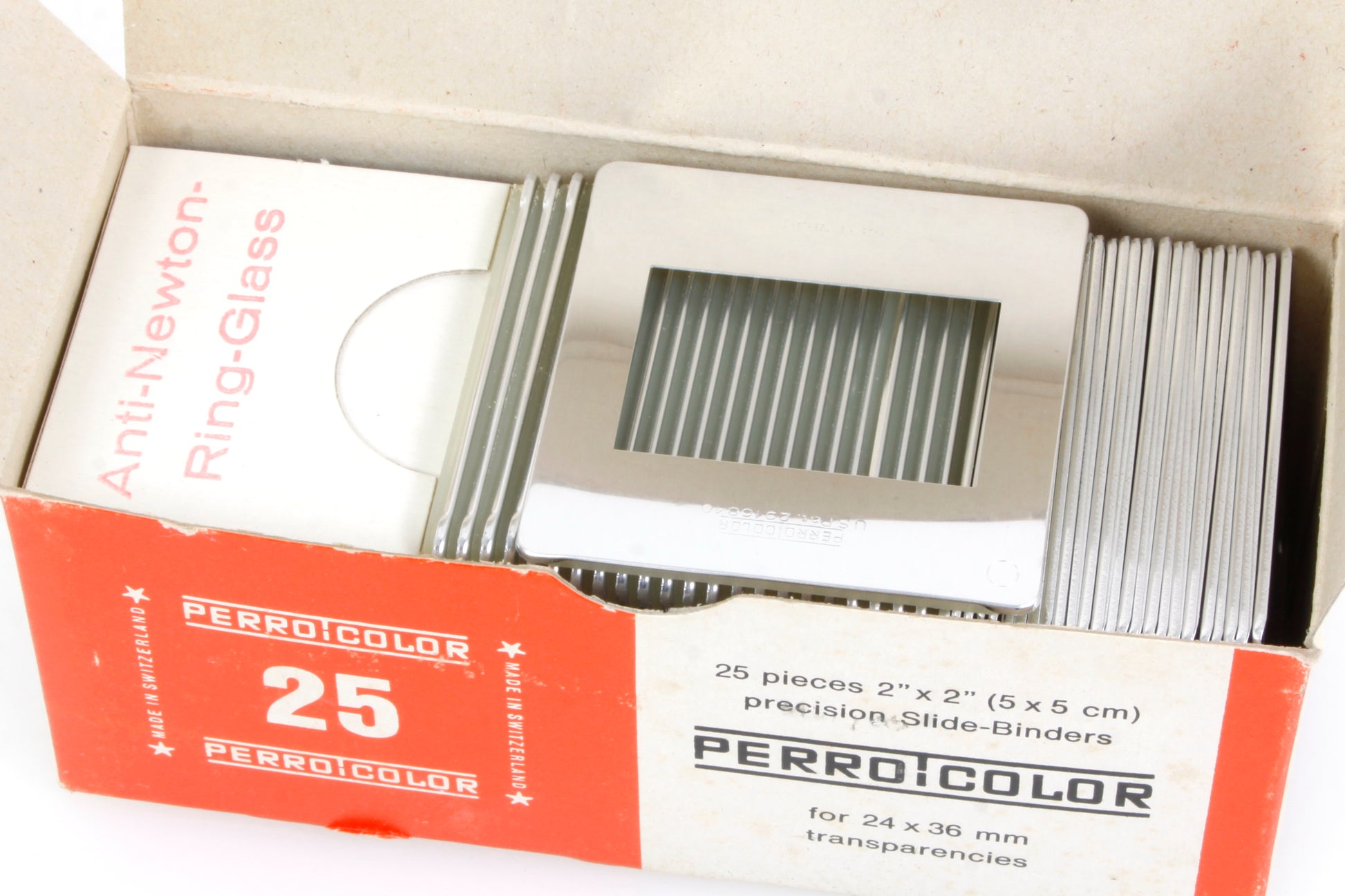 Lot of 50 Perro Color 5x5cm slide mounts for 24x36mm. New old stock in original boxes. Some marks and damage to the boxes. Comes with binder locking clamp which is in good vintage condition with some scratches.