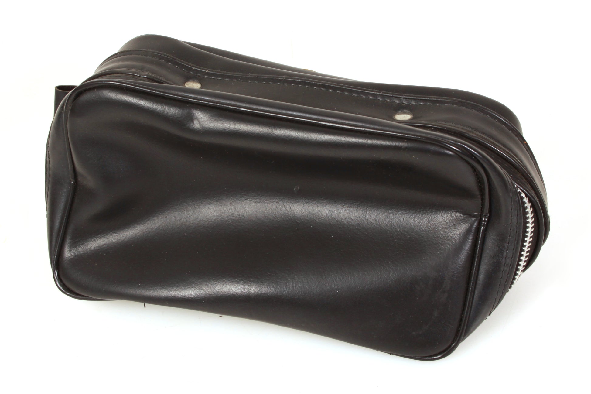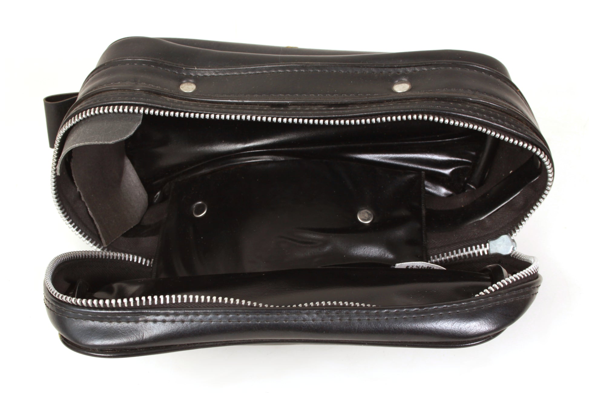 Vintage black vinyl camera accessory bag with zipper. Overall measurements approximately 9 x 5 x 3.5 inches. Interior measurements approximately 8.5 x 4.5 x 3 inches. This is a vintage item and there is some wear and tear. It is a bit warped due to having been in storage.
