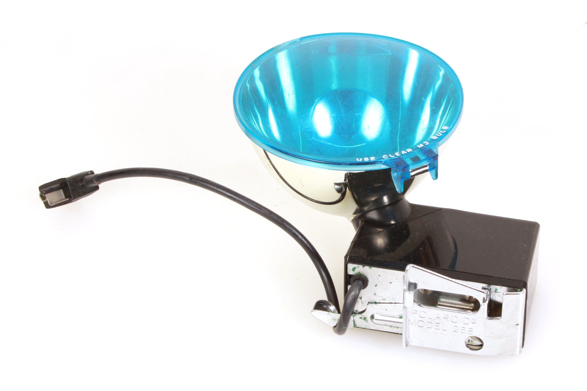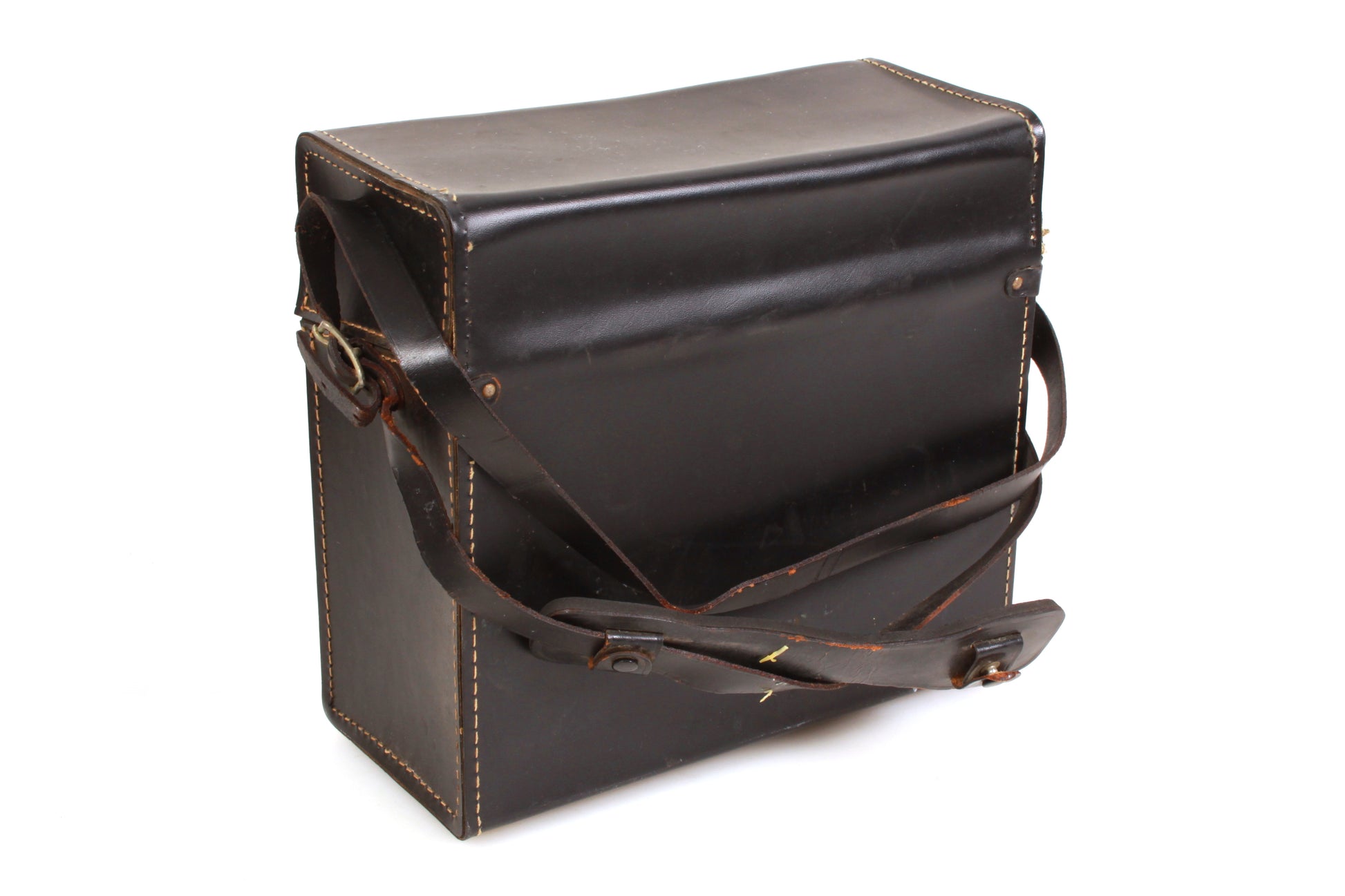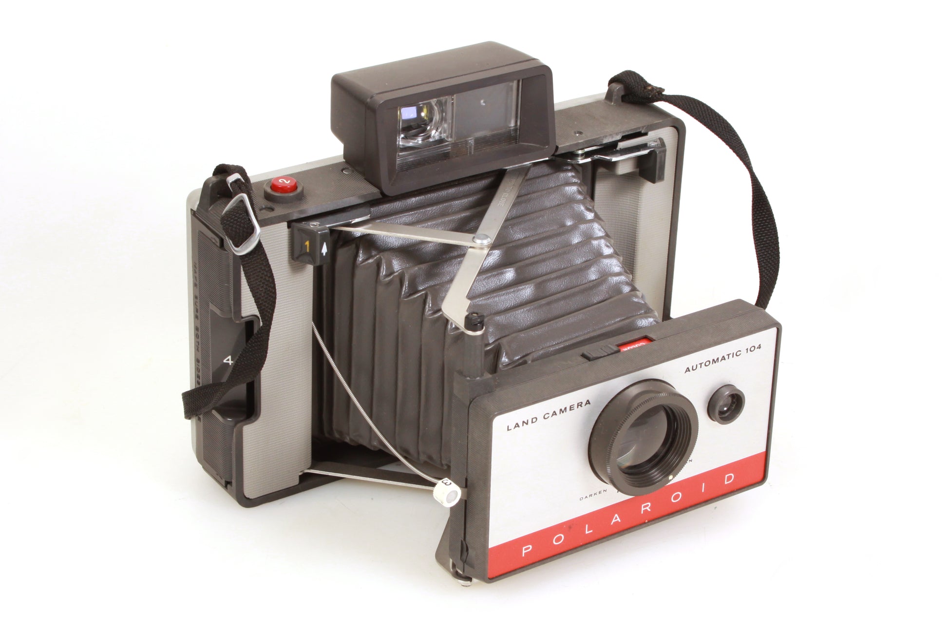 Polaroid Land Camera Automatic 104. Looks to be in working order. The shutter seems to fire fine, although it has not been tested with film or for accuracy. The lens has some dust but looks to be clear of haze and scratches. The viewfinder is free of haze and cracks. The bellows are in good condition with no rips or holes. Cosmetically the camera is in good vintage condition with some light general signs of use. Needs new battery. Comes with model 268 flash and case. The flash is untested but looks to be in good cosmetic condition with some general signs of age and use but no obvious major damage. The case measures approximately 11 1/4 x 10 1/4 x 5 1/8 inches. There is some wear and tear to the case, some areas of damage, some cracking to the strap, some rusting to the metal parts.