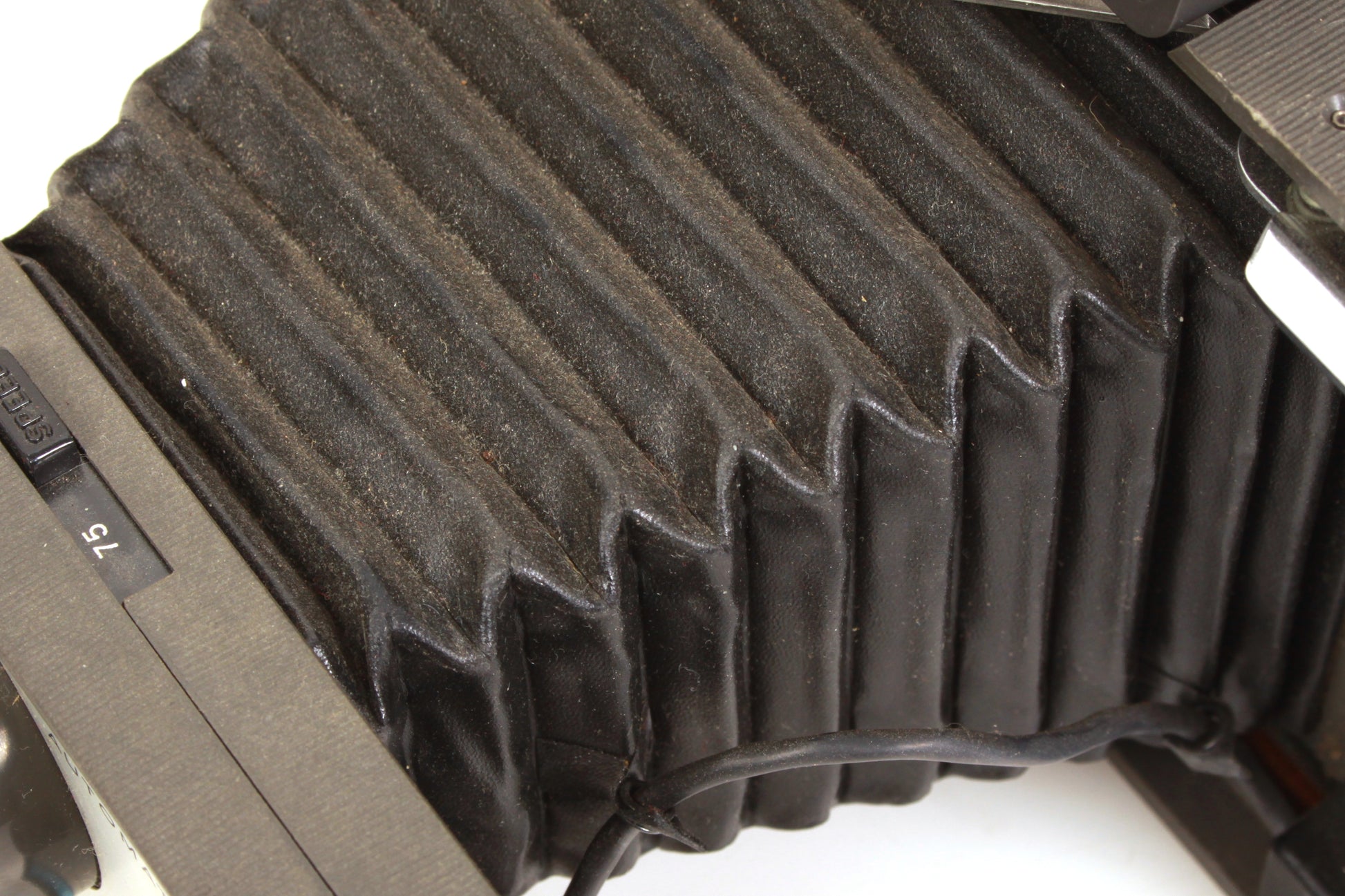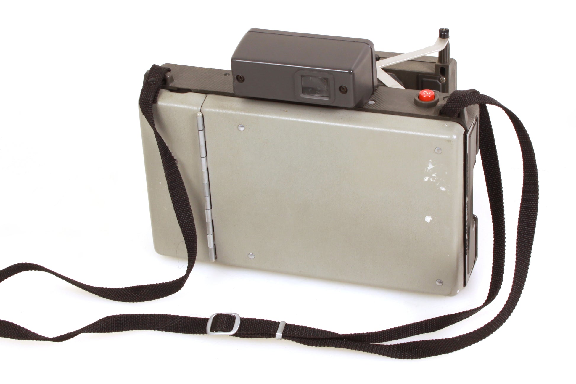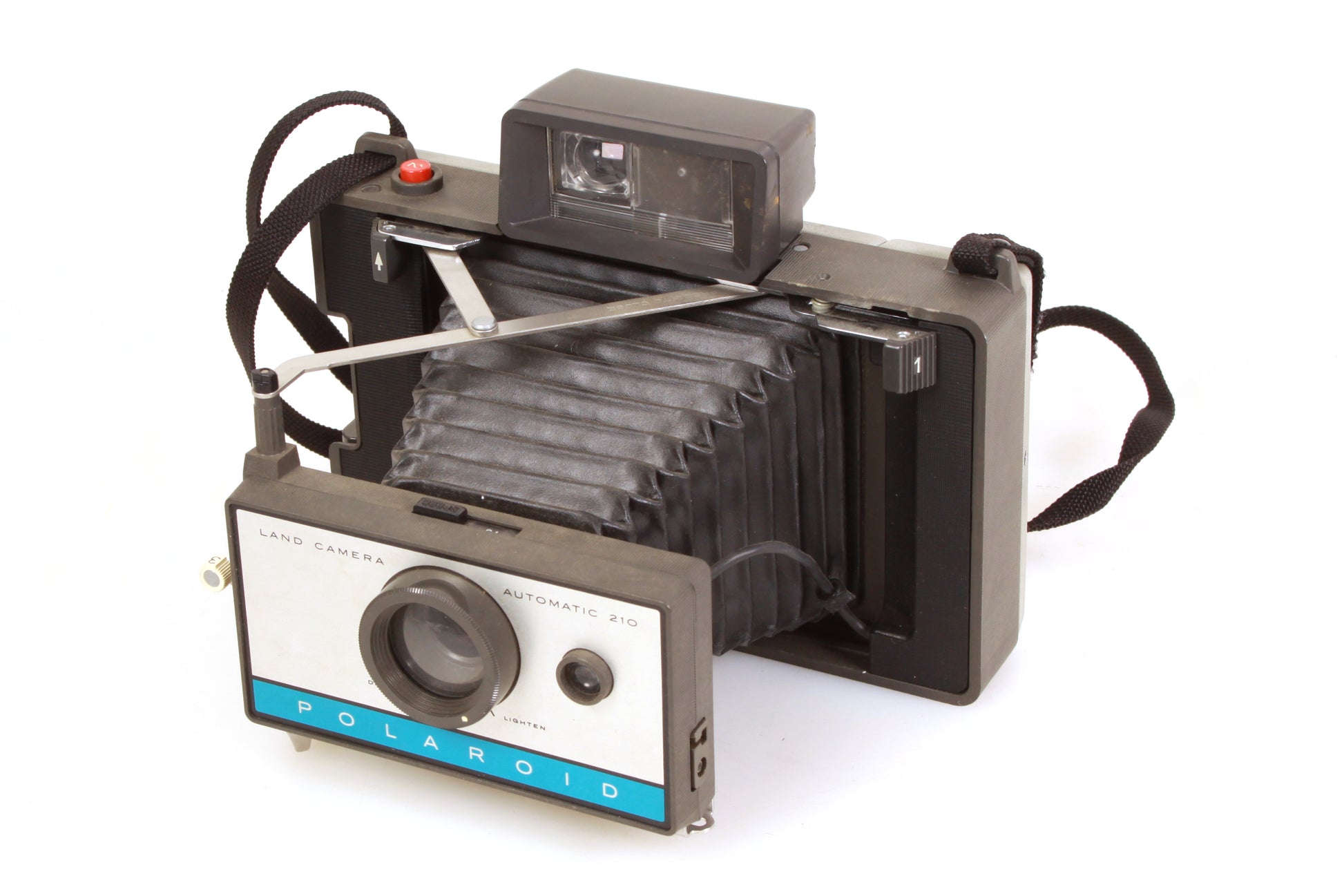 Polaroid Land Camera Automatic 210. Looks to be in working order. The shutter seems to fire fine, although it has not been tested with film or for accuracy. The lens looks to be clear of dust, haze and scratches. The viewfinder is free of haze and cracks. The bellows are in good condition with no rips or holes. Cosmetically the camera is in good vintage condition with some light general signs of use. Needs new battery.