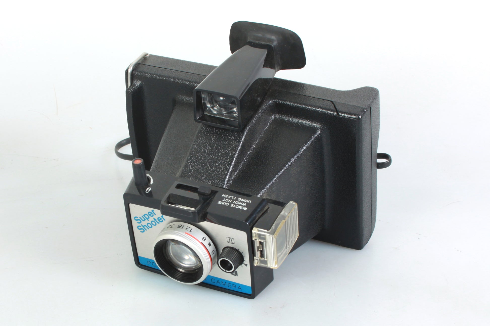 POLAROID SUPER SHOOTER PLUS LAND CAMERA. LOOKS TO BE WORKING - THE SHUTTER FIRES ALTHOUGH IT HAS NOT BEEN TESTED WITH FILM OR FOR ACCURACY. COSMETICALLY IT IS IN GOOD VINTAGE CONDITION WITH LIGHT SIGNS OF AGE AND USE. THERE LOOKS TO BE SOME DUST PRESENT TO THE LENS BUT NO HAZE OR SCRATCHES. SOME DUST PRESENT TO THE VIEWFINDER BUT NO CRACKS. COMES WITH ORIGINAL BOX AND MANUAL. THERE IS SOME DAMAGE TO THE BOX. THE MANUAL HAS SOME CREASING BUT THE CONTENTS ARE CLEAN AND READABLE.