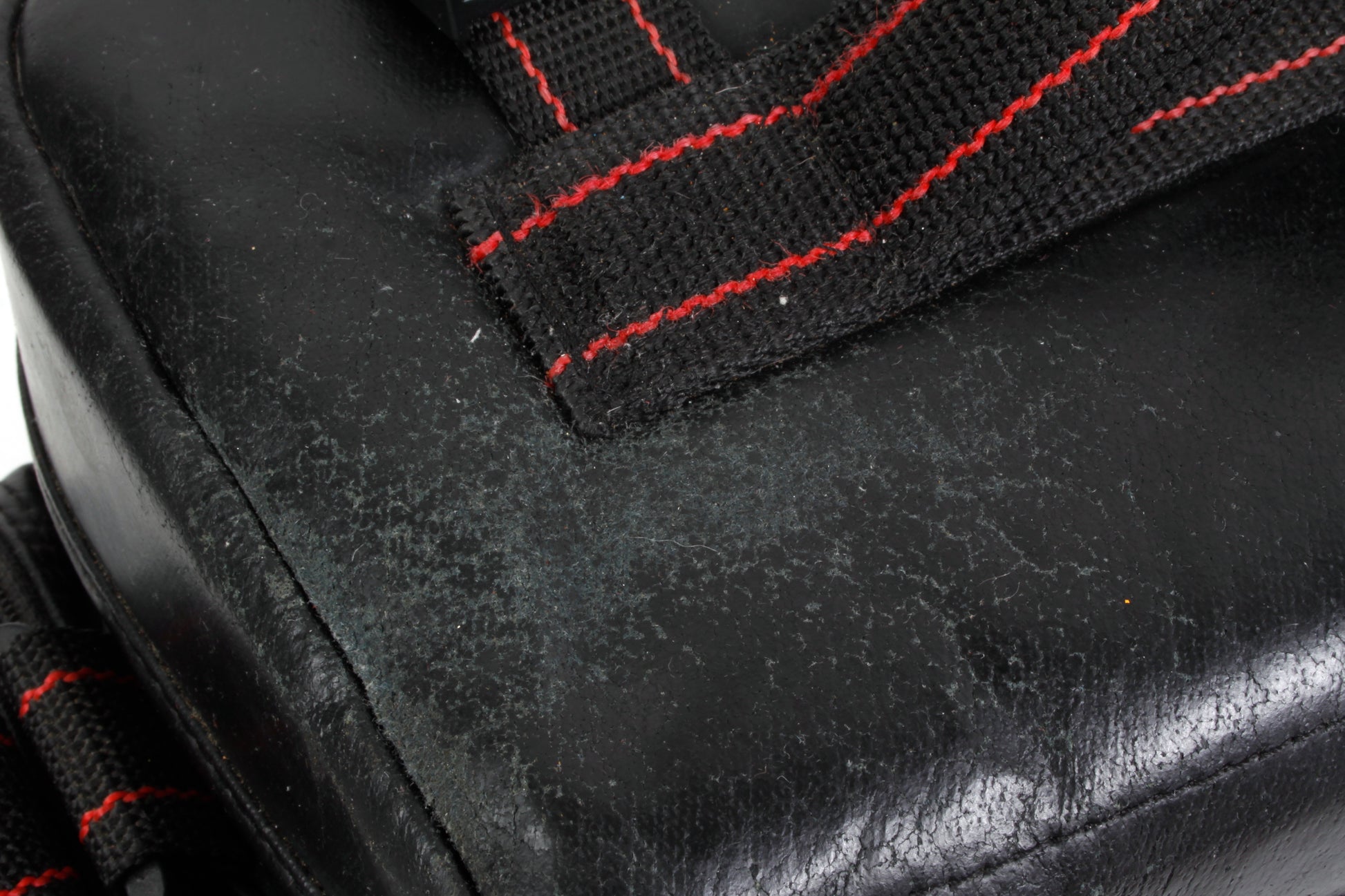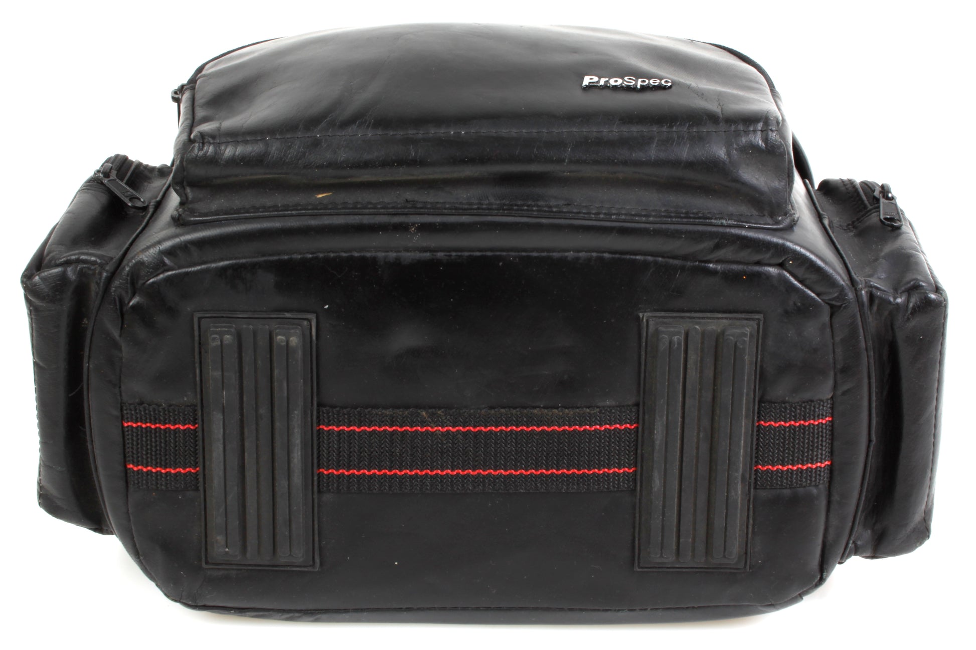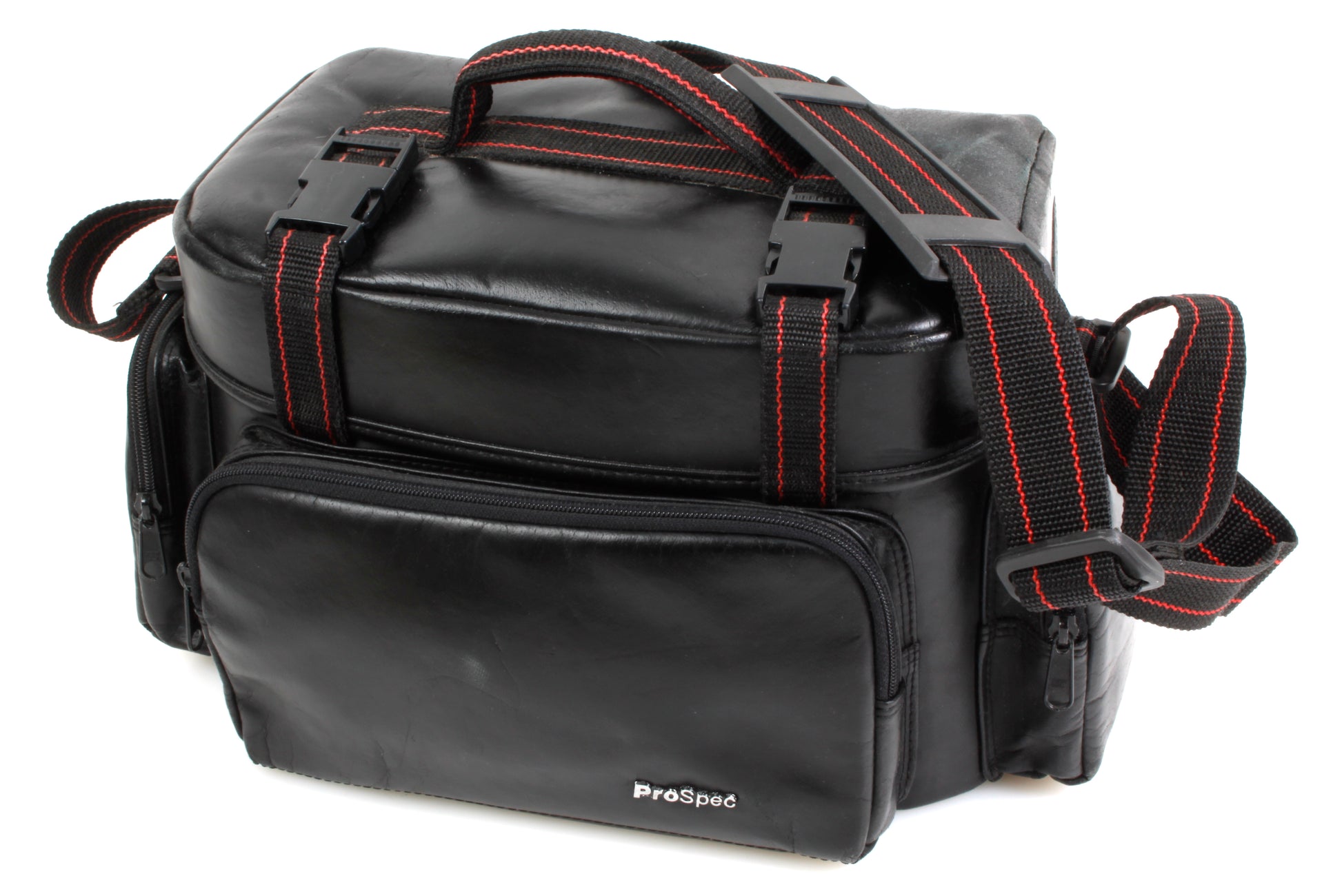 ProSpec black and red camera bag with shoulder strap. Exterior measurements approximately 14.5 x 8.5 x 8 inches. Interior measurements approximately 10 x 6.5 x 6 inches. In good vintage condition with some general signs of use and some cracking to the vinyl in places.