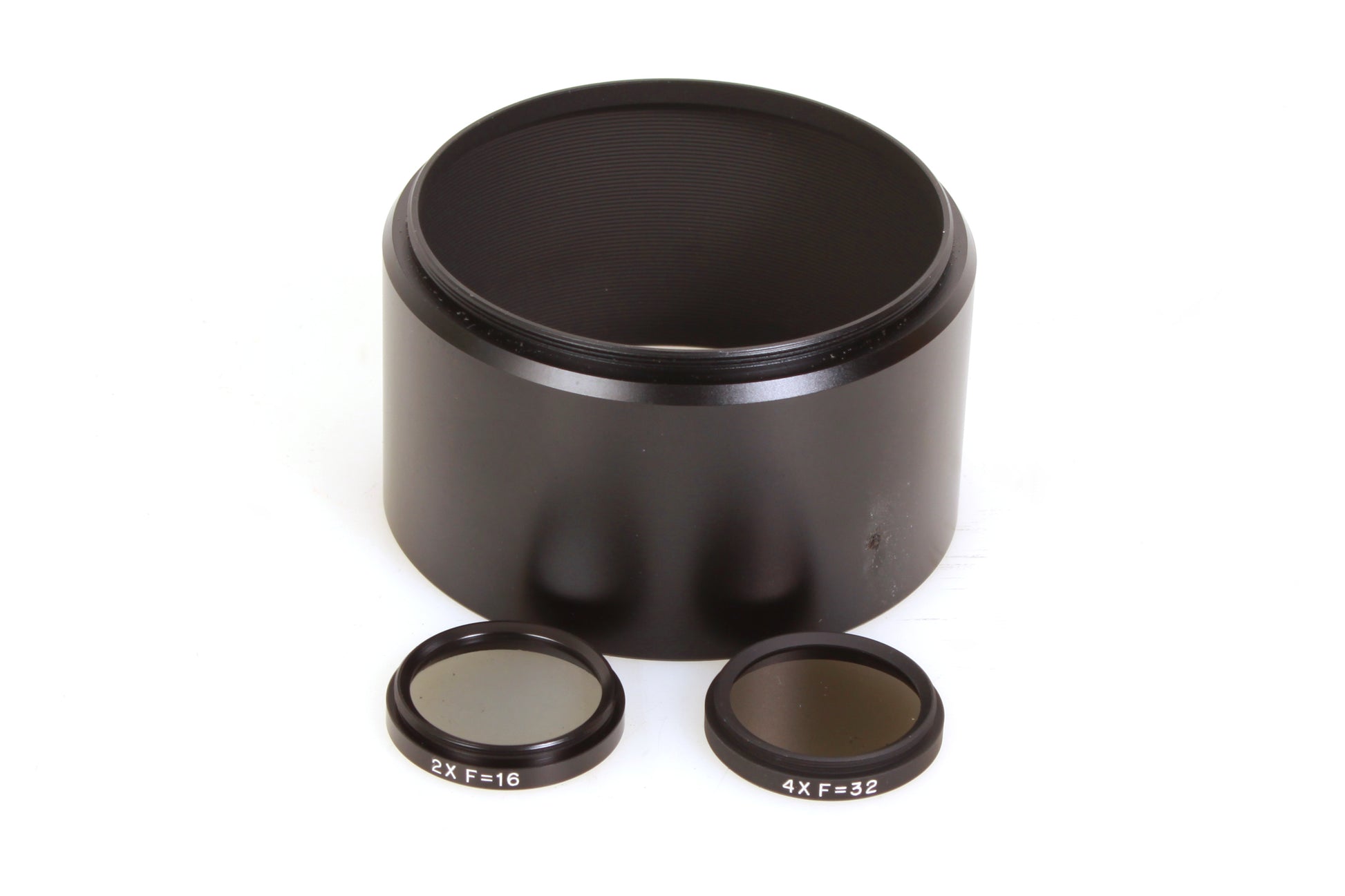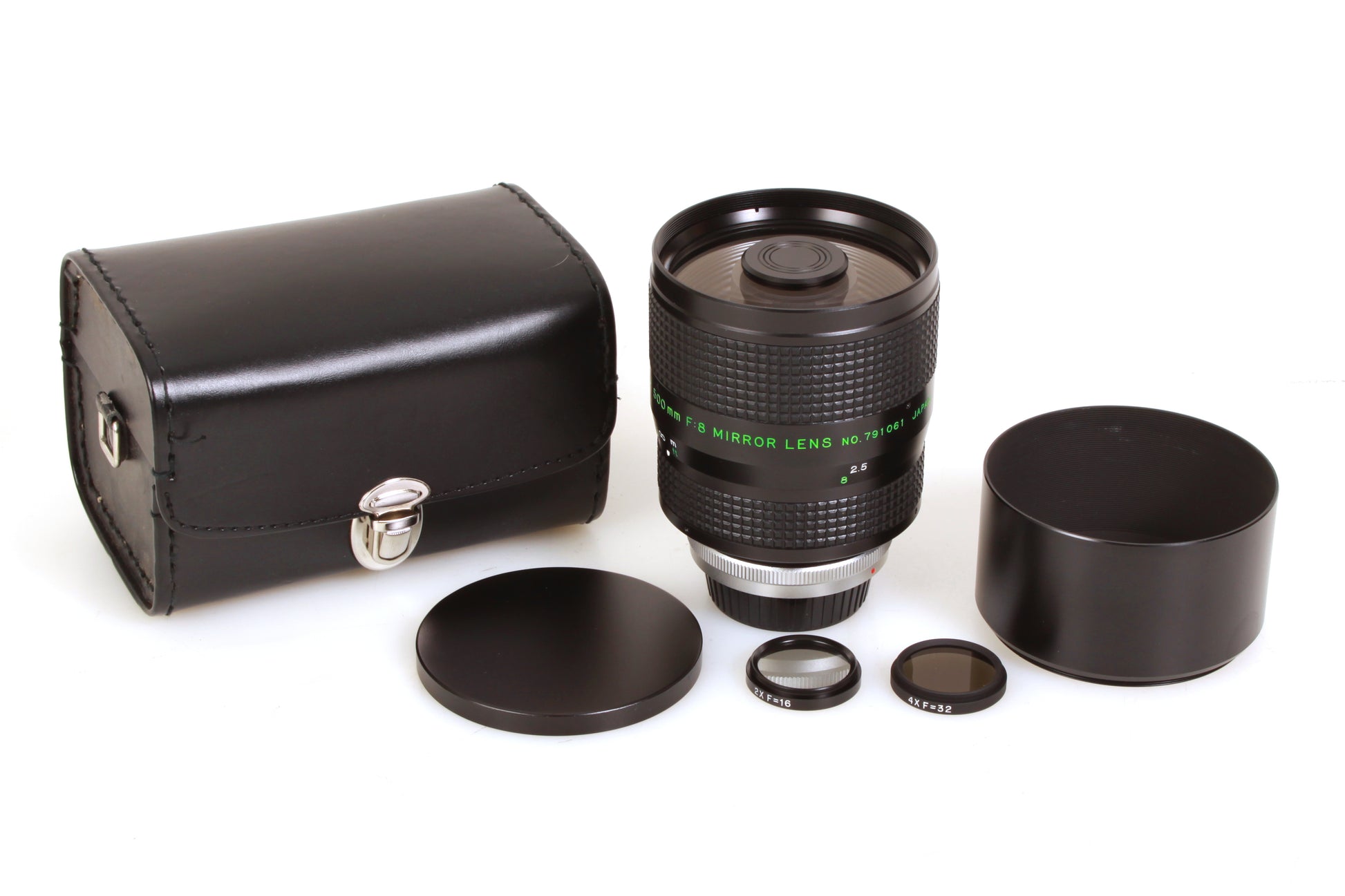 QUANTARAY 500MM F:8 MIRROR LENS. COMES WITH FRONT AND REAR CAPS, 2X F=16 AND 4X F=32 FILTERS, HOOD AND CASE. THERE IS SOME DUST PRESENT TO THE LENS BUT NO HAZE OR SCRATCHES. THE BARREL IS IN VERY GOOD COSMETIC CONDITION. THE CASE MEASURES APPROXIMATELY 5 1/2 X 3 5/8 X 3 5/8 INCHES. SOME WEAR IN PLACES TO THE CASE.