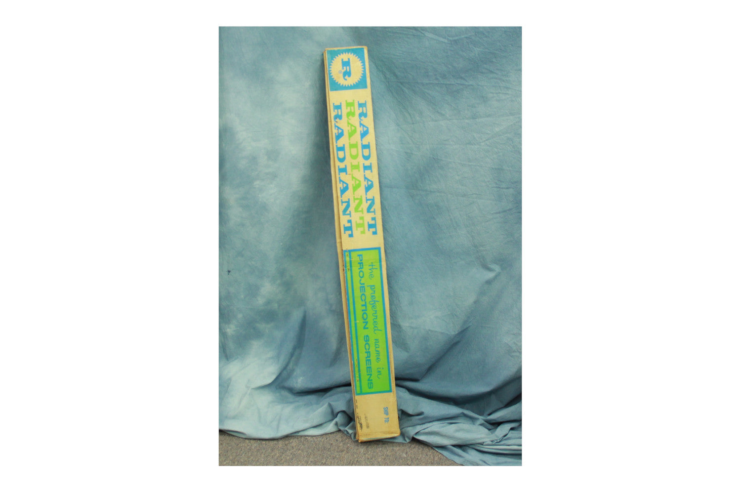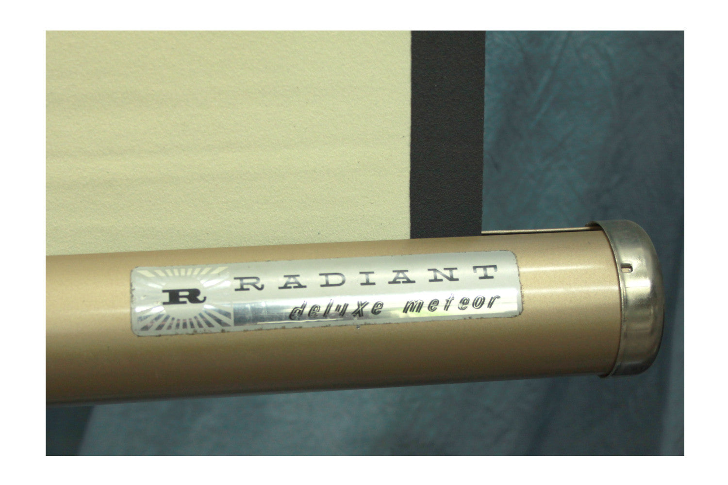 Radiant Deluxe Meteor projection screen. Approximate measurements: 67 inches tall overall, 43 1/2 inches wide overall, screen 39 1/2 inches wide (37 1/2 inches wide not including border), screen 38 1/2 inches tall. Overall it is in very good vintage condition. There is some yellowing to the screen due to age and there are a couple of pin prick holes in the screen but no obvious major damage. Comes with its original box.