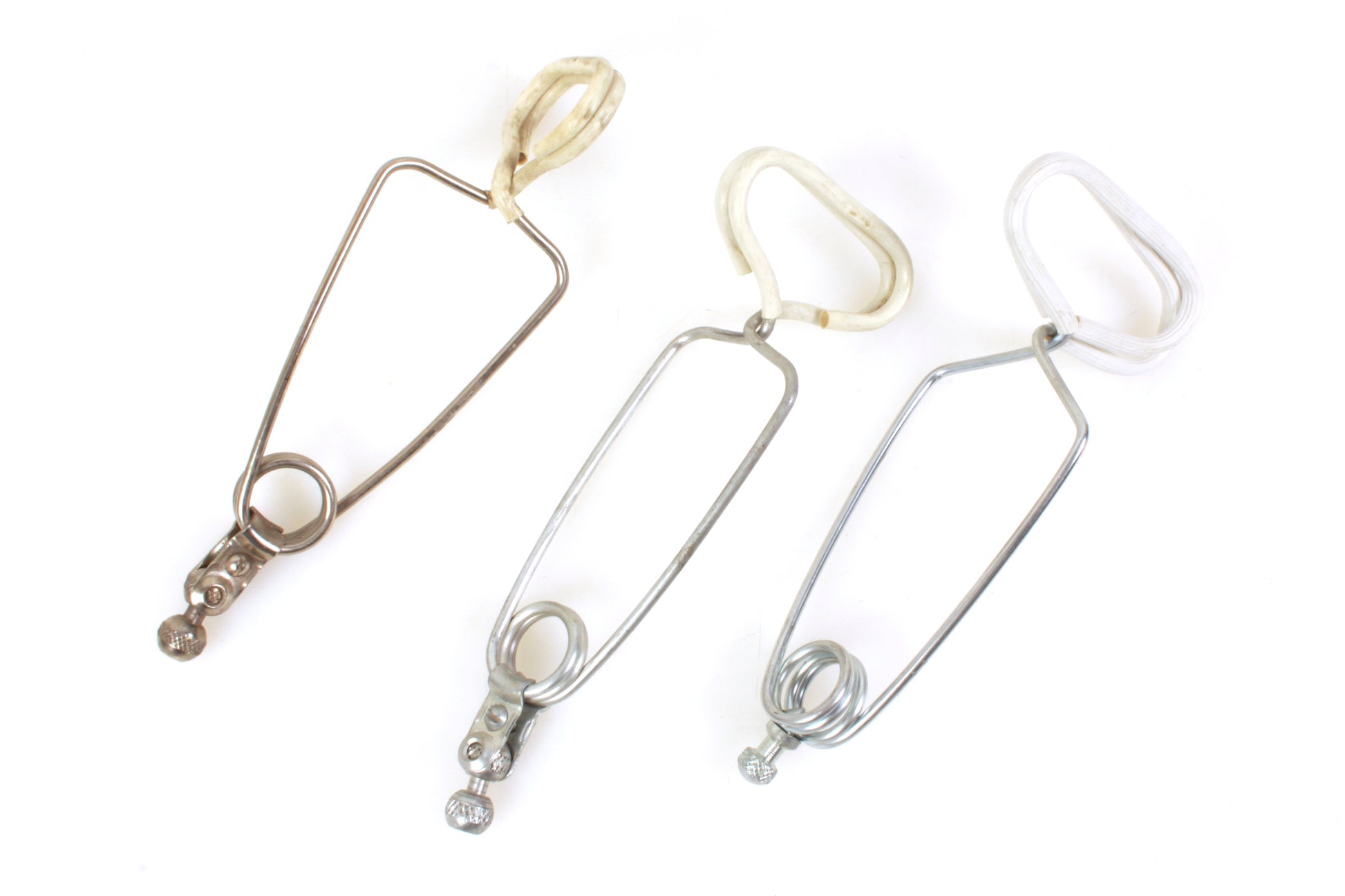 Set of three metal clamps with rubber coating to the ends. They measure approximately 8 to 8 1/2 inches long and 3 to 3 1/4 inches wide at the rubber part. In good vintage condition with some general signs of age and use.