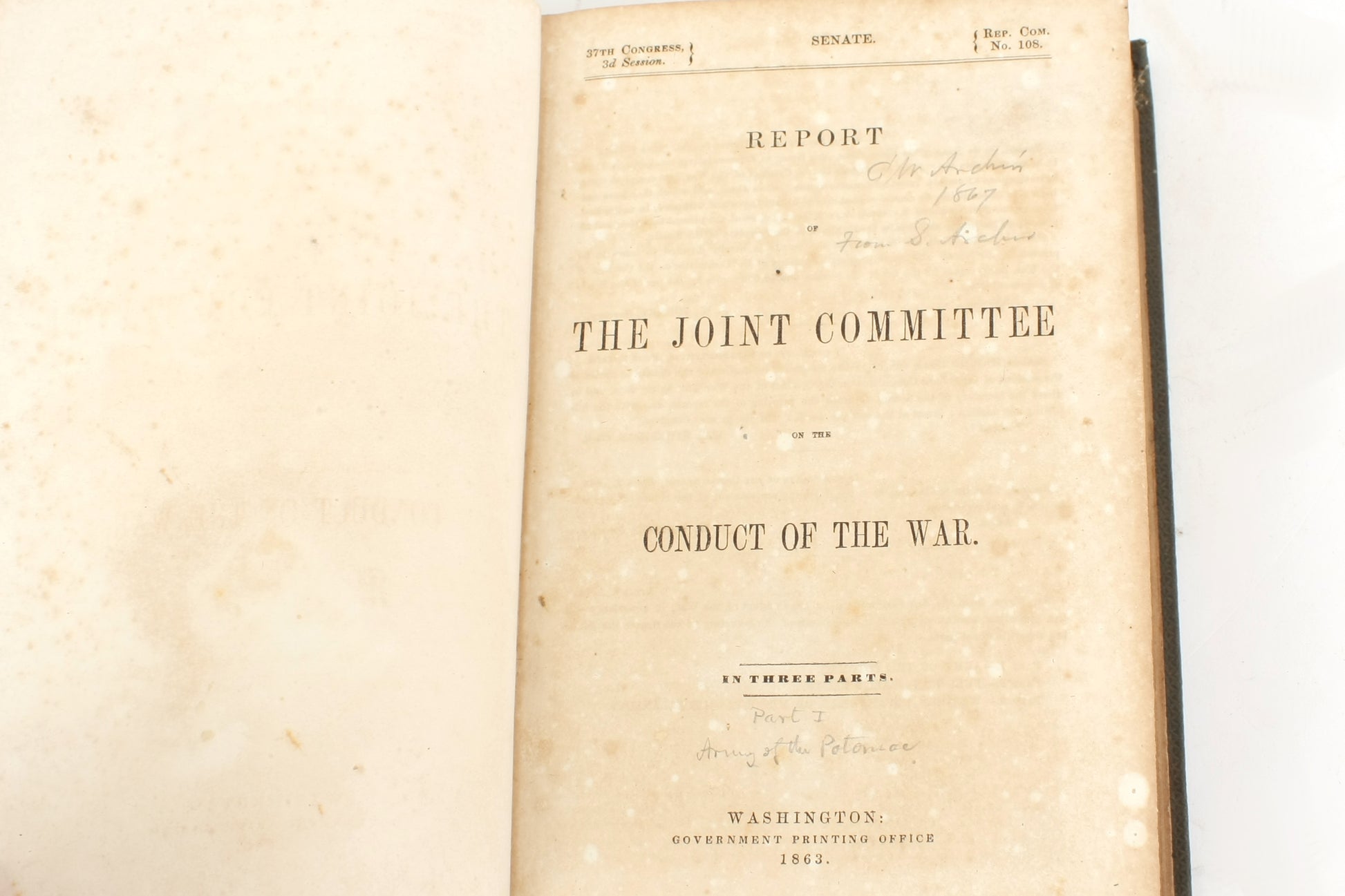 REPORT OF THE JOINT COMMITTEE ON THE CONDUCT OF THE WAR, VOL. 1. WASHINGTON: GOVERNMENT PRINTING OFFICE. 1863. HARDCOVER. 756 PAGES. THERE IS SOME WEAR TO THE COVER. SOME HANDWRITING TO THE TITLE PAGE, THE LAST FEW PAGES, AND SOME IN BETWEEN. THERE IS SOME FOXING TO THE PAGES. THE CONTENTS ARE STILL READABLE.