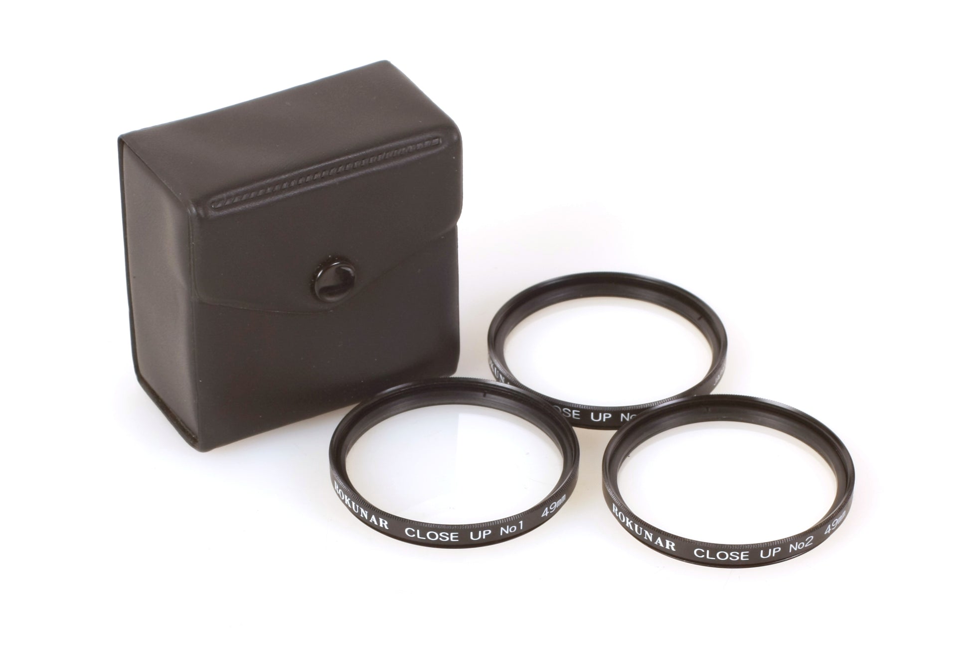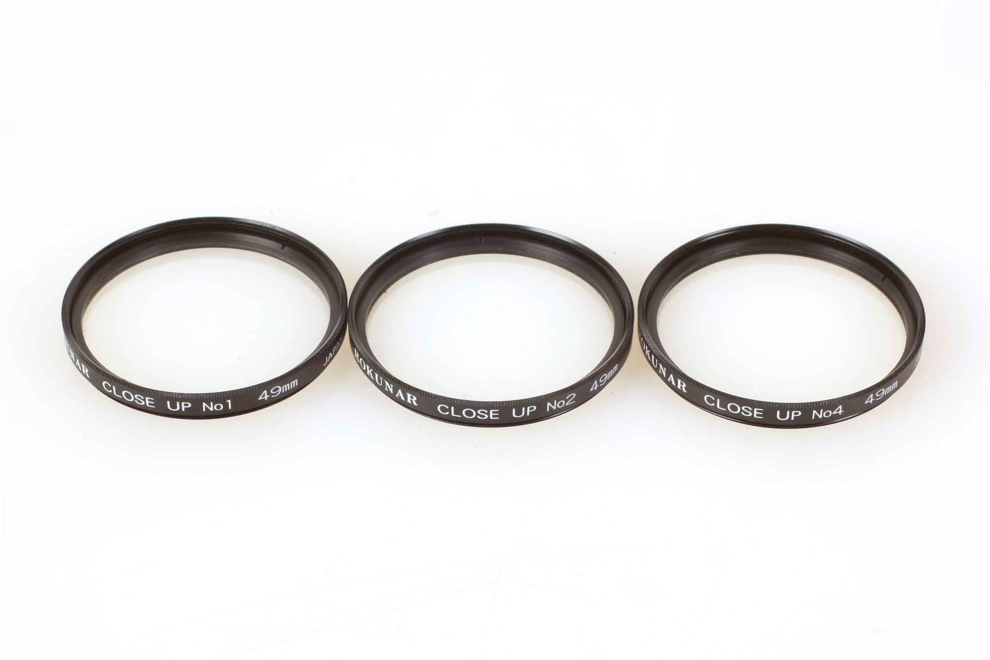 ROKUNAR SET OF 3 49MM CLOSE UP LENSES: NO1, NO2 AND NO4. IN GOOD USED CONDITION. NO MAJOR SCRATCHES TO THE FILTERS. COMES WITH CASE WHICH MEASURES APPROXIMATELY 2 3/8 X 2 1/2 X 1 3/8 INCHES. THE CASE HAS SOME MARKS BUT IS STILL IN GOOD USED CONDITION.