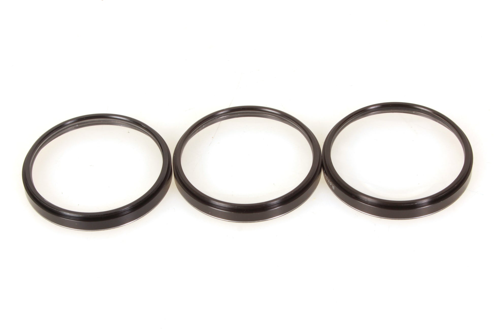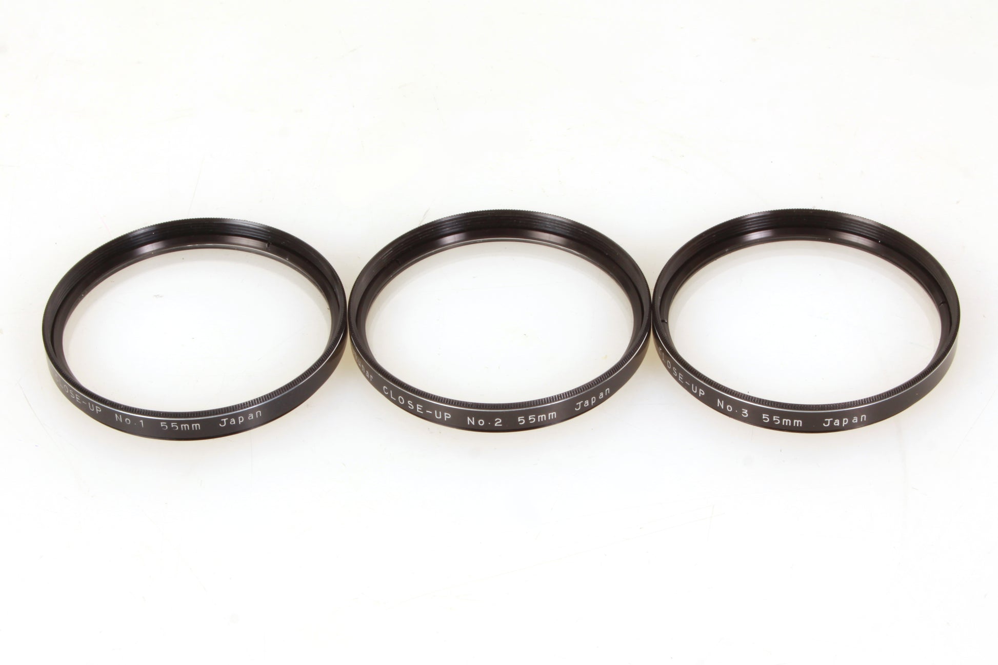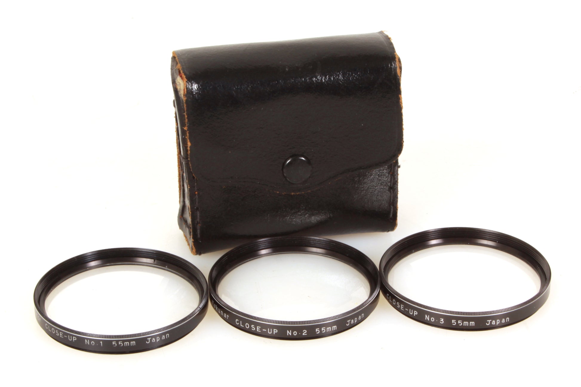 Rokunar 55mm close-up lens set (No. 1, No. 2, No. 3). In good vintage condition with some general signs of use but no obvious major damage. Comes with black leather case which measures approximately 2 7/8 x 2 3/4 x 1 1/4 inches. There is some wear to the case.