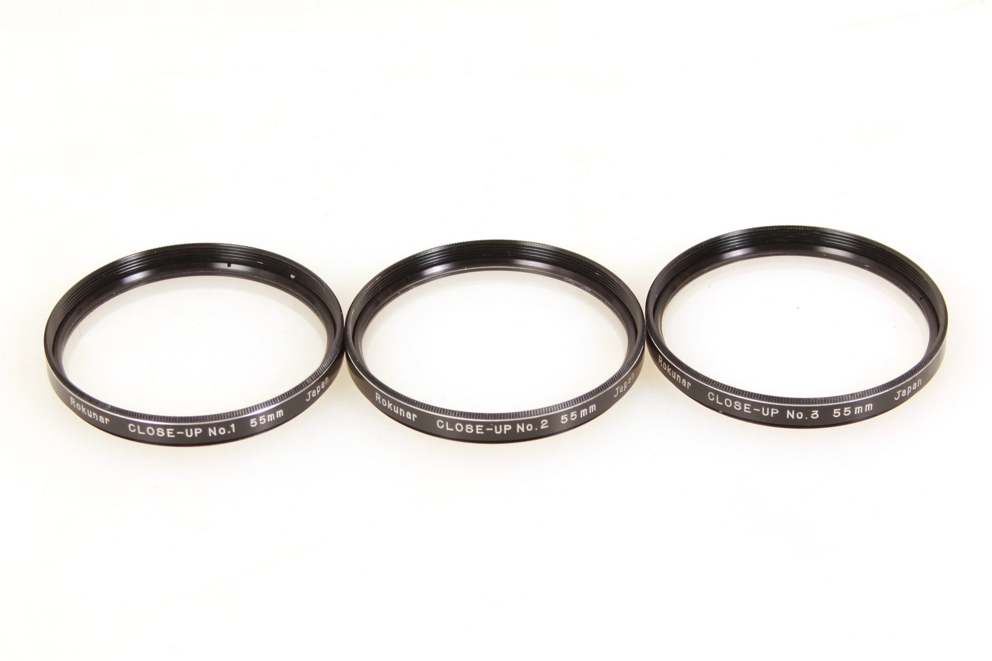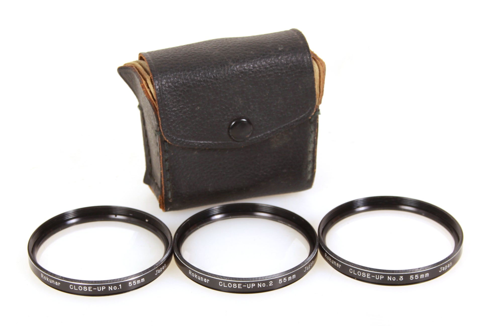 Set of three Rokunar 55mm close up lenses - No. 1, No. 2 and No. 3. In good used condition with some general signs of use but no obvious major damage. Comes with case which measures approximately 2 9/16 x 2 7/16 x 1 1/4 inches. There is some significant wear and damage to the case.
