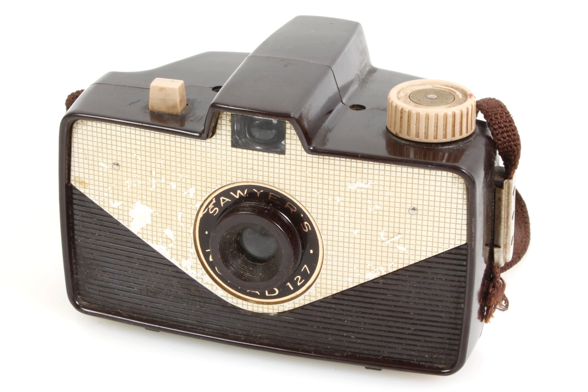 Sawyers Nomad 127 camera. Looks to be in working order - the shutter is firing fine, although it has not been tested with film or for accuracy. Cosmetically it has some scratches and general signs of age and use. There looks to be some dust and haze present to the lens but no fungus or scratches. Some haze and scratches present to the viewfinder. Comes with one roll of 127 film. The film has expired so we cannot guarantee its condition or usability but it is still sealed in its original packaging.