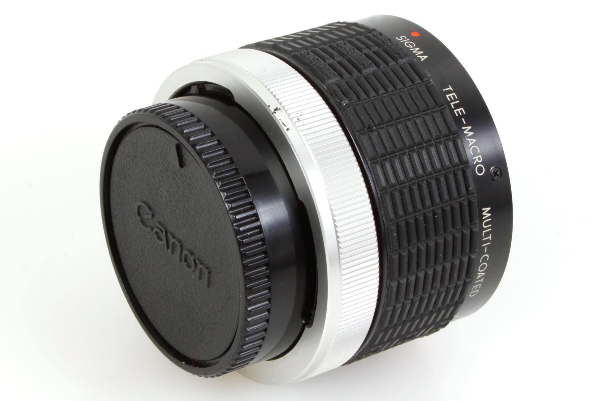 Sigma Tele-Macro 2x - 1:1 for Canon. There is a little dust present to the lens but no haze, fungus or scratches. The barrel is in very good cosmetic condition with only light signs of use. Comes with case and front and rear lens caps.
