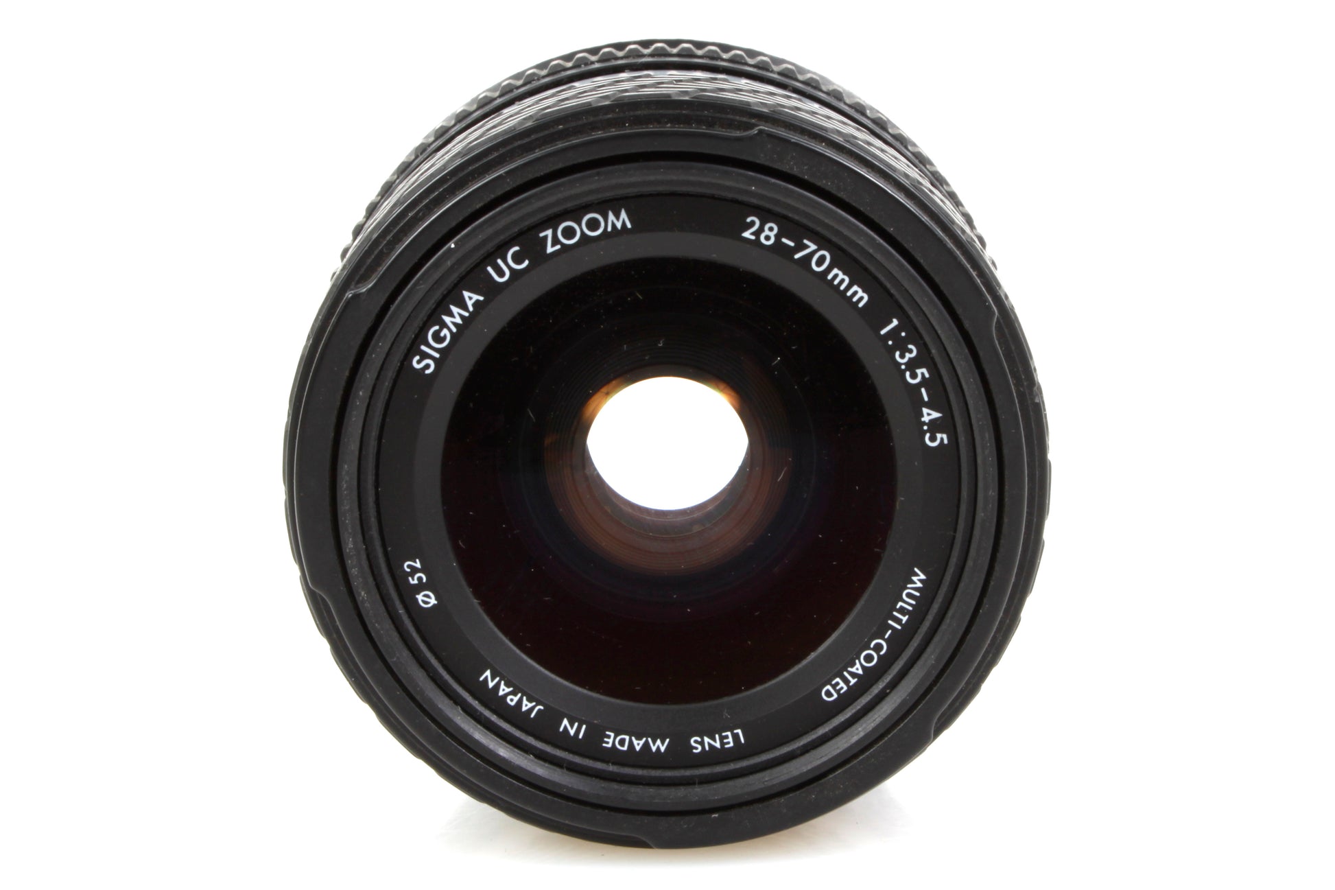 Sigma UC Zoom 28-70mm 1:3.5-4.5 lens for Pentax K1000. There is some dust and haze present to the lens but no fungus or scratches. The barrel is in good cosmetic condition with some scratches and general signs of use. Aperture movement is fine. Comes with rear lens cap.