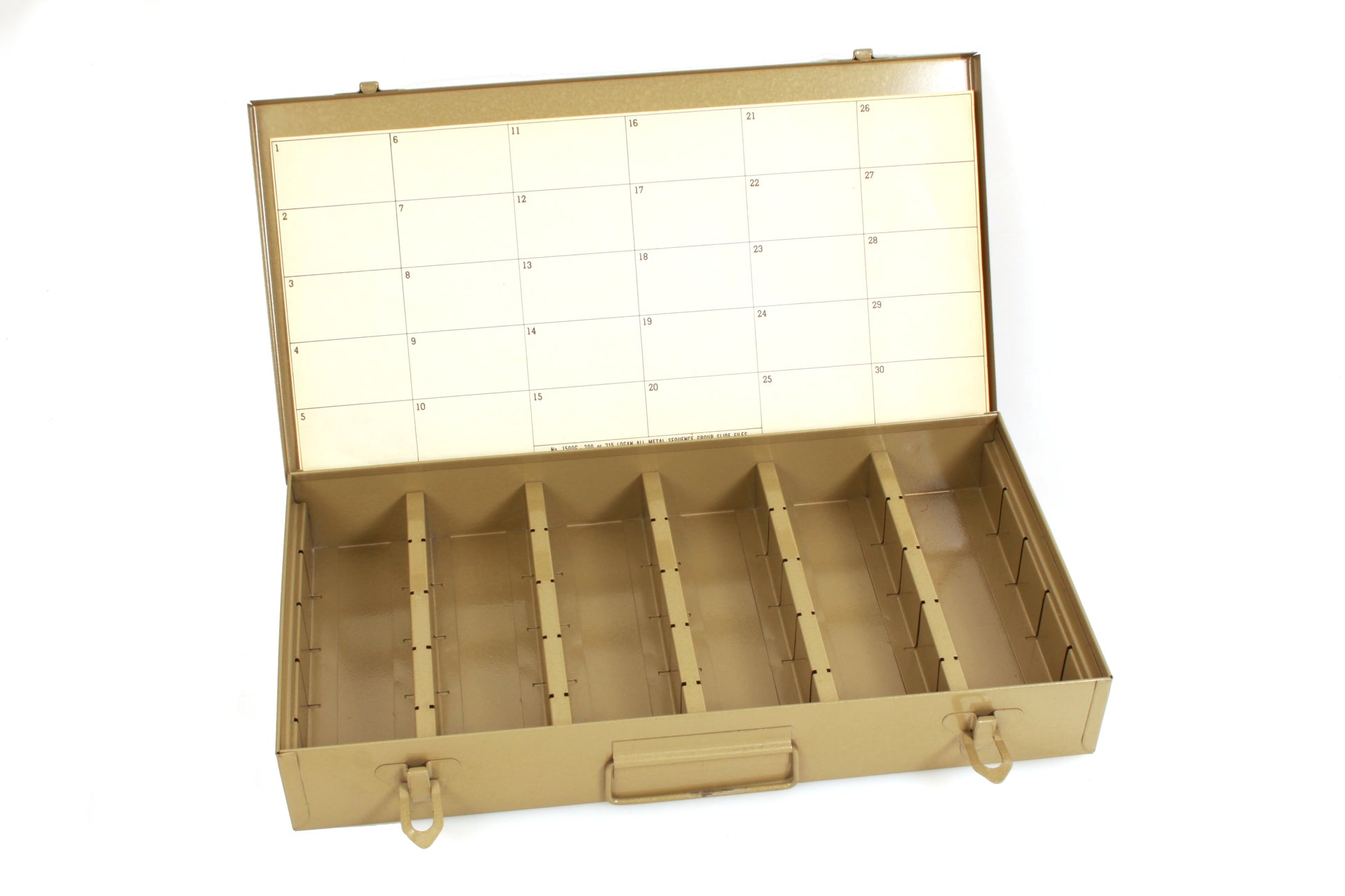 Metal slide storage case. Overall size approximately 14 5/8 x 7 7/8 x 2 inches. In very good vintage condition. There is a small area to the handle where the finish has worn away.