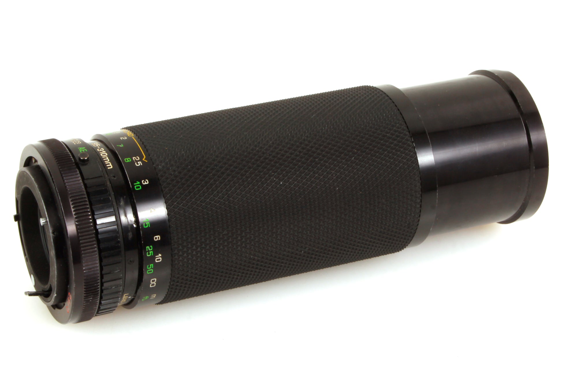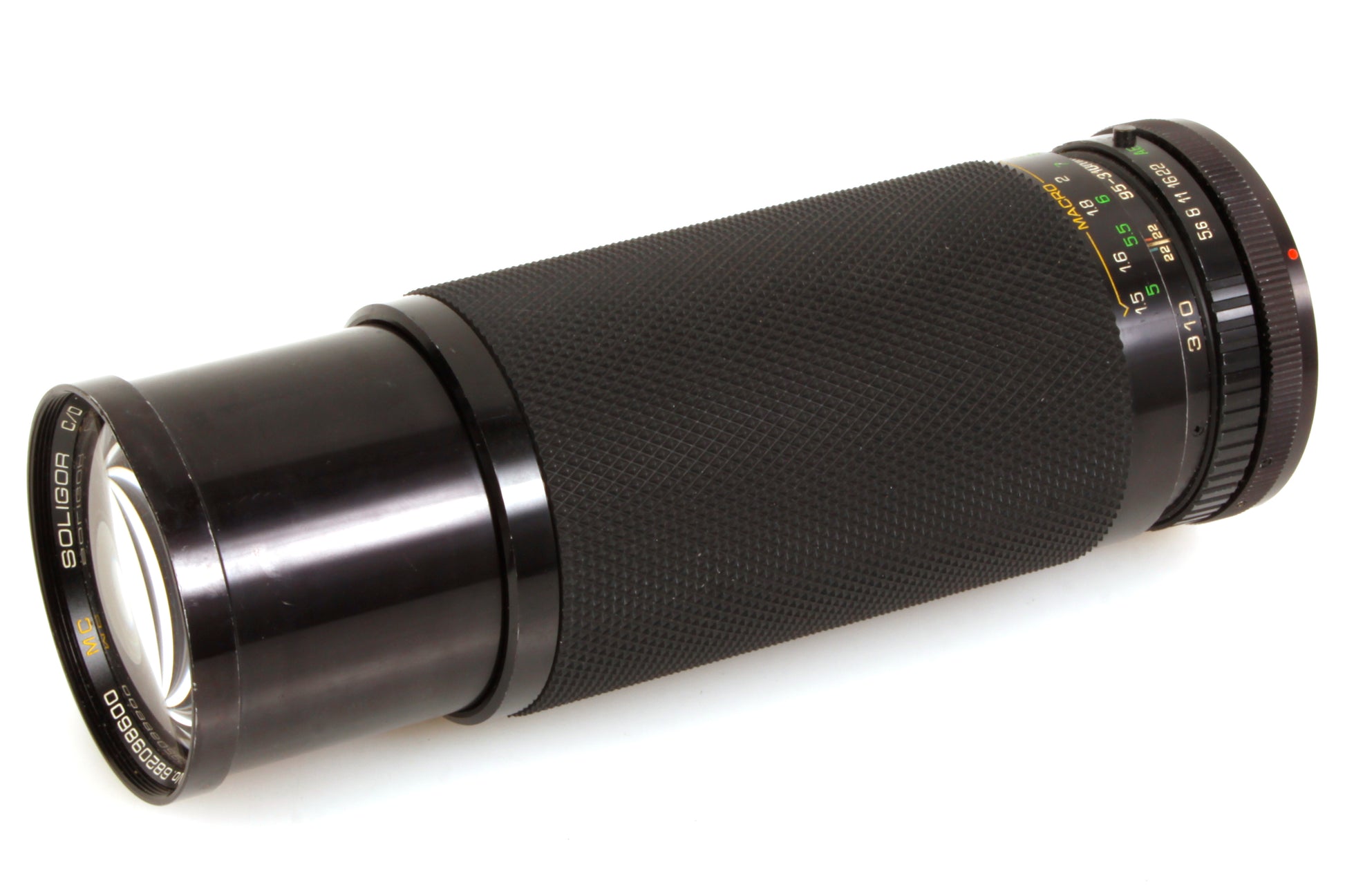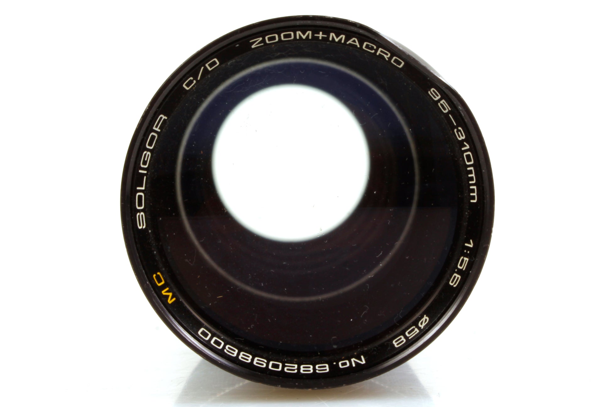 Soligor 95-310mm 1:5.6 lens. There is some dust and haze present to the lens but no fungus or scratches. Cosmetically it is in good vintage condition with some scratches and general signs of use. There is a dent to the rim. Does not come with lens caps.