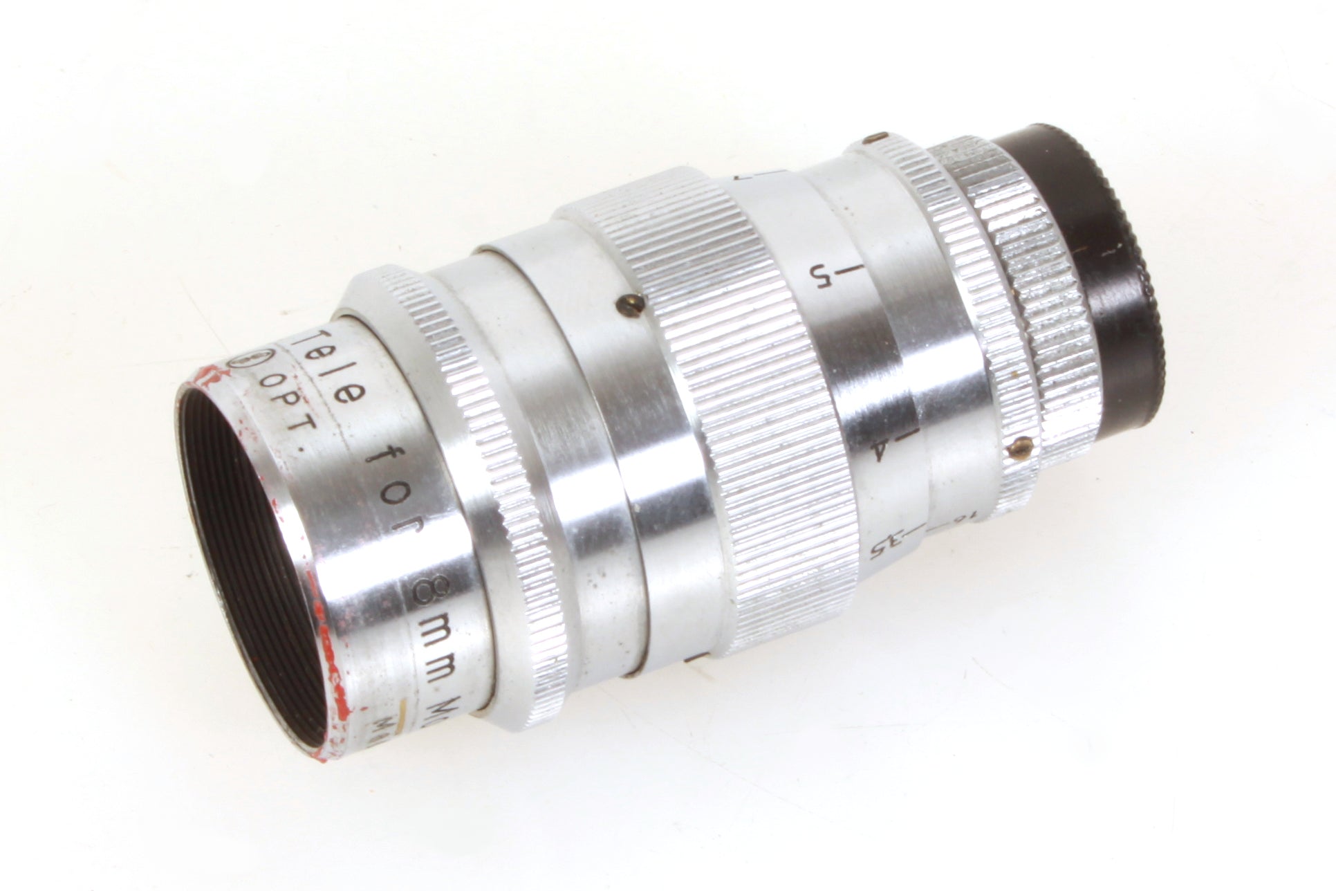 Sun Tele for 8mm Movie f:2.5 1 1/2" lens. There is some dust and haze present to the lens but no scratches. The barrel is in good cosmetic condition with some light scratches. The aperture blades move fine. Comes with original box and rear lens cap.
