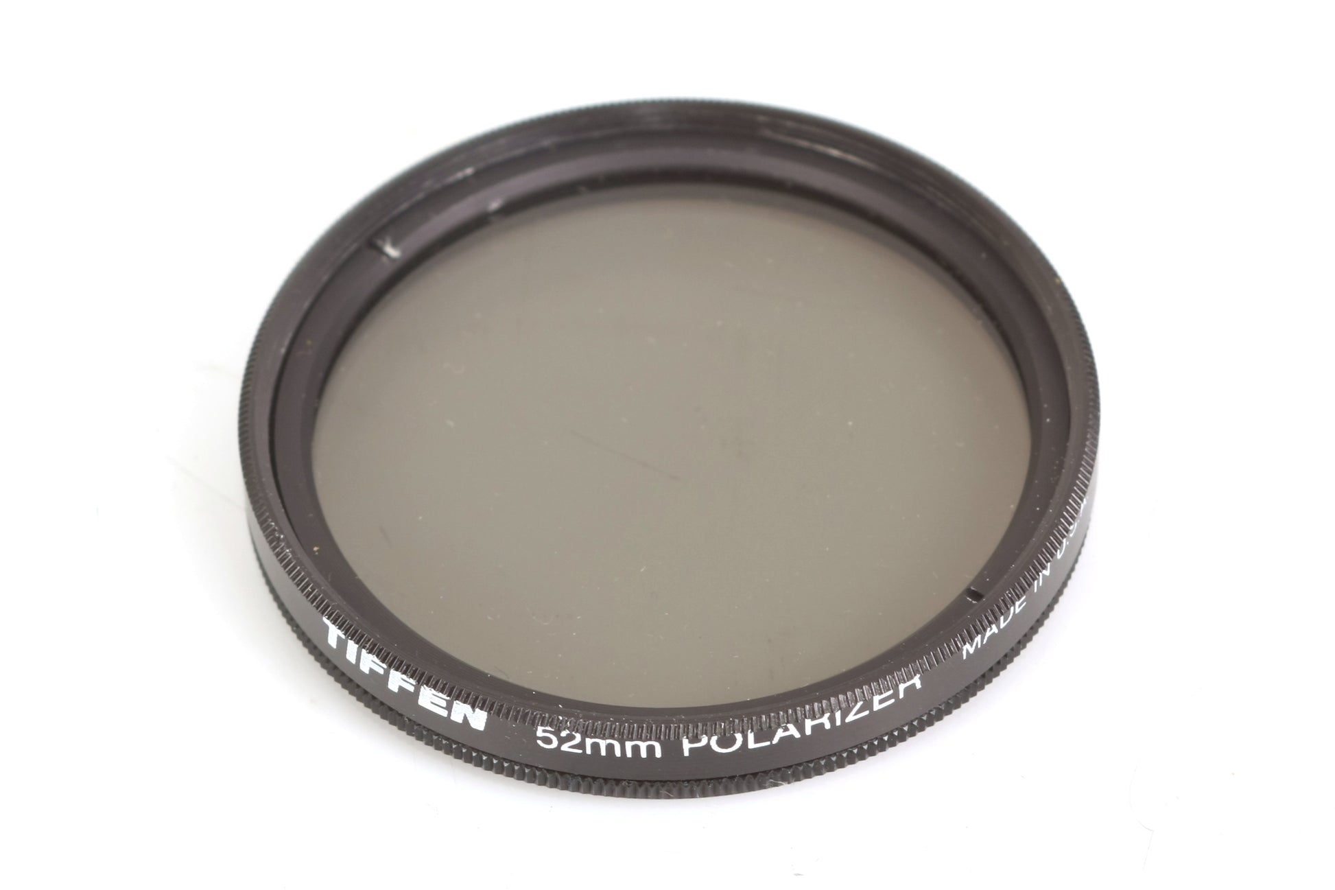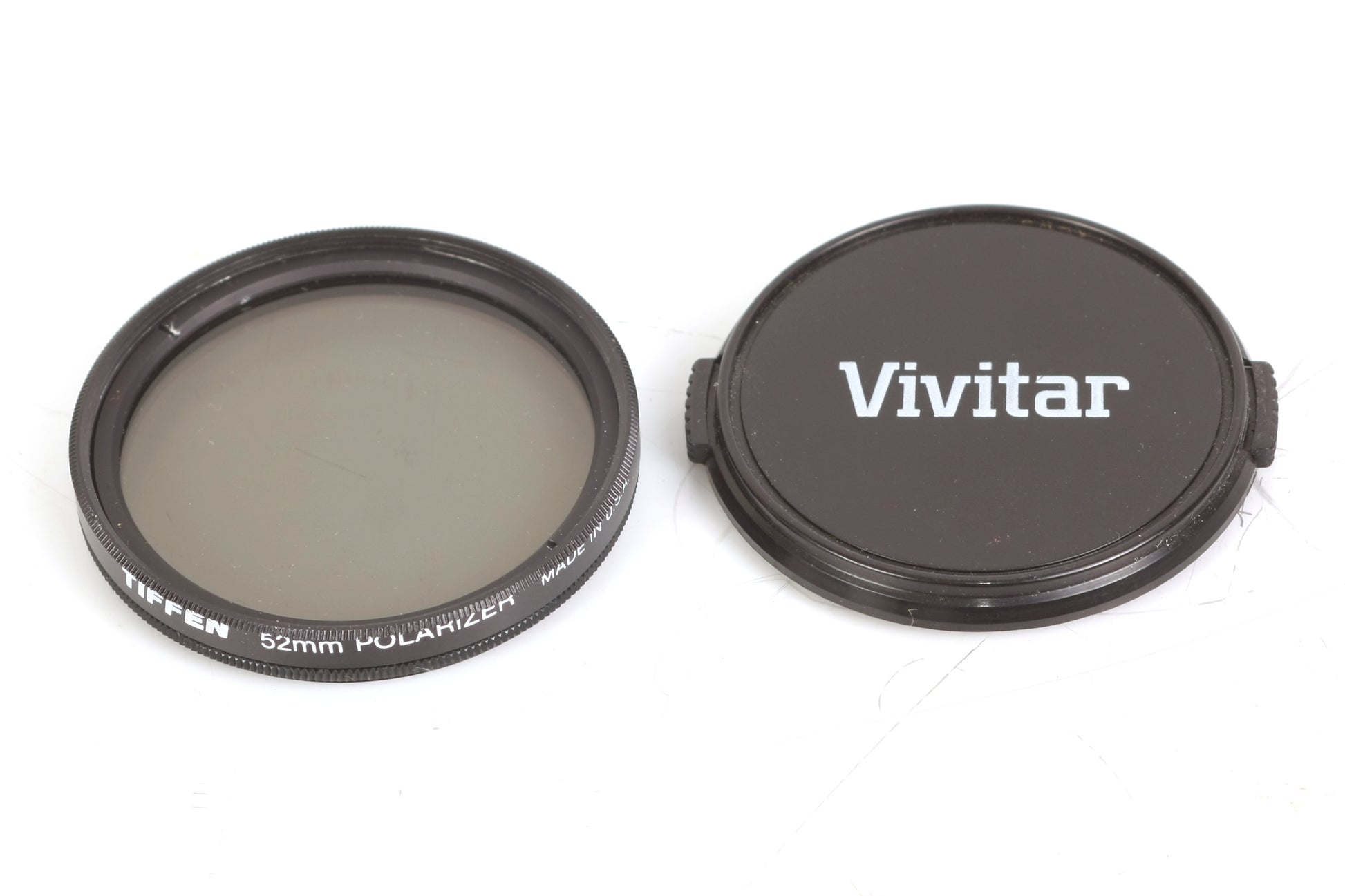 TIFFEN 52MM POLARIZER FILTER PLUS VIVITAR 52MM BLACK PLASTIC CAP. IN VERY GOOD USED CONDITION. SOME LIGHT GENERAL SIGNS OF USE.