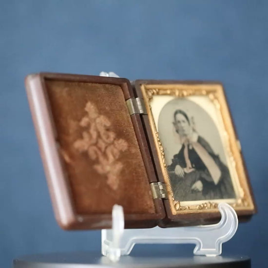 Vintage tintype photo of a lady with long pink bowtie in Union case — antique 19th‑century portrait, original ferrotype, collectible case image.