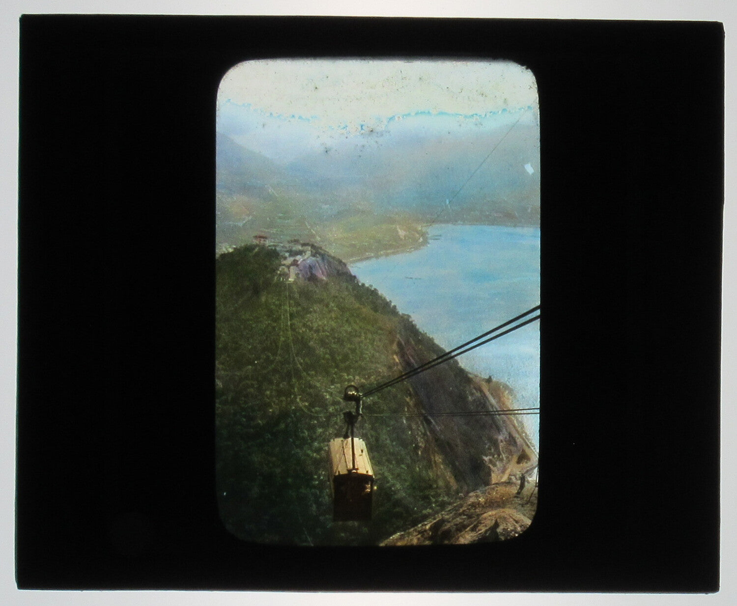 TOP OF SUGARLOAF ON CABLE CAR, RIO DE JANEIRO, BRAZIL.TINTED PHOTO ON GLASS.