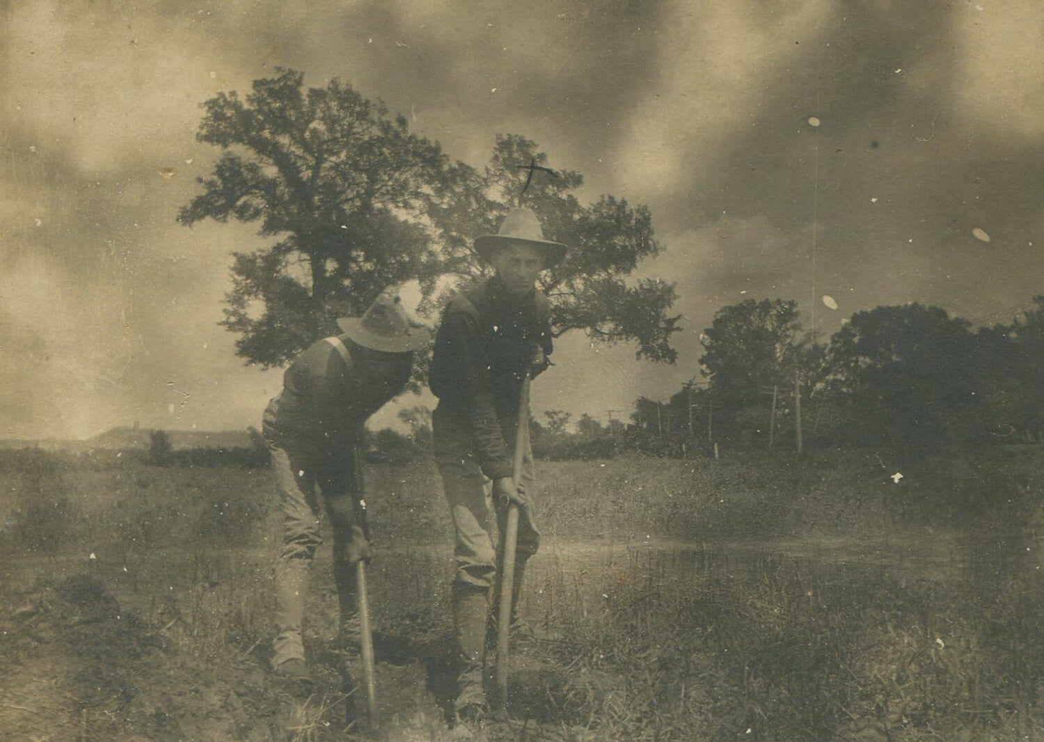 TWO MEN IN U.S. MILITARY UNIFORM DIGGING IN A FIELD. 3.75X4.75 TONED B&W.