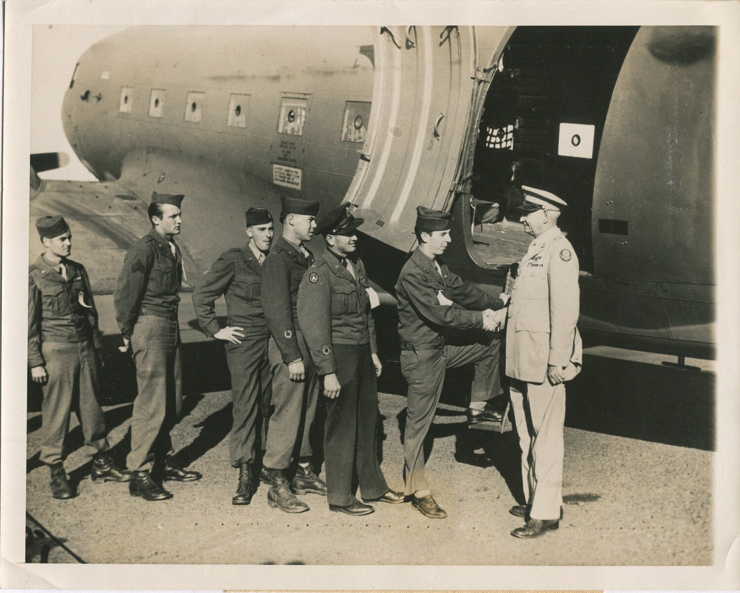 U.S. GEN. CLARENCE KANE SHAKES HANDS W/SOLDIERS. WWII (8X10 REPRINT)