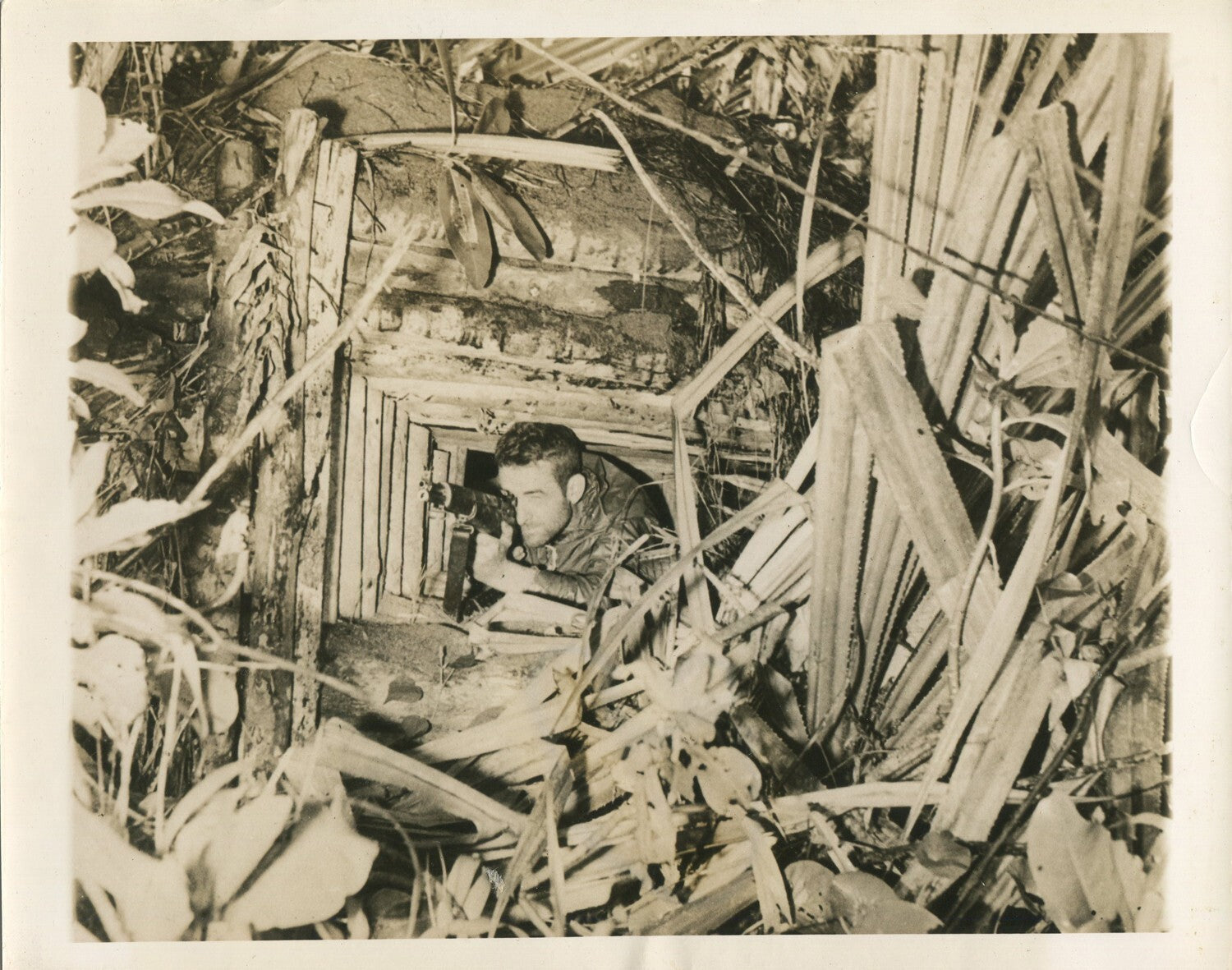 U.S.SOLDIER IN CAPTURED JAPANESE MACHINE GUN NEST. NEW GUINEA WWII(8X10 REPRINT)