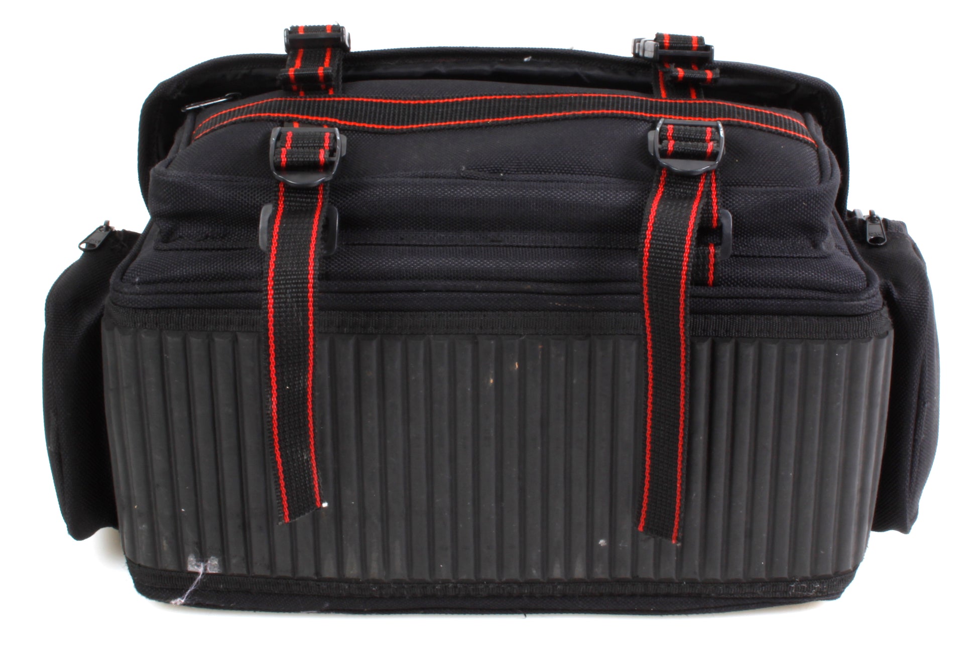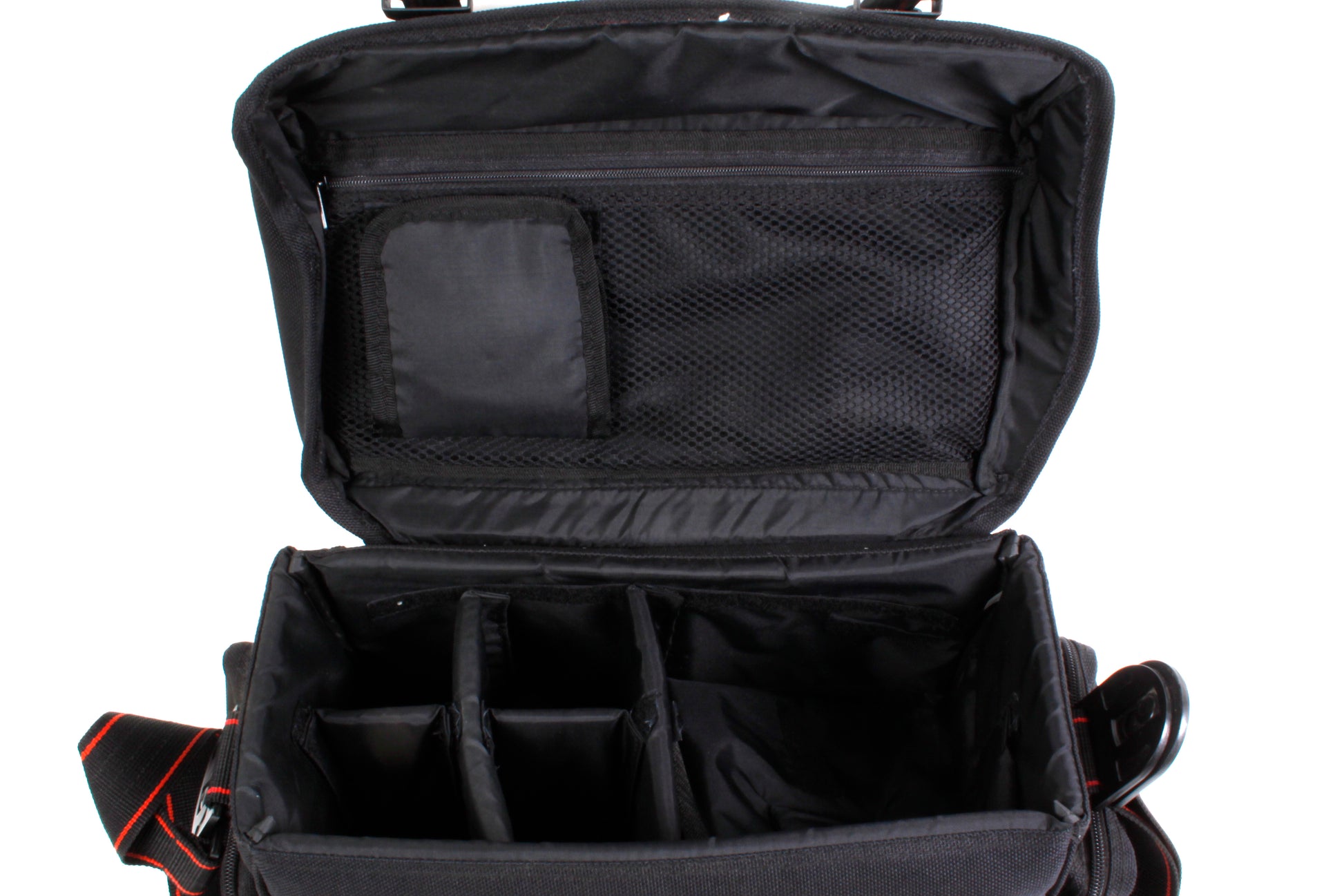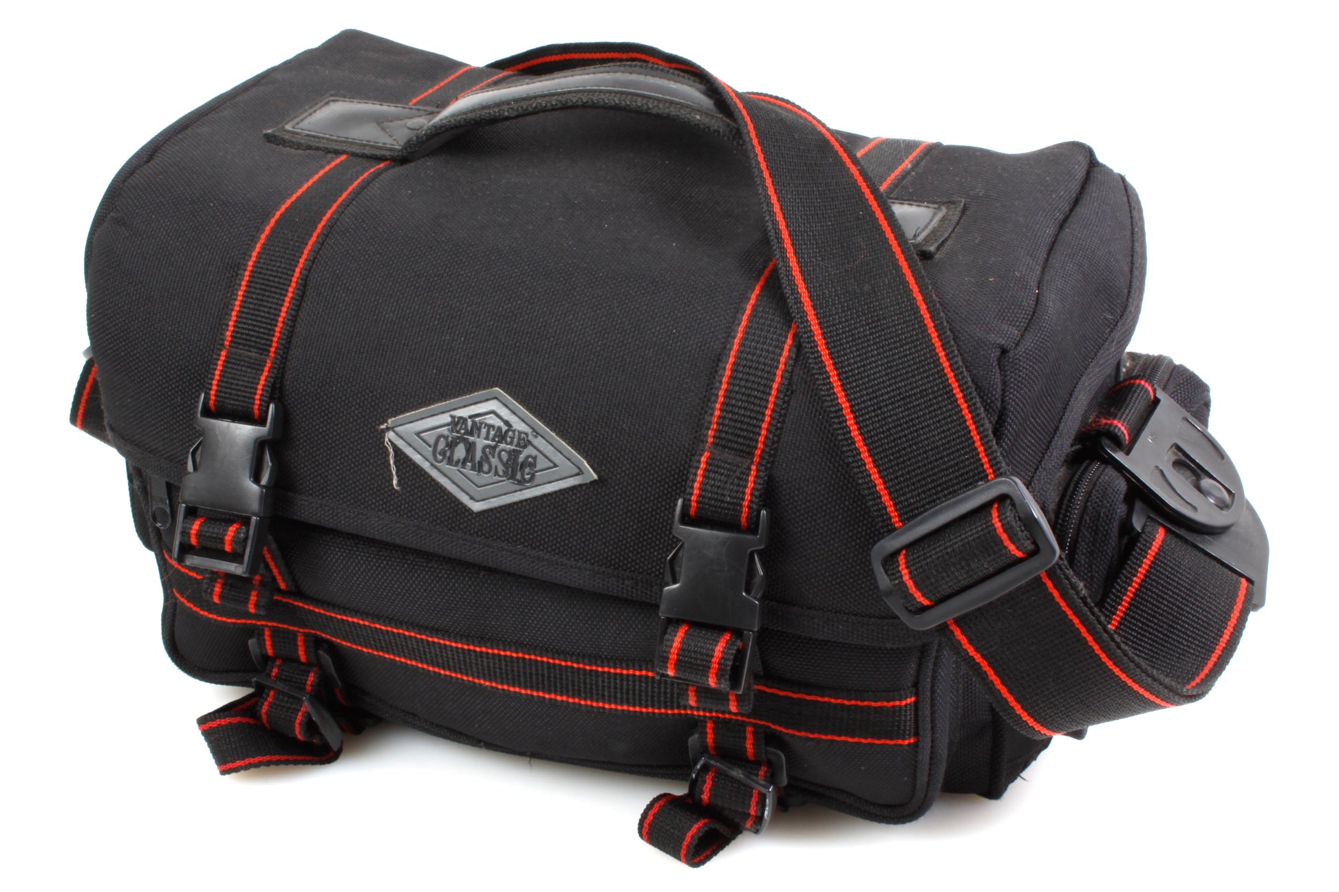 Vantage Classic black and red camera bag with shoulder strap. Main compartment interior measures approximately 13 x 7 x 5.5 inches. Exterior measures approximately 16 x 9 x 8.5 inches. In good vintage condition with some general signs of use.