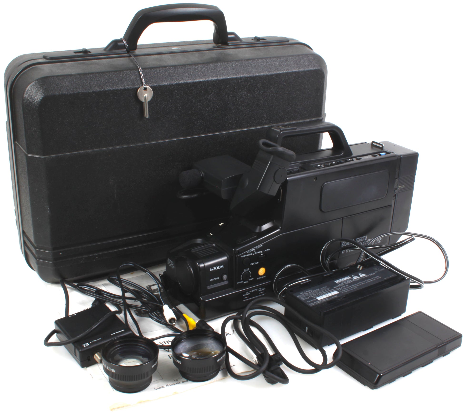 Good external condition! It powers on but makes humming noise and wont record to tape. This VHS camera is for parts or display. Comes with 2 batteries, charger, 2 spare lenses, manual, cords and case.