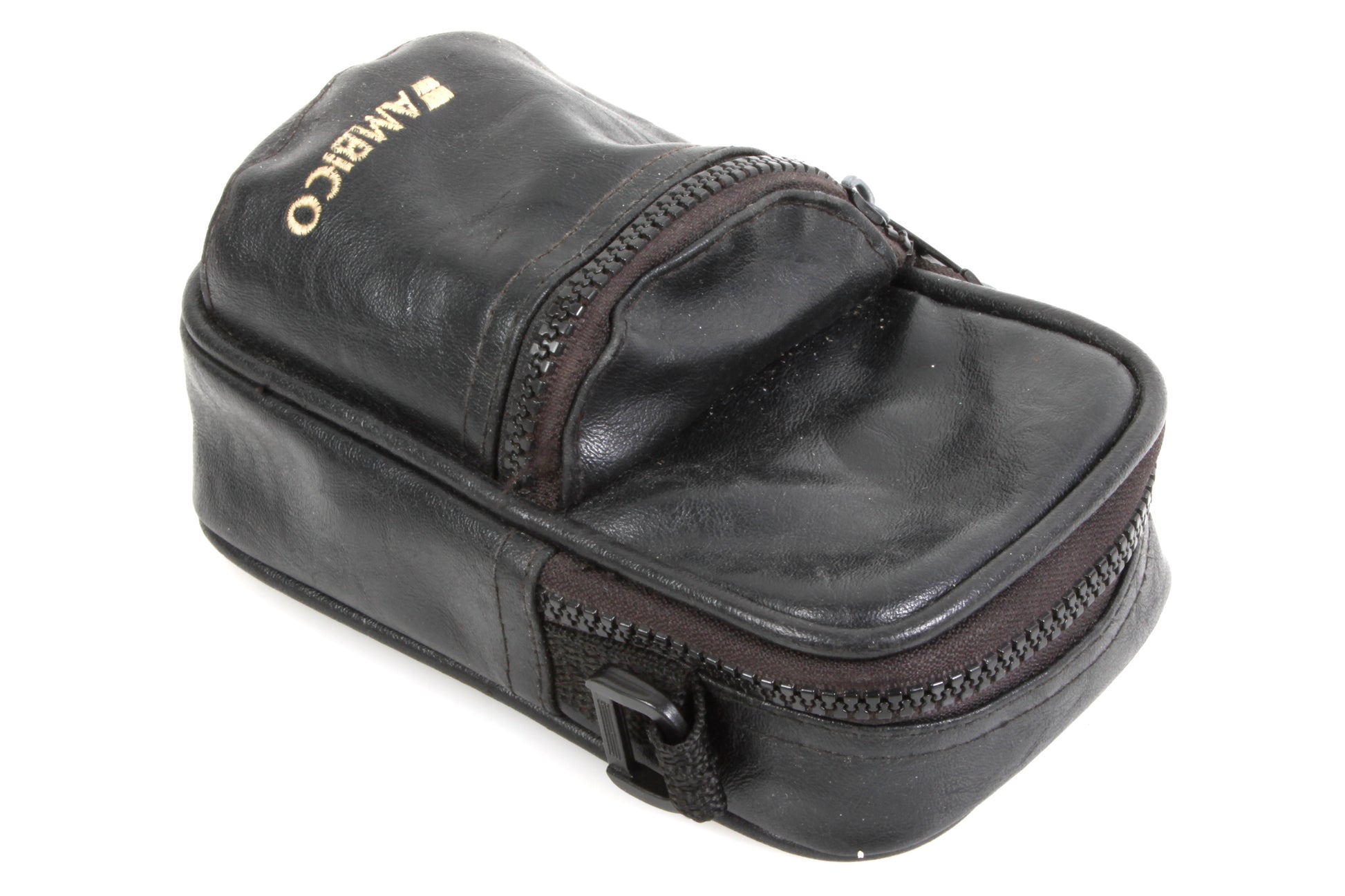 Ambico black leather camera case. Exterior measurements approximately 6 1/2 x 4 x 3 inches. The main compartment interior measures approximately 6 x 3 1/2 x 1 1/2 inches. Comes with detachable shoulder strap. In good vintage condition with some general signs of age and use.