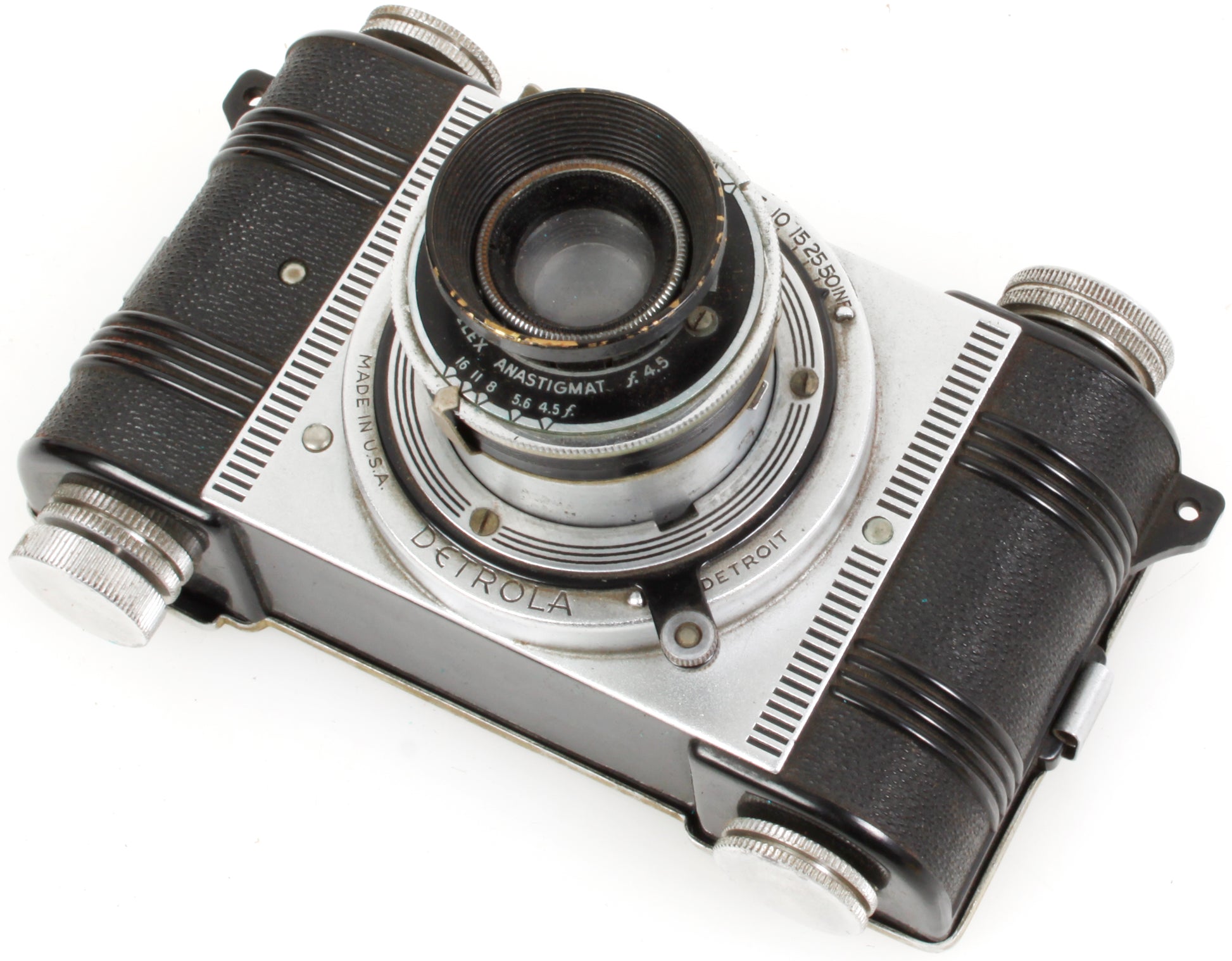 Good condition. Tested! Front glass is free of scratches and blemishes but shows haziness from age. This is a Vintage Art Deco Detrola Film Camera w/ Orig Lens Hood & Leather Case