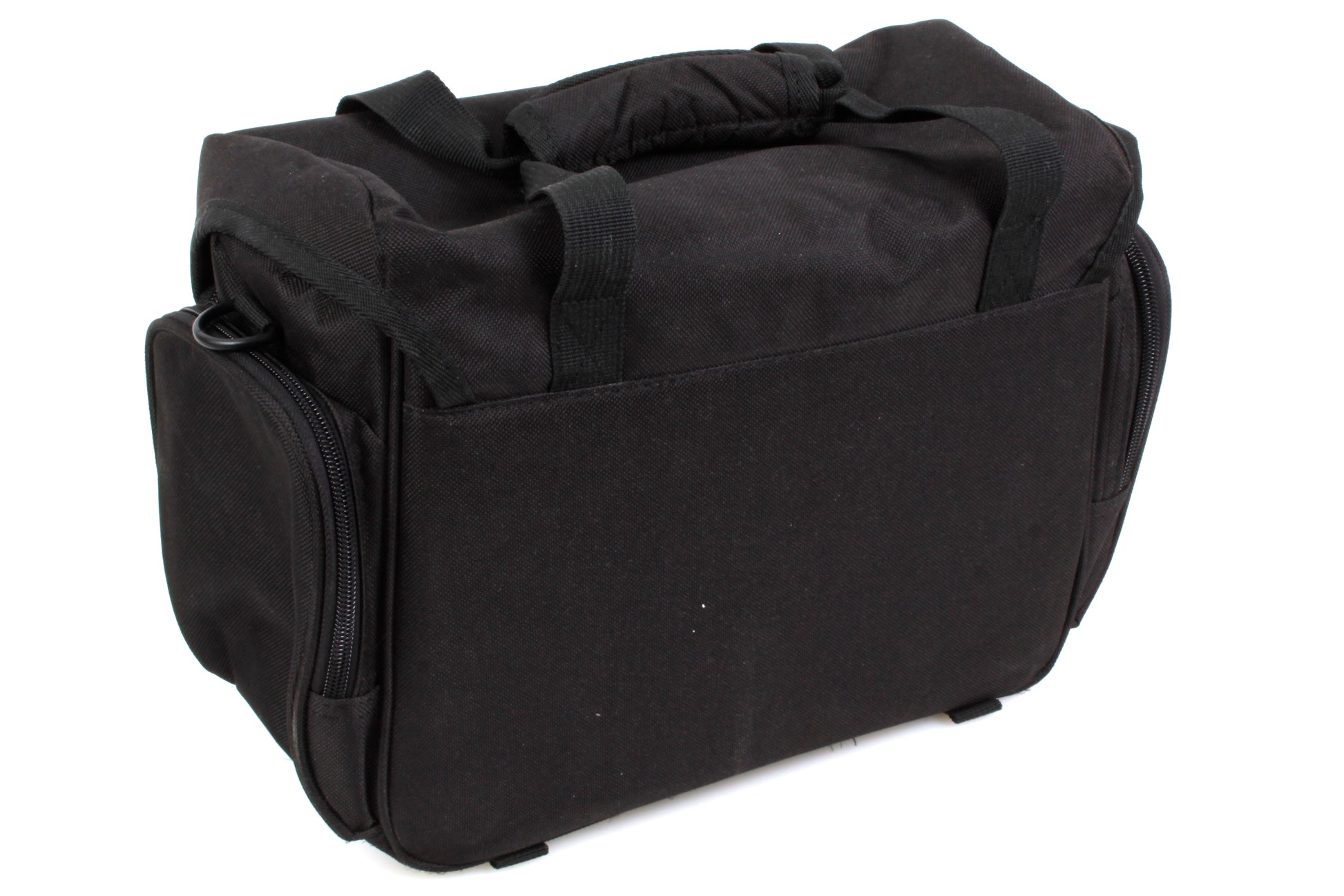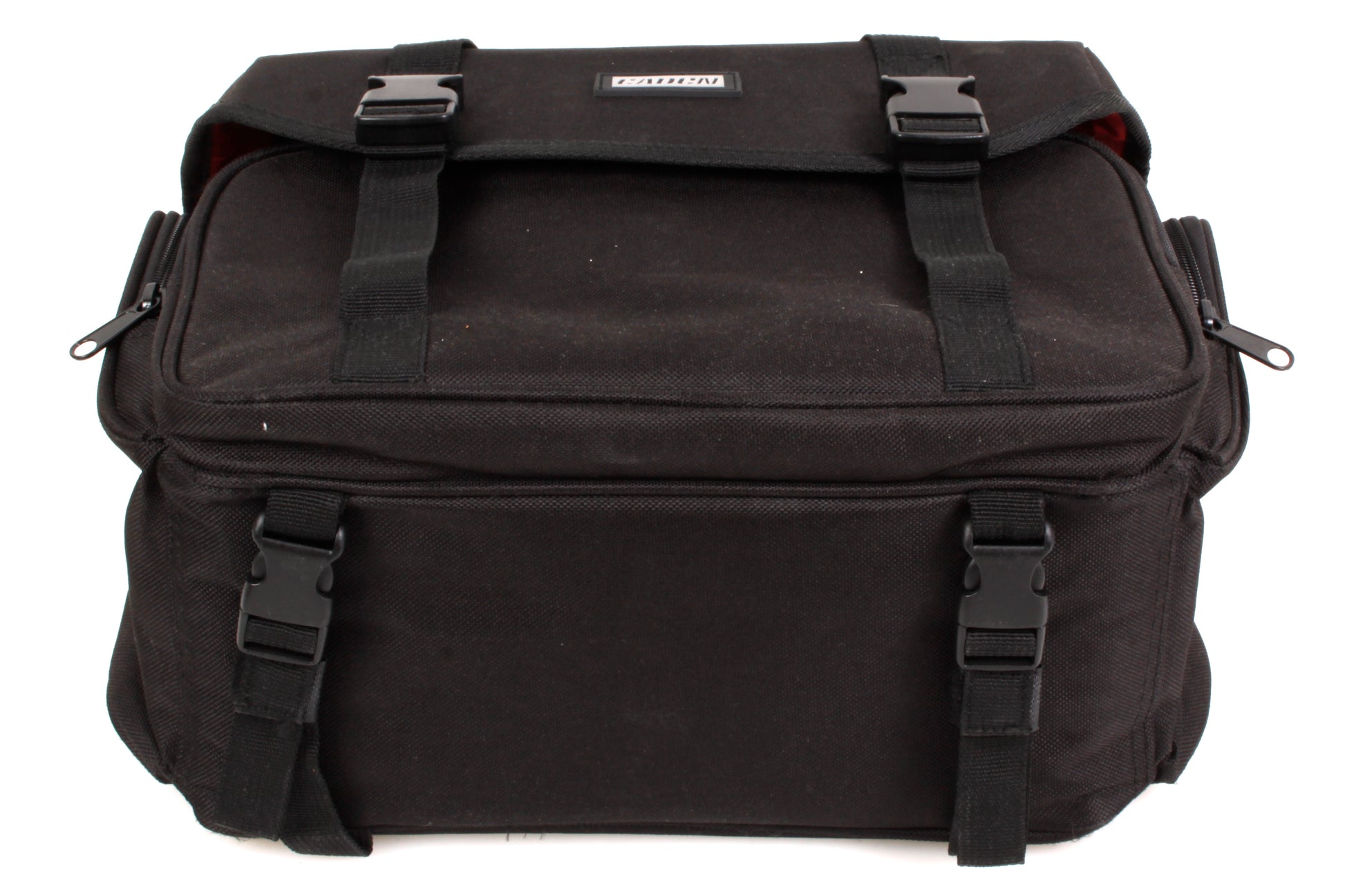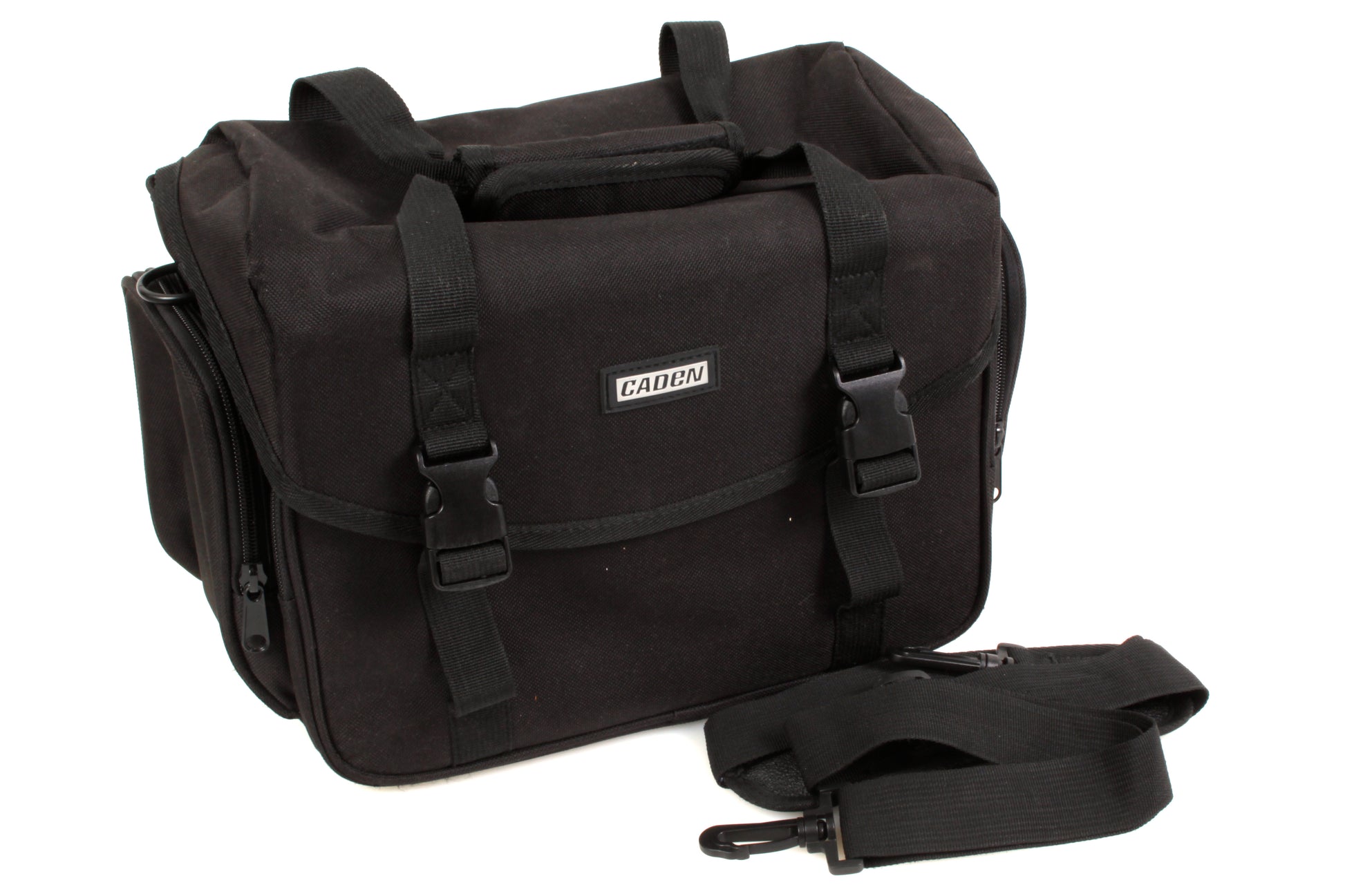 Caden black camera bag with detachable shoulder strap. The interior is red and has removable dividers. Exterior measurements approximately 13 x 9 x 6 inches. Interior measurements approximately 10.5 x 8 x 4.5 inches. In very good vintage condition with only light signs of use.