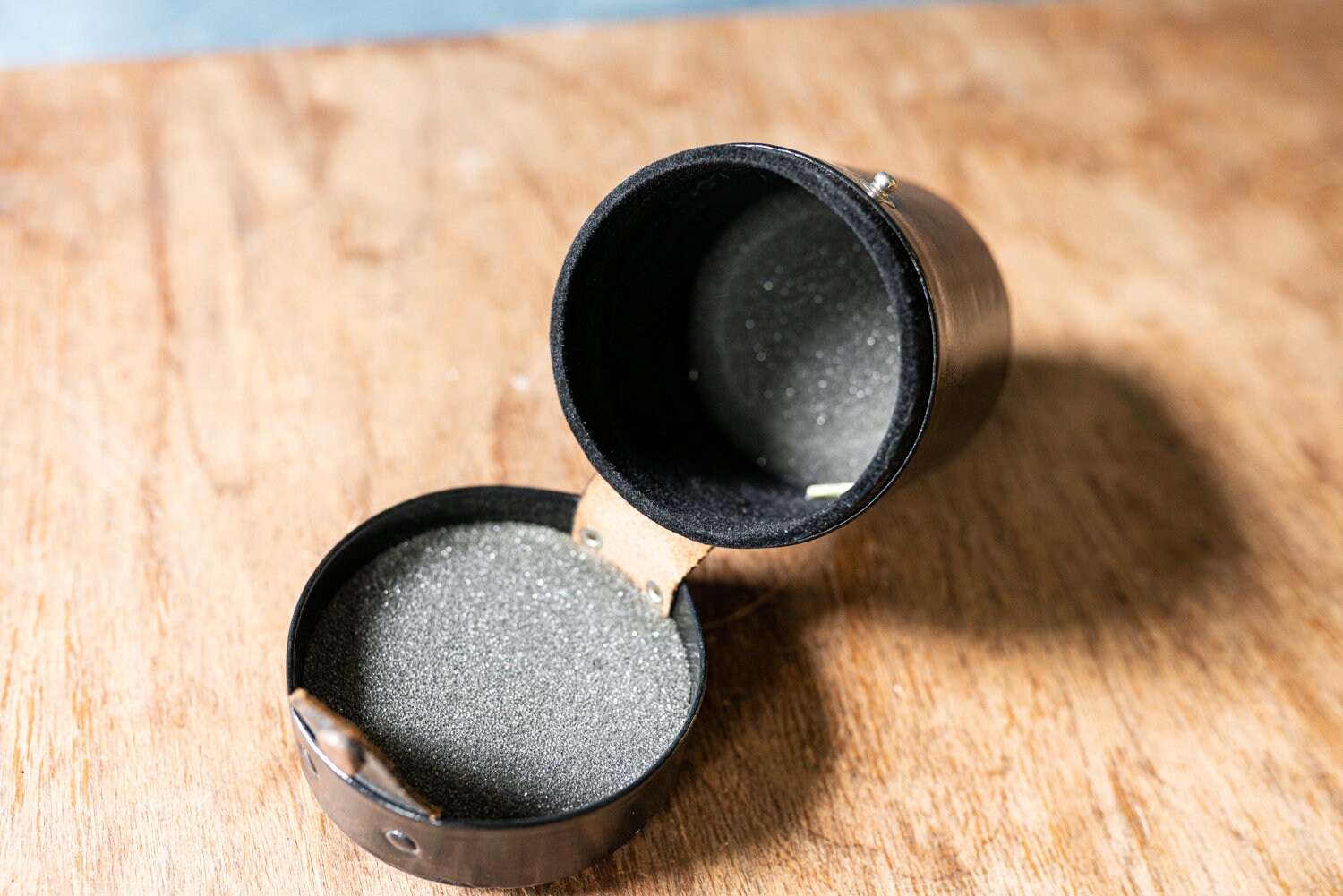 Vintage Black Canon Lens Case - Approximately 2 1/2" x 2 7/8" x 2 7/8" Internally. The snap button that secures the case is broken. The leatherette on the top of the case is peeling off. The foam inside of the case appears to be drying out.