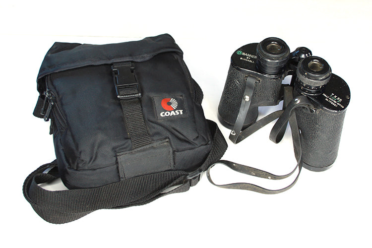 BANNER BY BUSHNELL BINOCULARS. 7X35 FIELD 8 DEGREES. THERE IS SOME DUST AND FUNGUS PRESENT INSIDE THE LENSES BUT NO HAZE OR SCRATCHES. SOME WEAR AND SCRATCHES TO THE BODY. COMES WITH STRAP AND COAST CASE. CASE MEASURES APPROXIMATELY 6 X 6 1/2 X 3 INCHES. THE CASE IS IN VERY GOOD USED CONDITION.