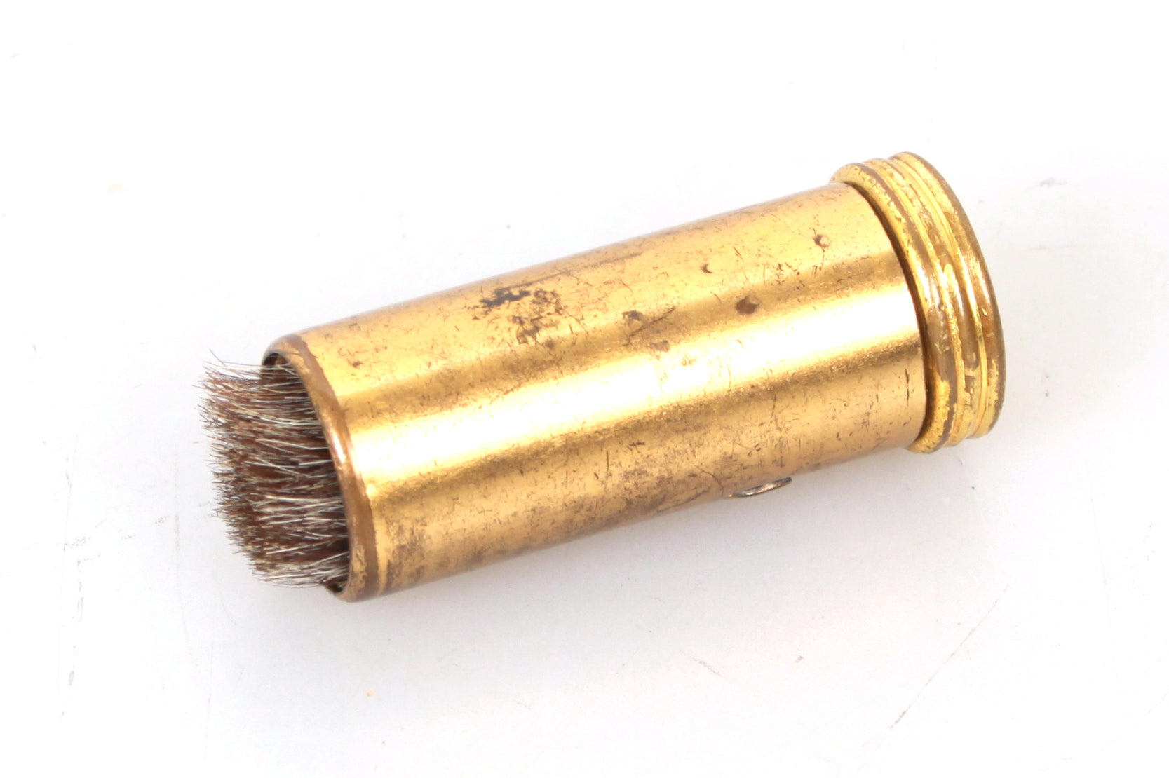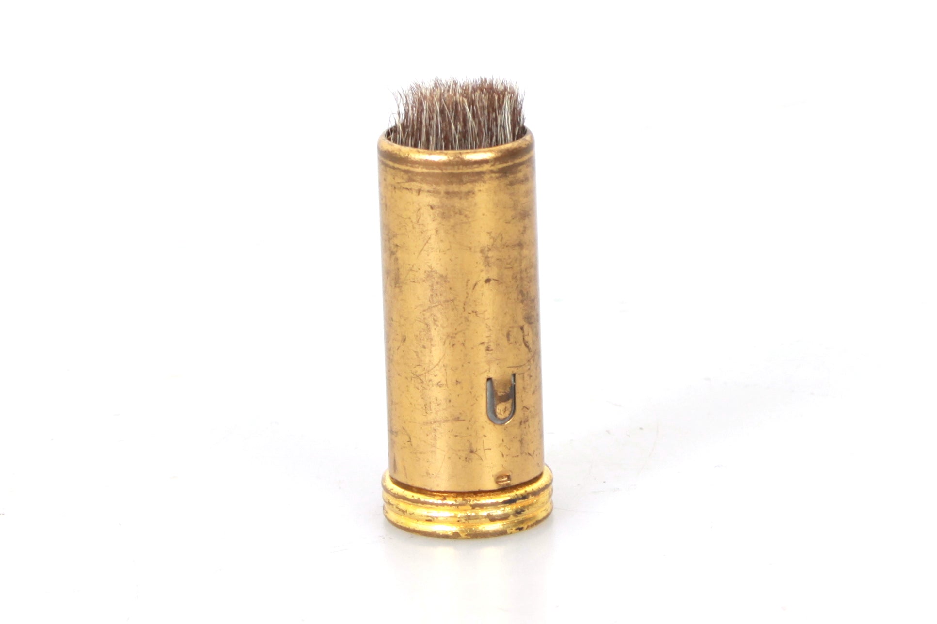 VINTAGE RETRACTABLE CAMEL HAIR CAMERA BRUSH. THE METAL CASE MEASURES APPROXIMATELY 11/16 INCH DIAMETER AND 1 9/16 INCHES TALL. IT IS MISSING THE LID. SOME MARKS AND SCRATCHES TO THE METAL, AND SOME OF THE HAIRS ARE BENT.