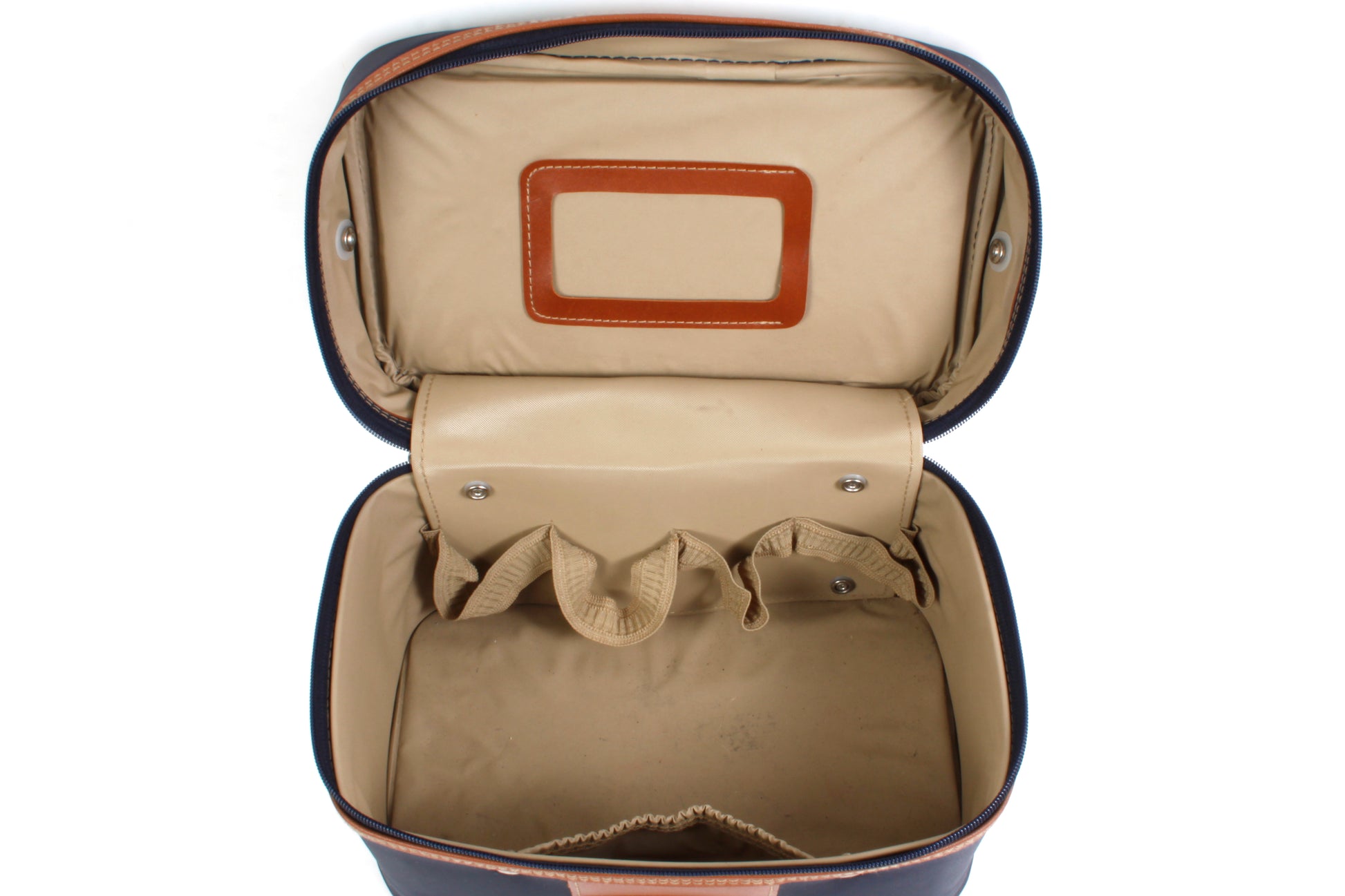 Vintage Jaguar blue and brown camera bag with top strap/handle. Exterior measurements approximately 12 1/2 x 7 3/4 x 8 inches. Interior measurements approximately 11 3/4 x 7 x 5 inches. In good vintage condition with some marks and general signs of use but no obvious major damage.