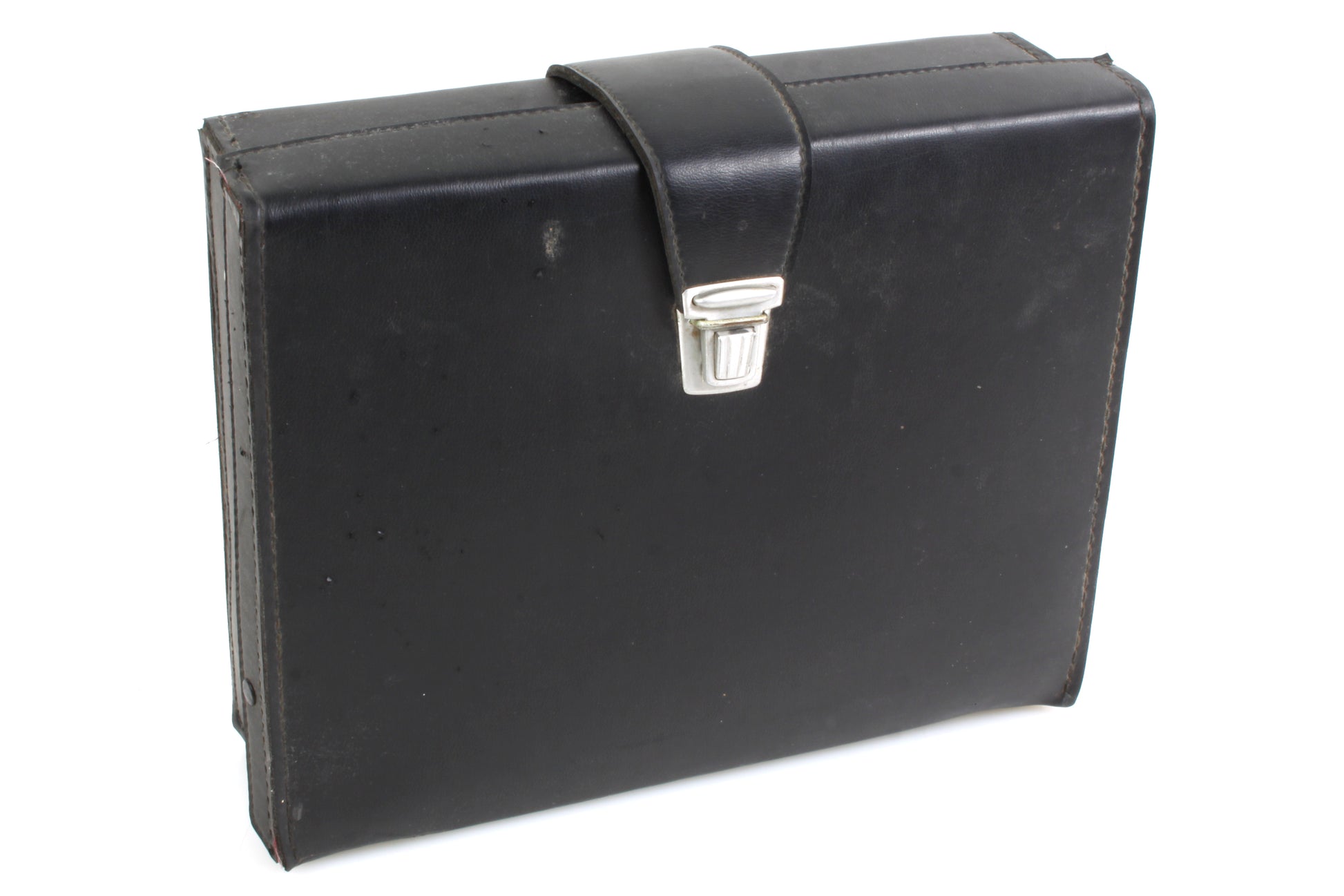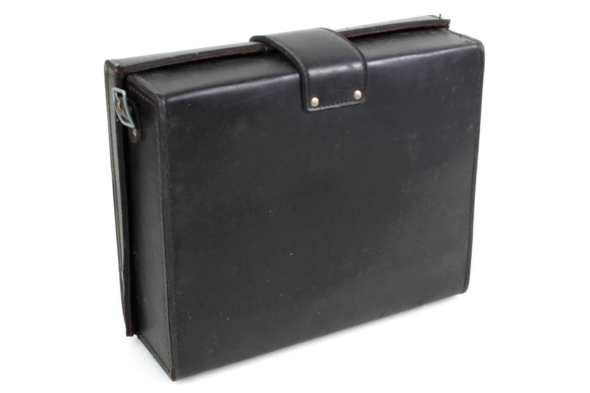 Vintage black camera case. Exterior measurements approximately 14 x 11 x 4 inches. Interior measurements approximately 13 inches wide, 3 1/2 inches high and the depth is split into two sections 7 3/4 and 2 1/8 inches. In good vintage condition with some general signs of age and use.