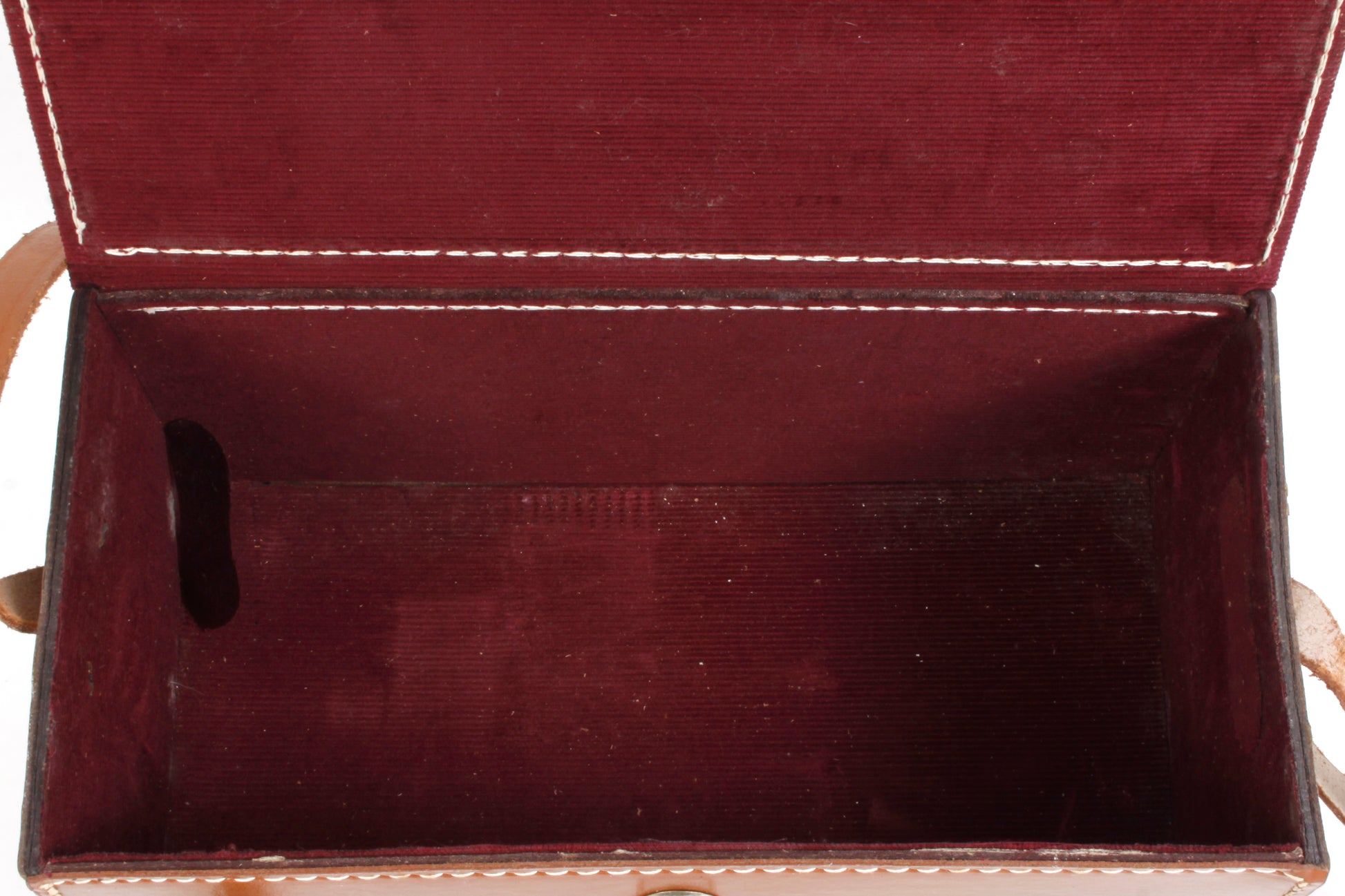 Wittnauer brown leather case with strap. Exterior measurements approximately 11 x 5 3/8 x 5 3/4 inches. Interior measurements approximately 10 5/8 x 4 7/8 x 5 inches. In good vintage condition with some scratches and general signs of use but no obvious major damage.