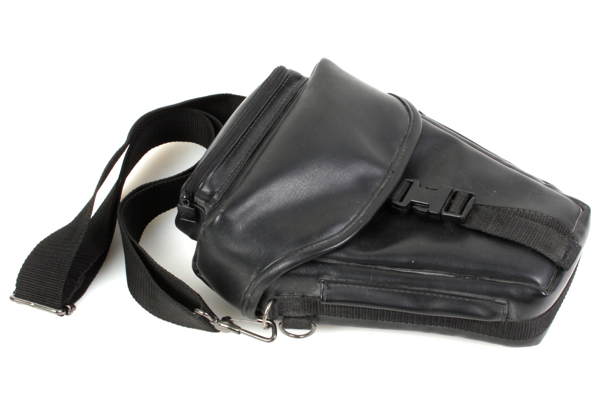 Coastar black camera bag with detachable shoulder strap. The interior is padded. Overall measurements approximately 10.5 x 7.5 x 4 inches. Interior measurements approximately 8 inches long x 6.5 inches wide at the top and 3 inches wide at the bottom x 2 inches deep. In good vintage condition with some marks and general signs of use.