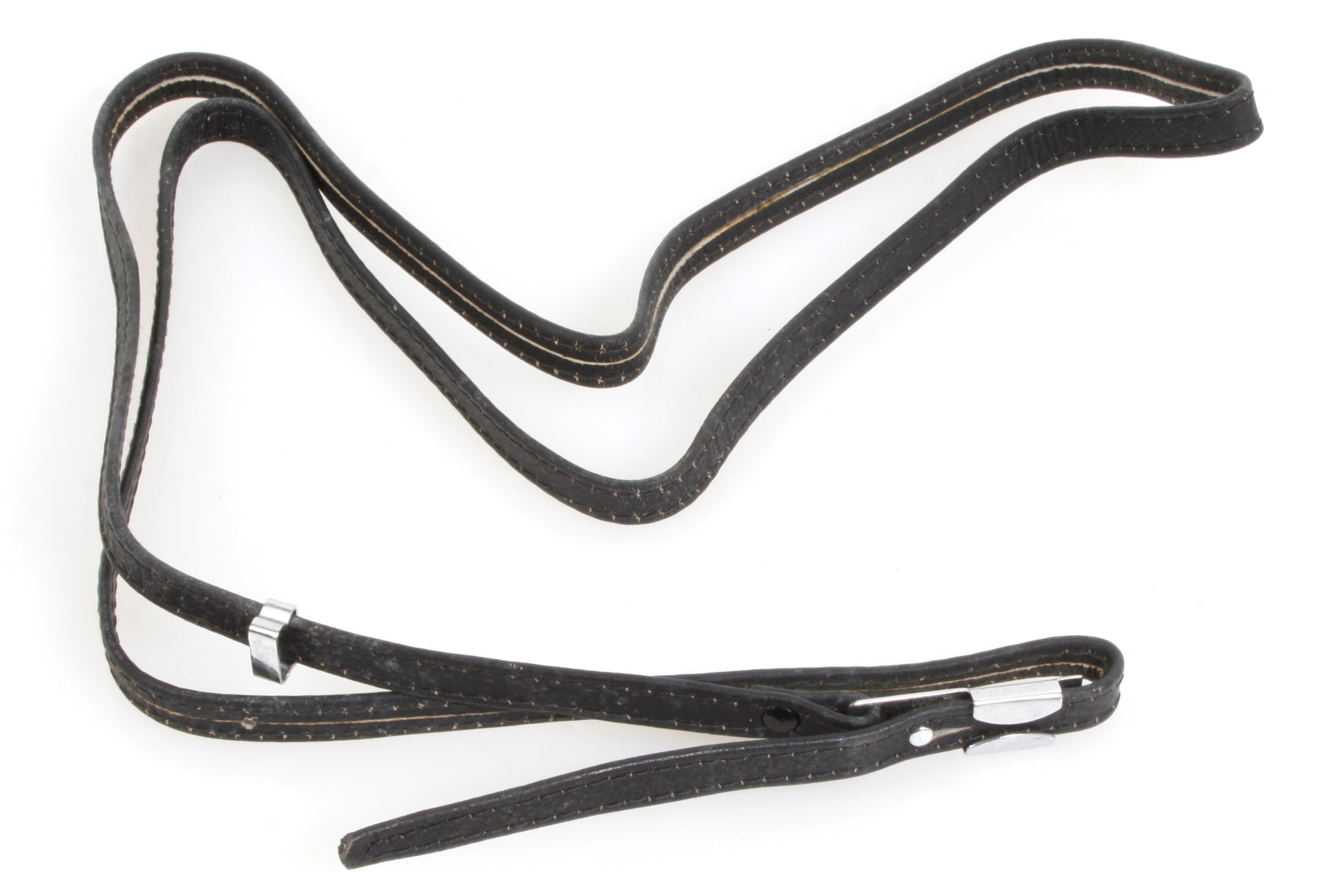 Black leather or leather-look camera strap. Measures approximately 3/8 inch wide and 53 inches long. In good vintage condition with some light wear and general signs of use.