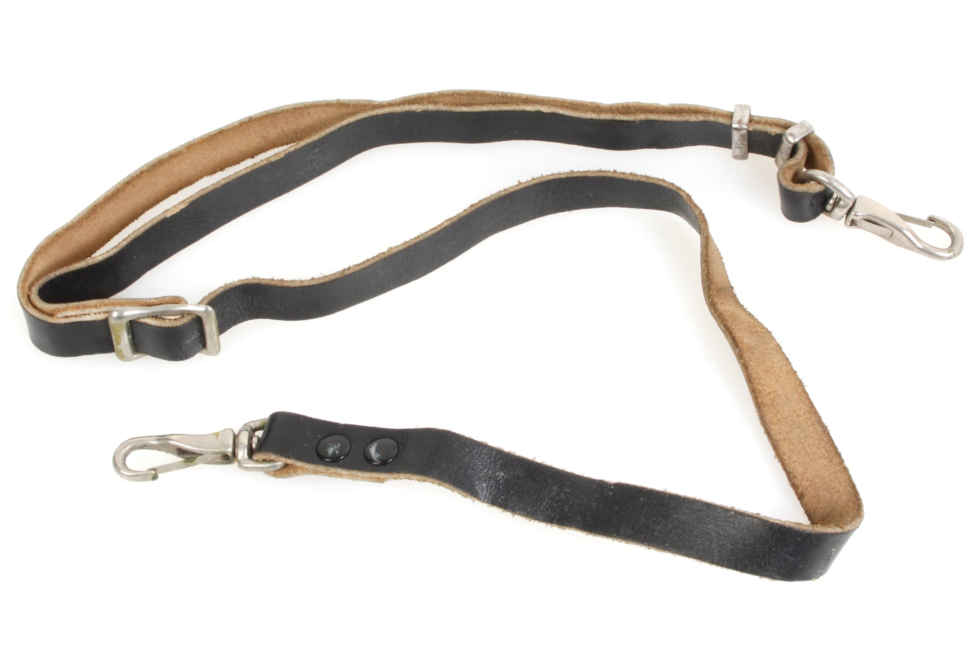 Vintage black leather camera strap with metal clips. Strap measures approximately 9/16 inch wide and 44 inches long (at its longest - length is adjustable). In good vintage condition with some marks and general signs of age and use.